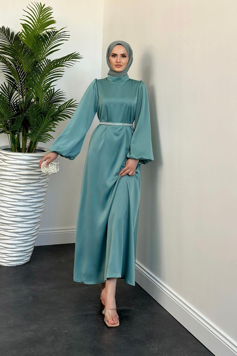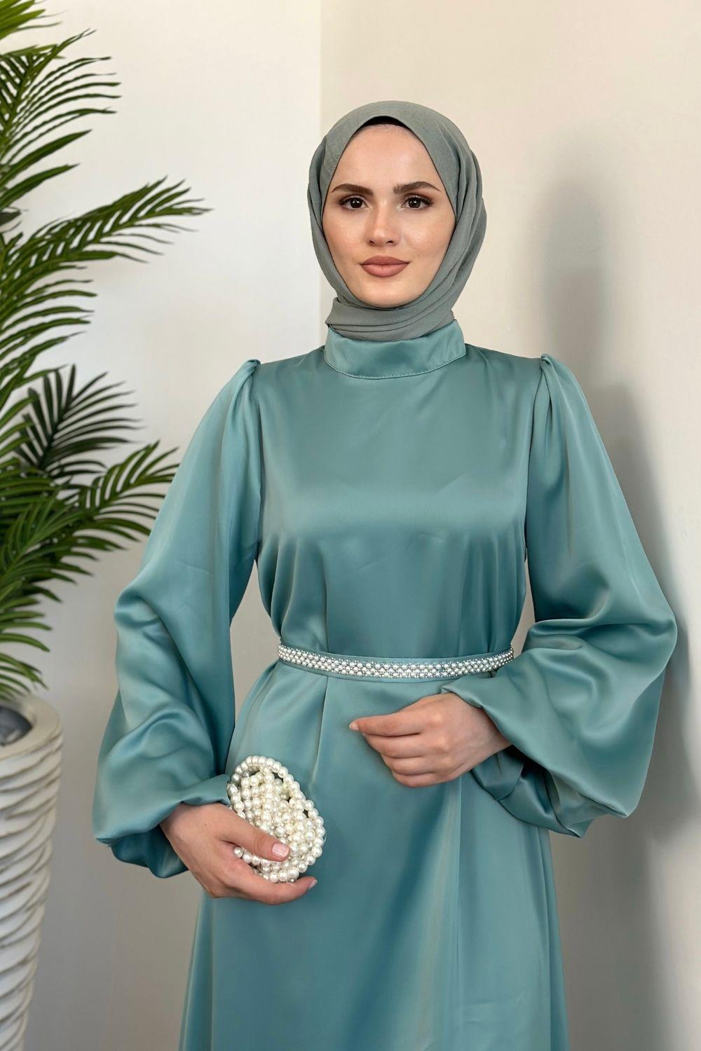 Nika Kemeri İncili Saten Abiye Su Yeşili
