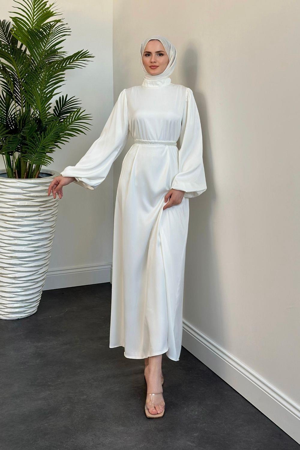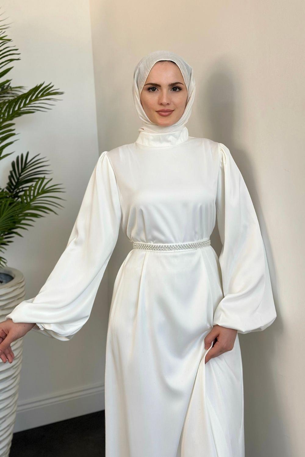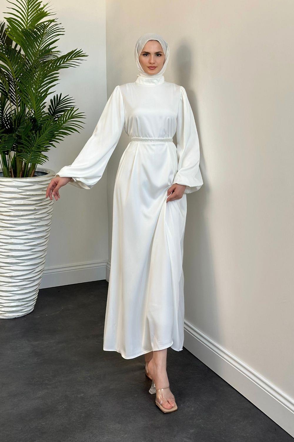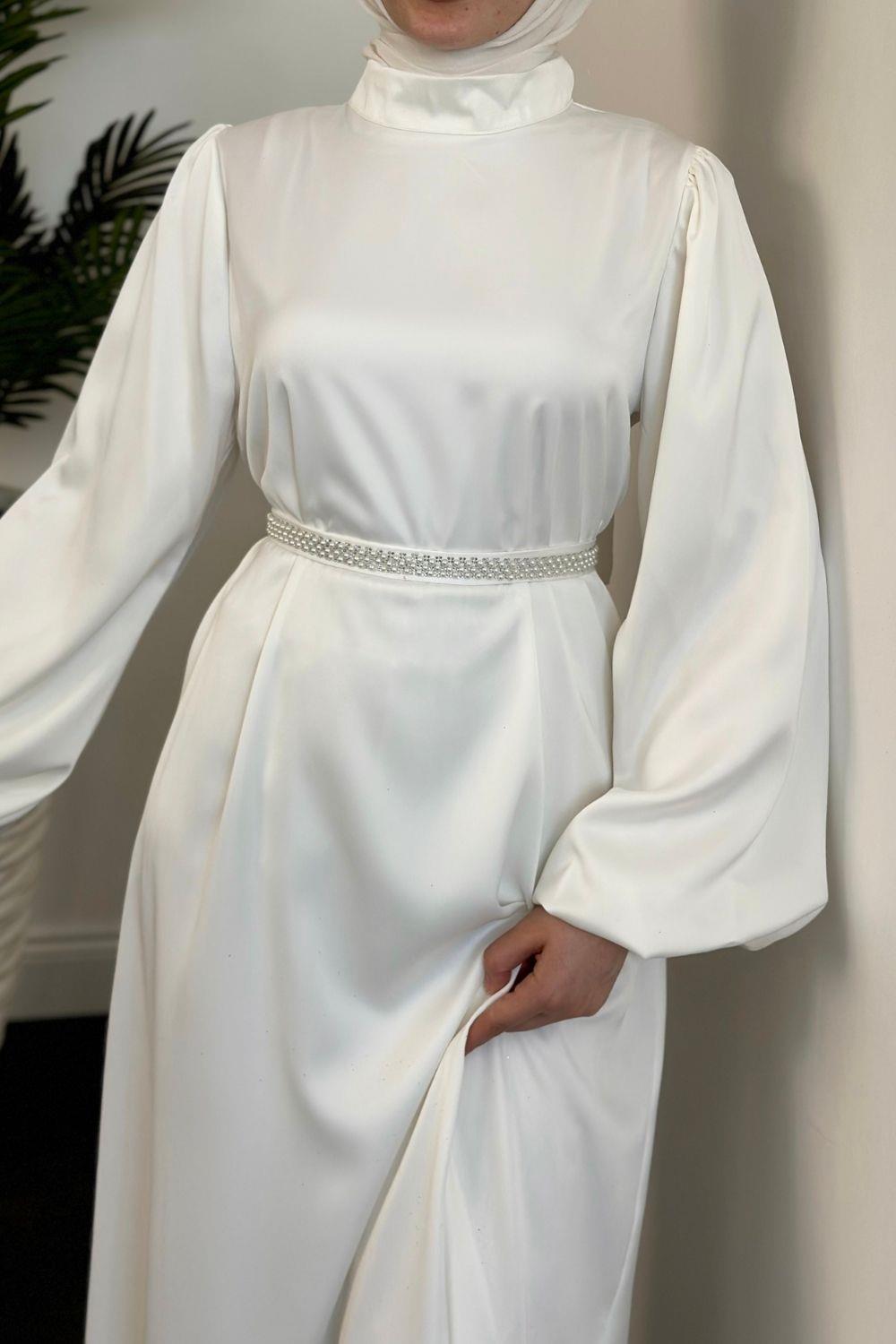 Nika Kemeri İncili Saten Abiye Beyaz