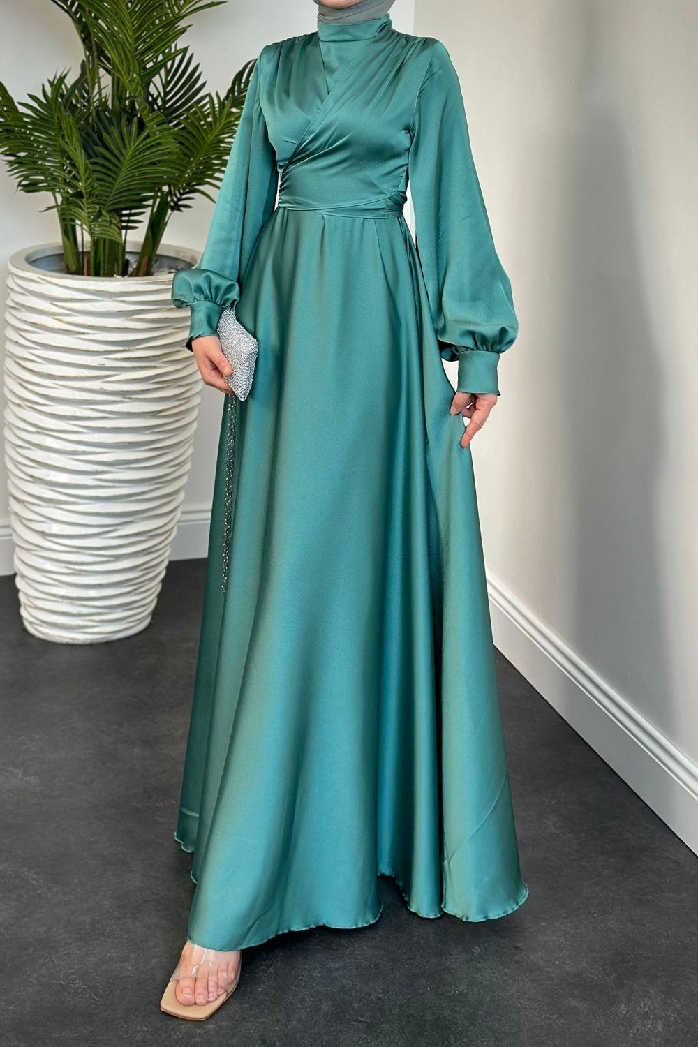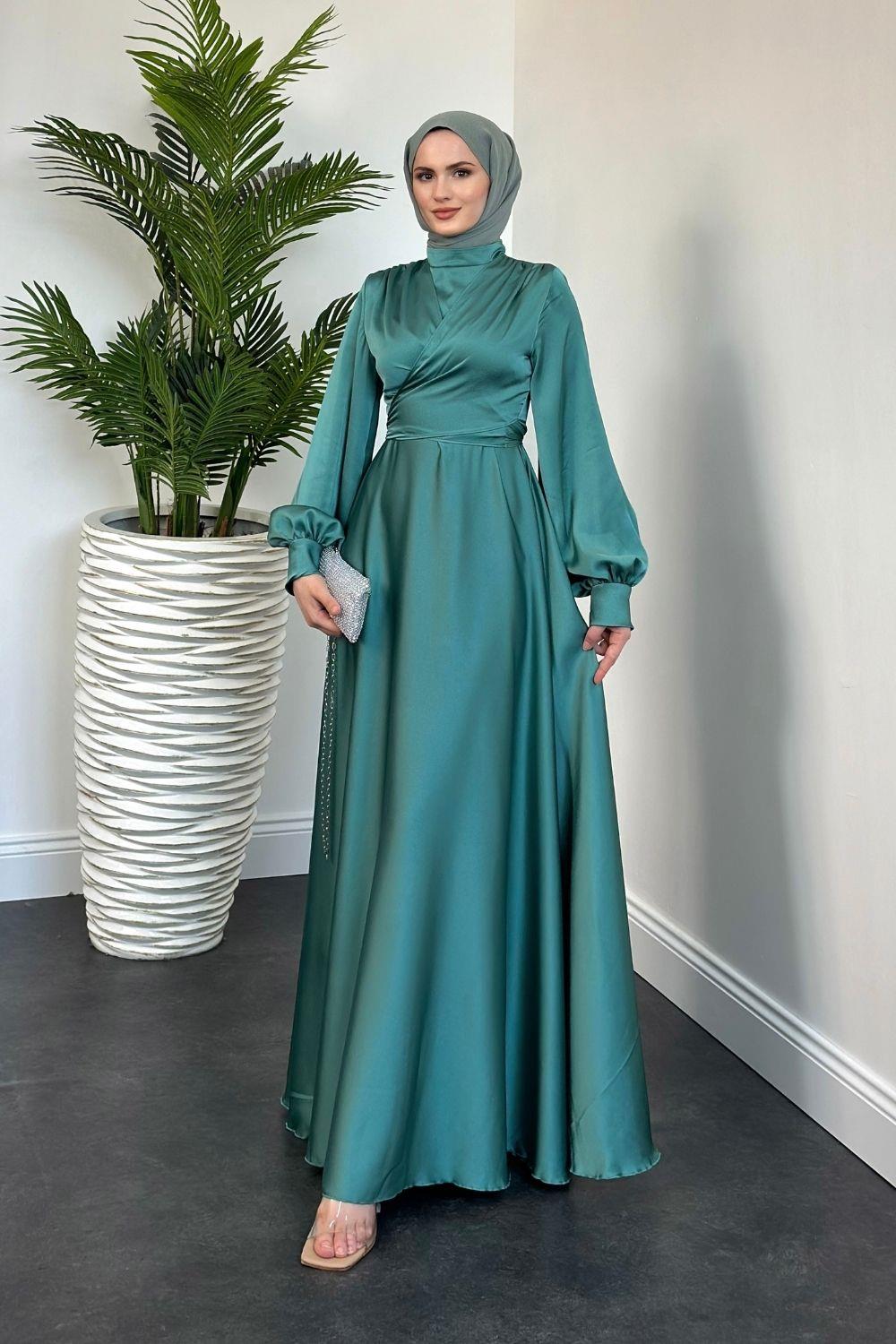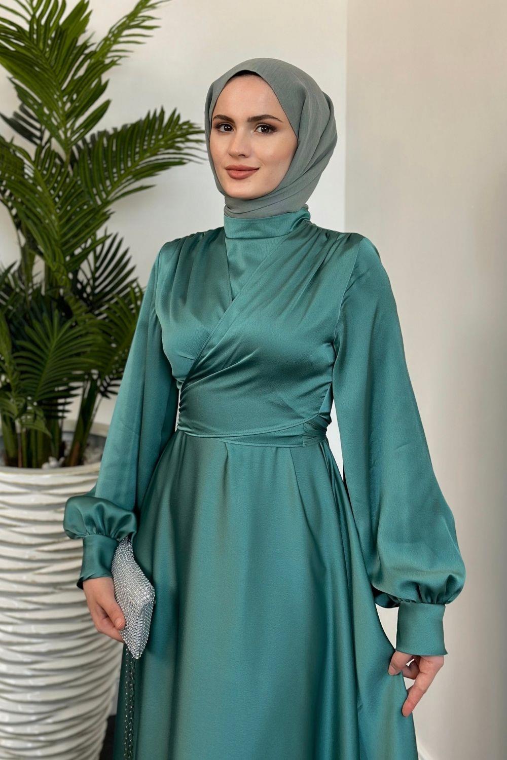 Isabella Kruvaze Detay Saten Abiye Mint Yeşili