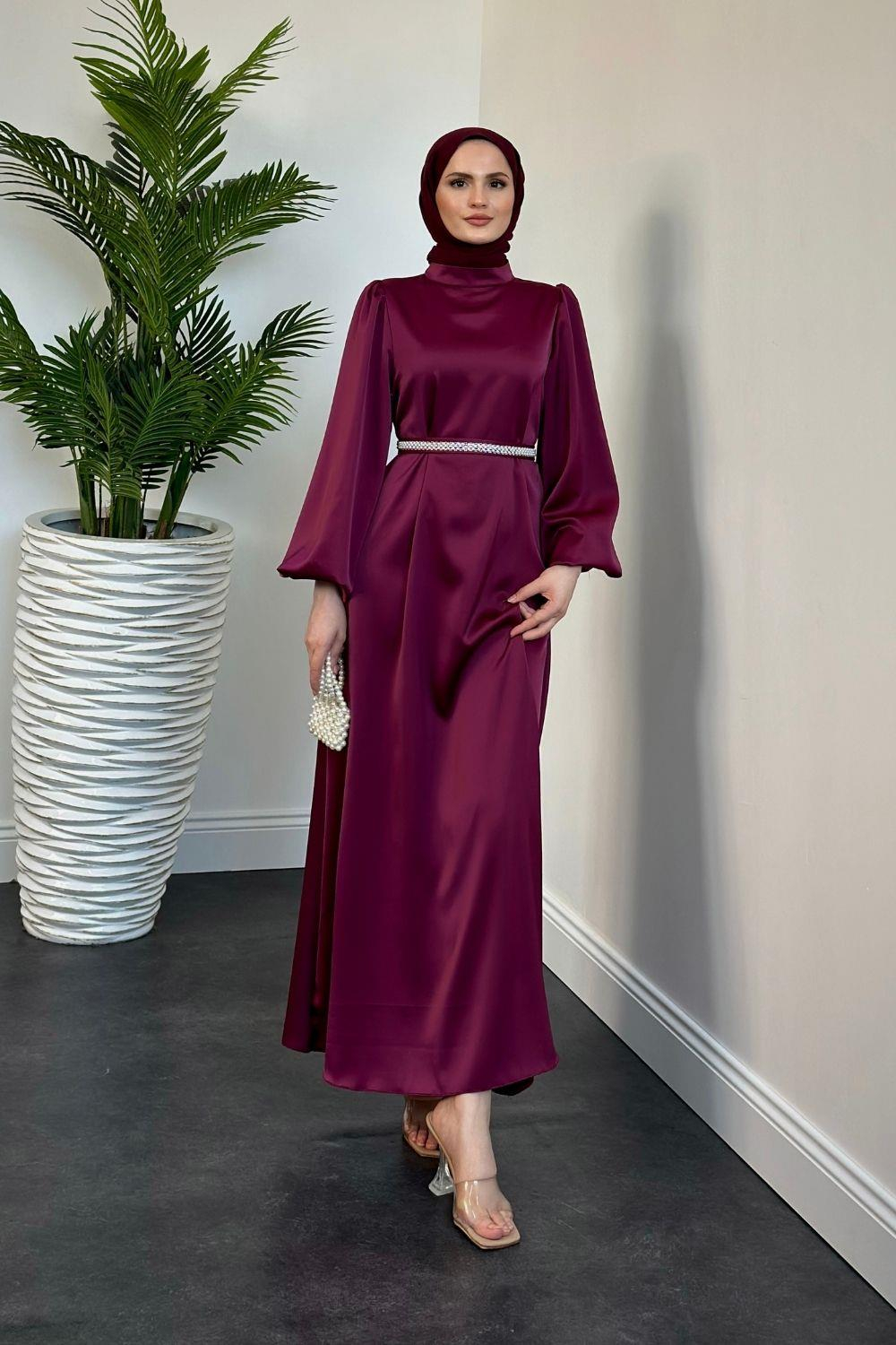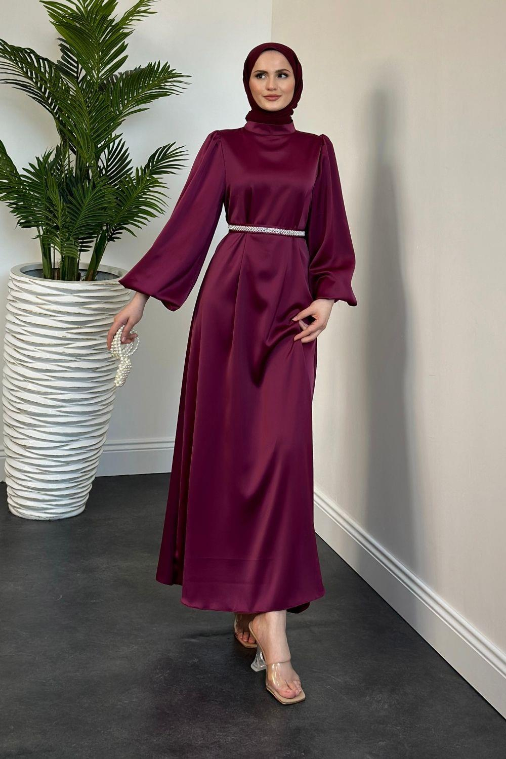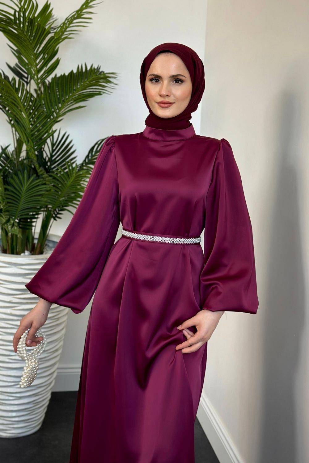 Nika Kemeri İncili Saten Abiye Mürdüm