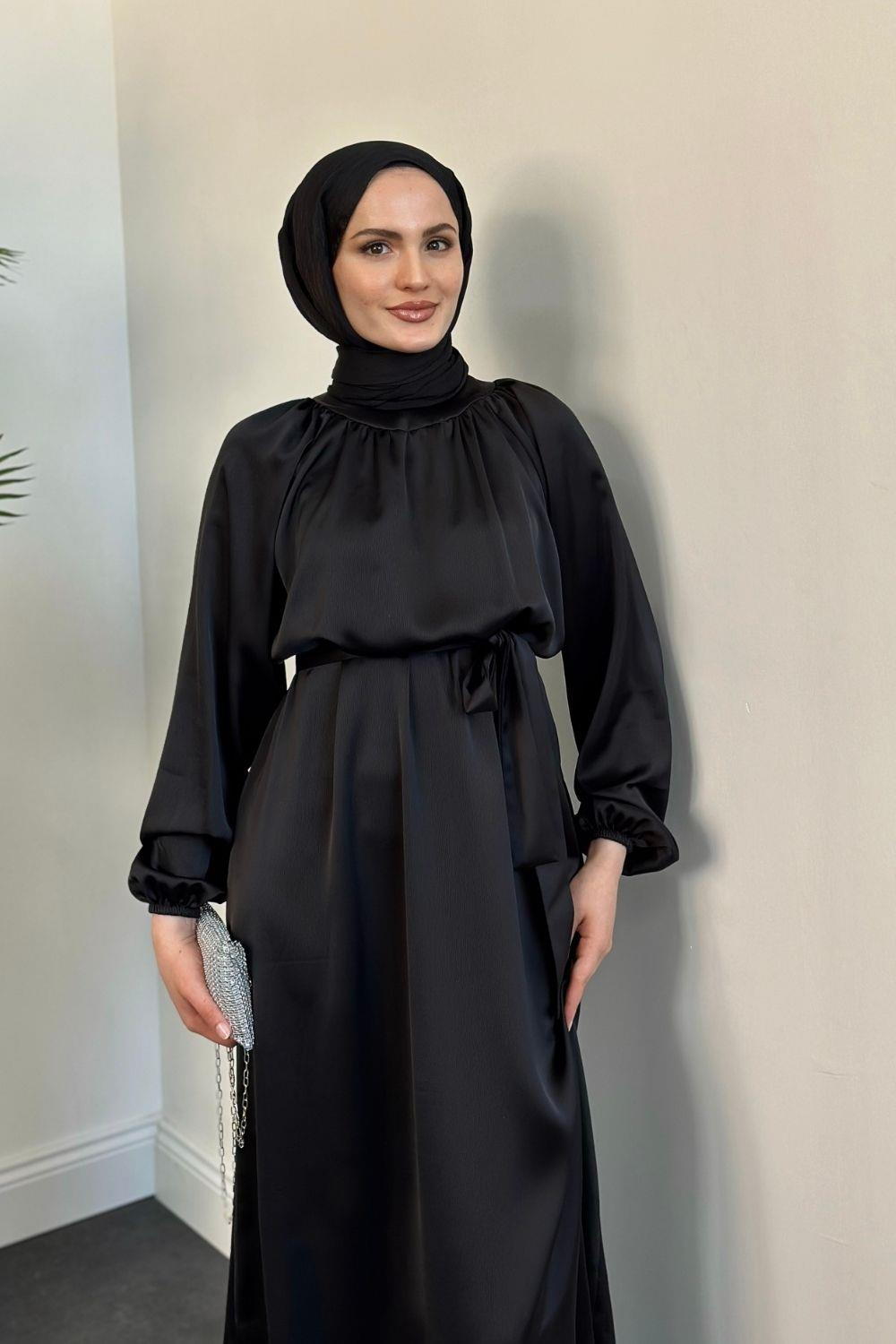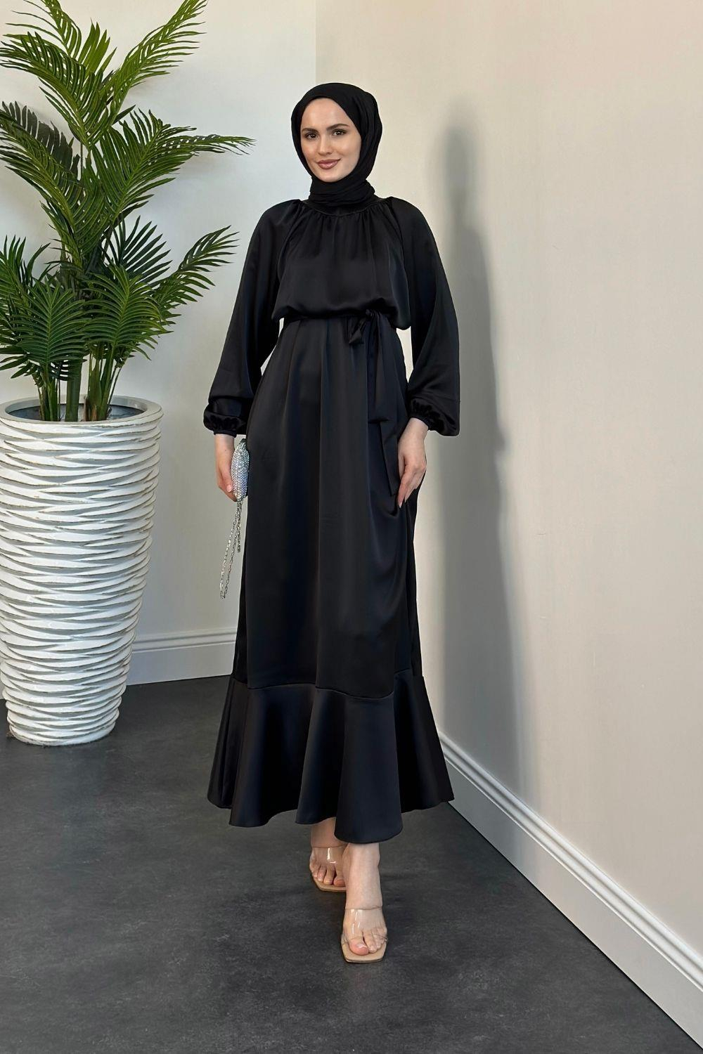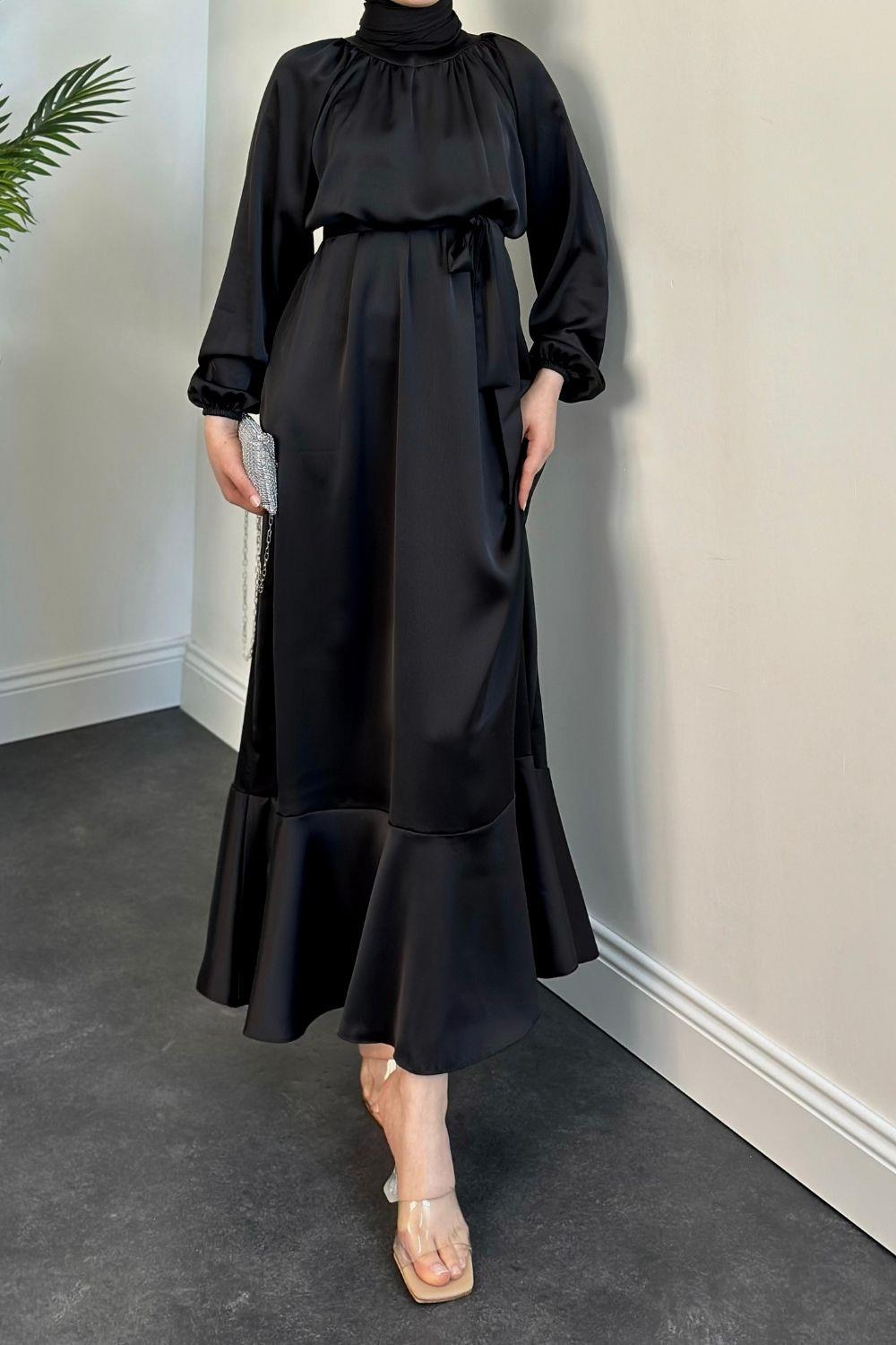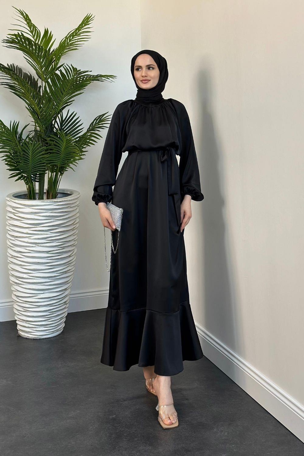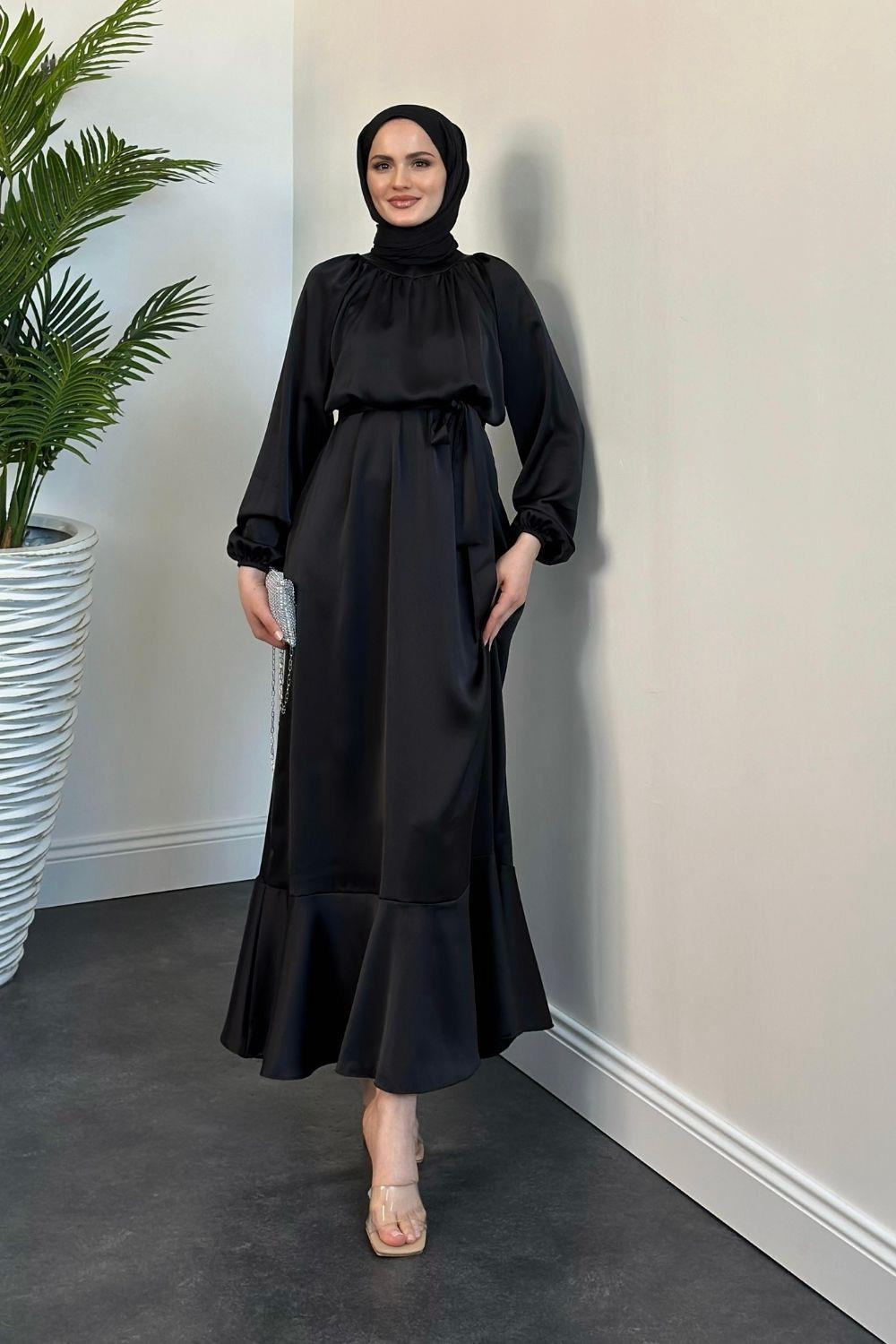 Jahan Altı Volan Saten Abiye Siyah