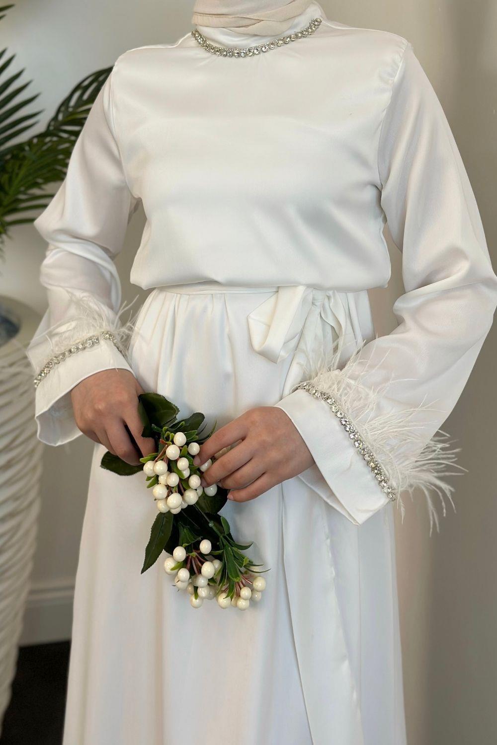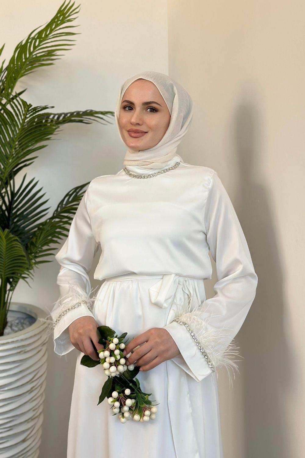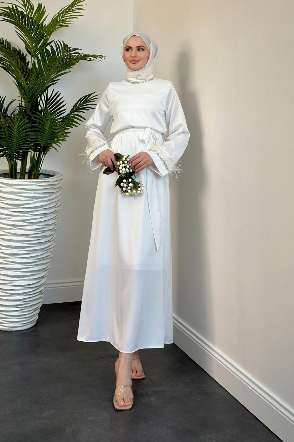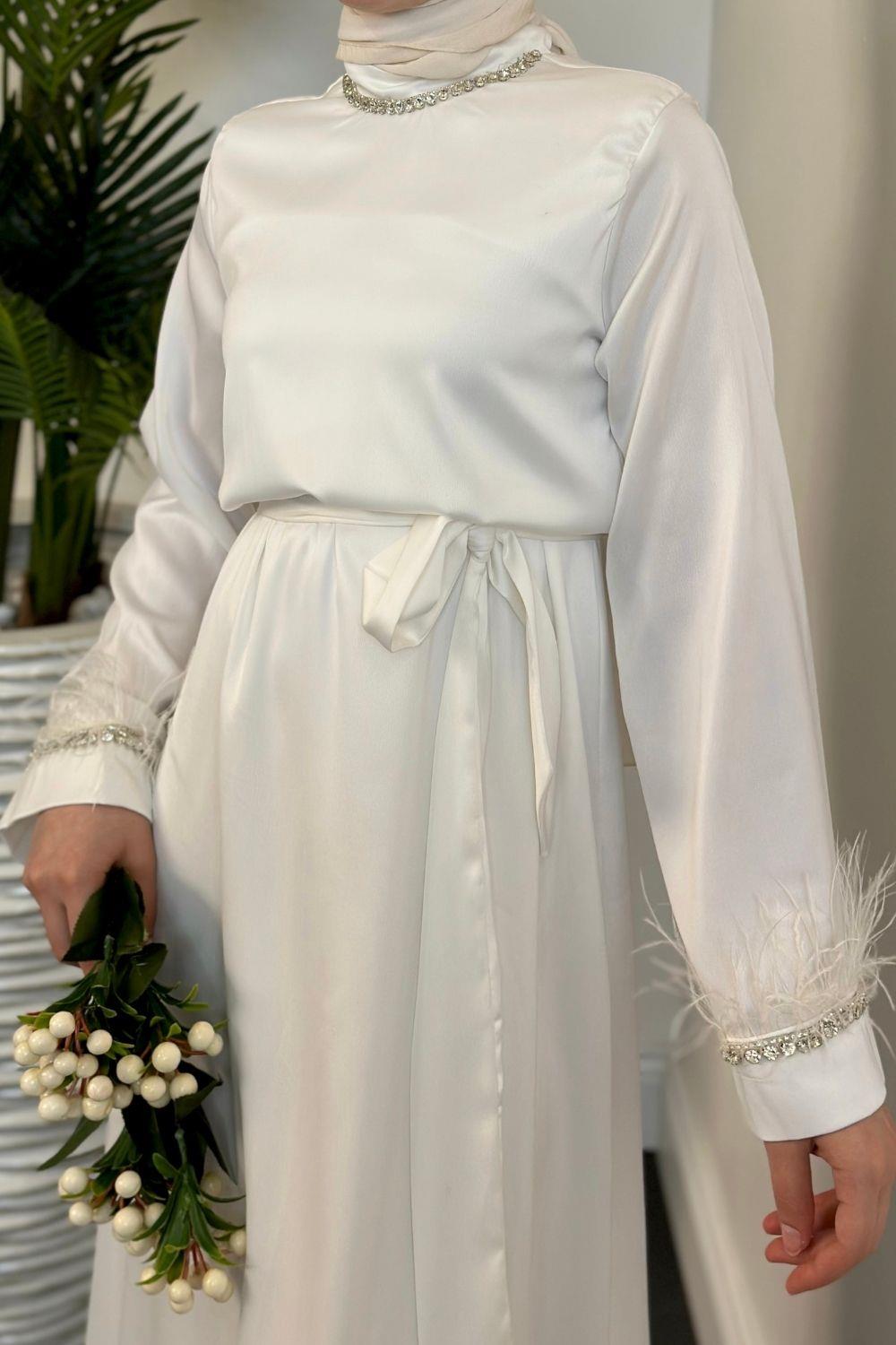 Farzeen Boynu Taşlı Saten Abiye Beyaz