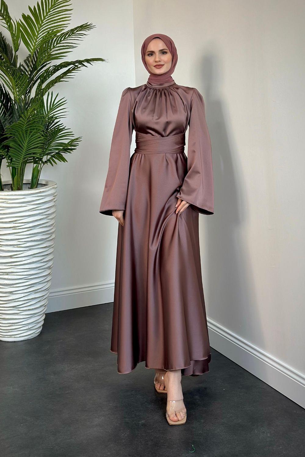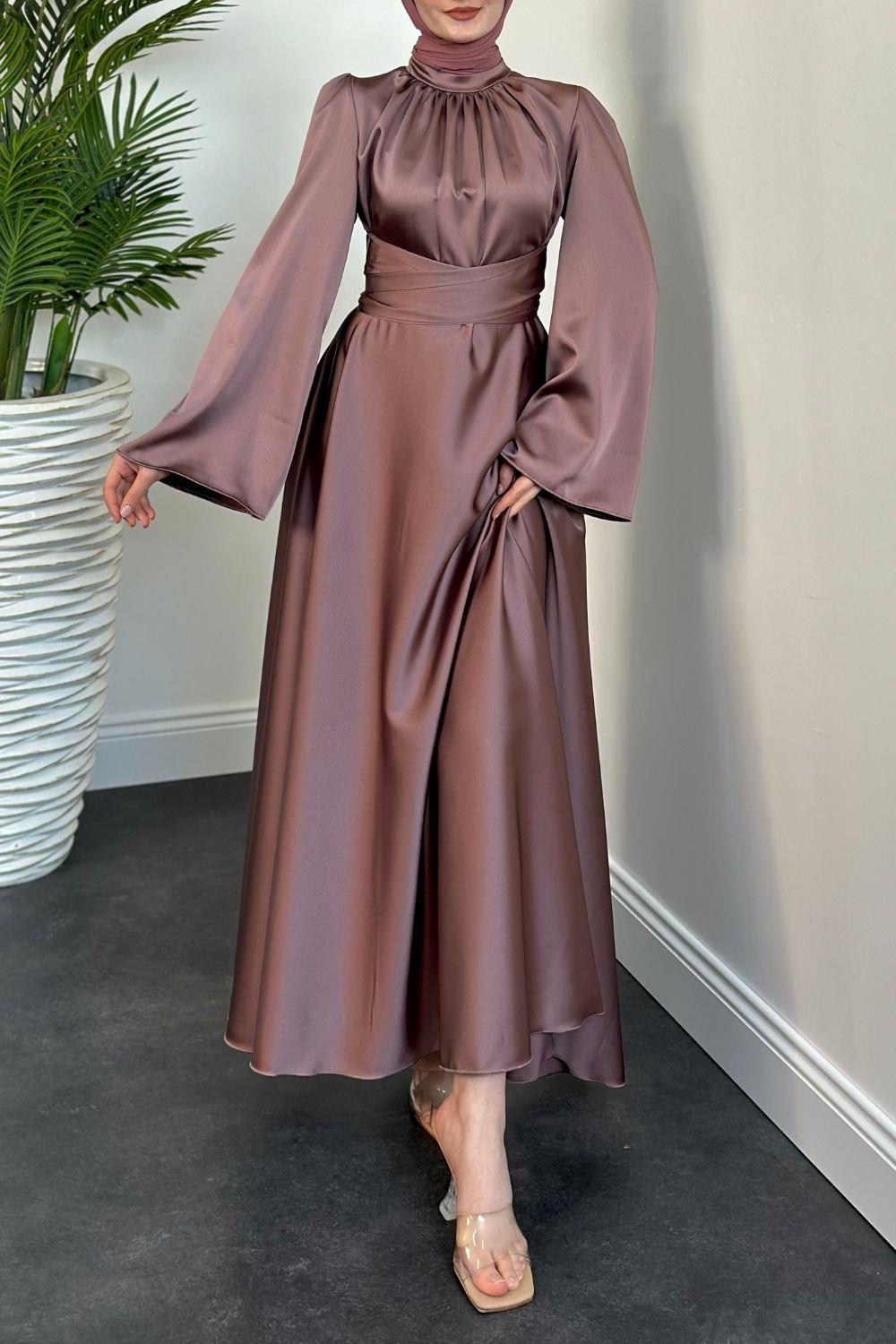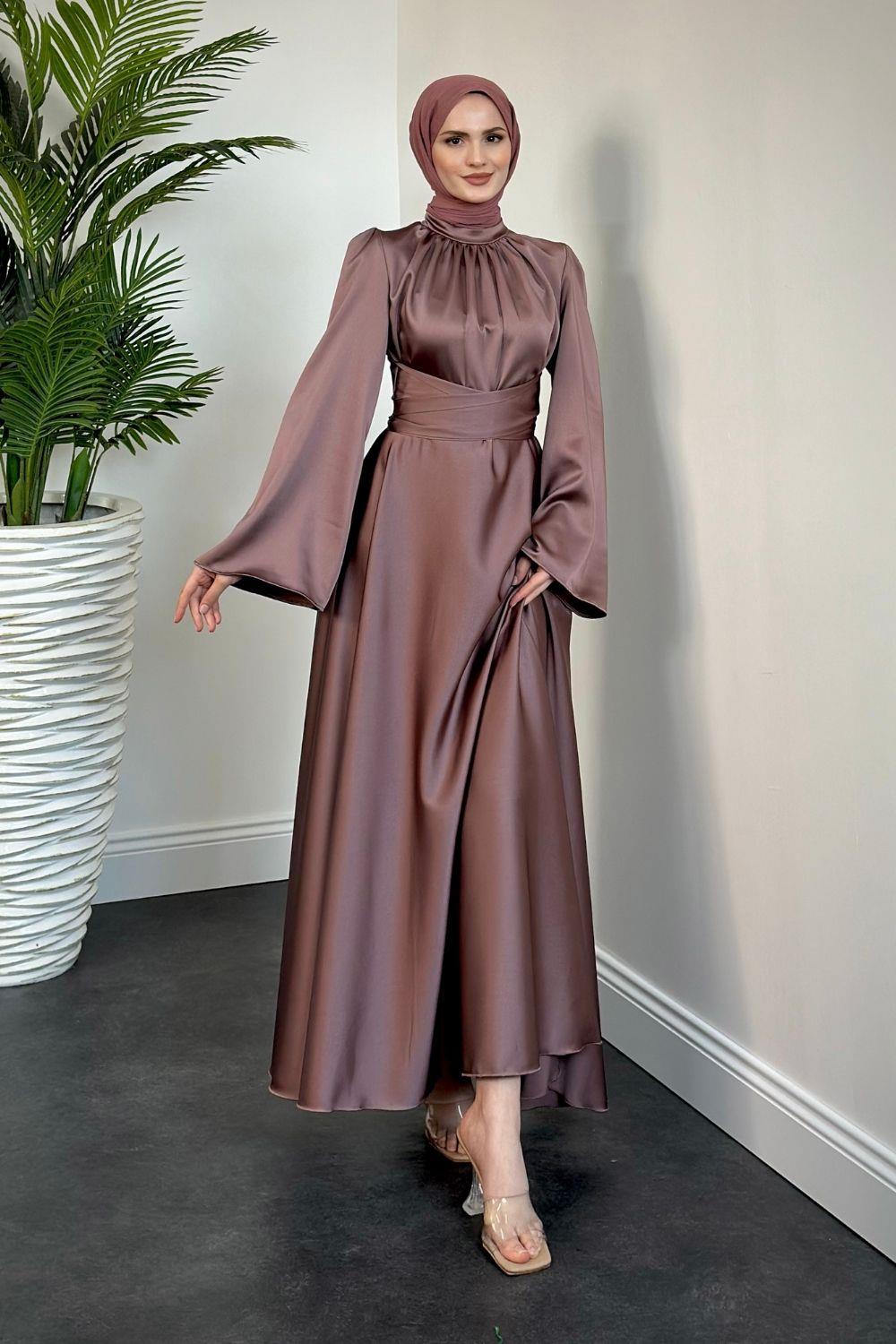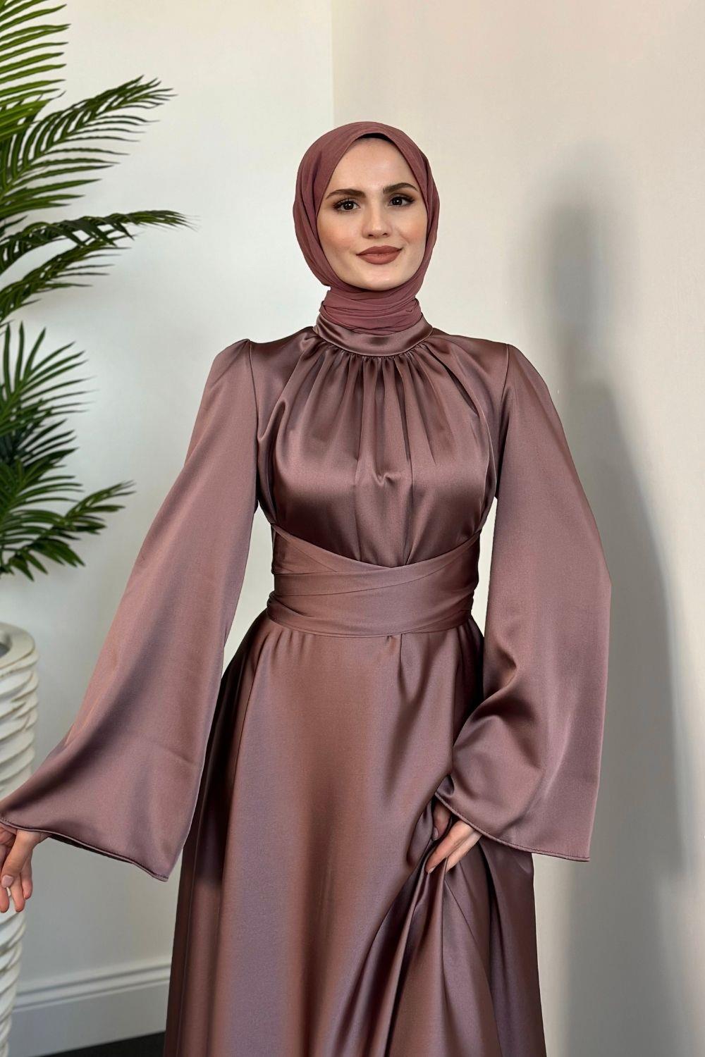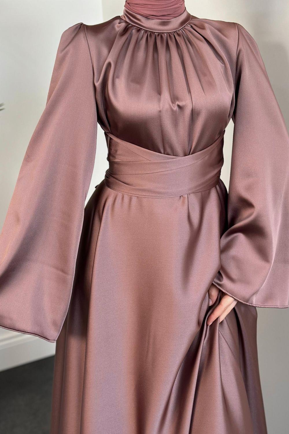 Violet İspanyol Kol Belden Bağlama Saten Elbise Rose
