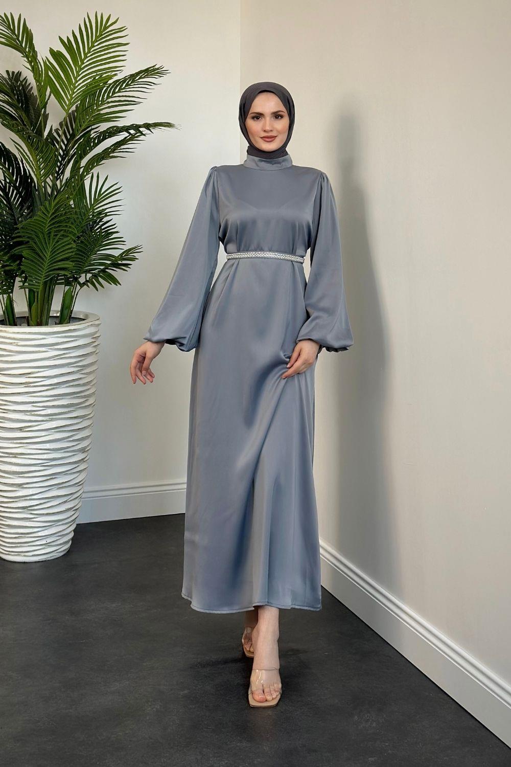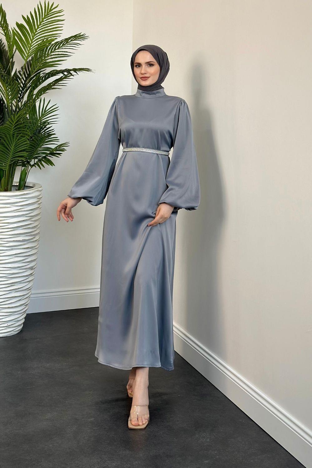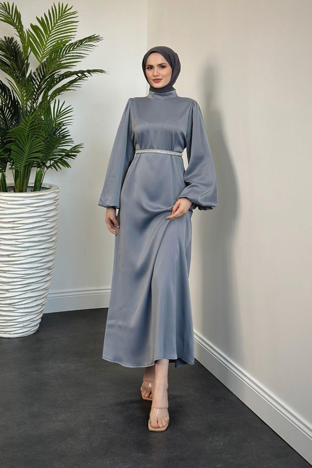 Nika Kemeri İncili Saten Abiye Füme