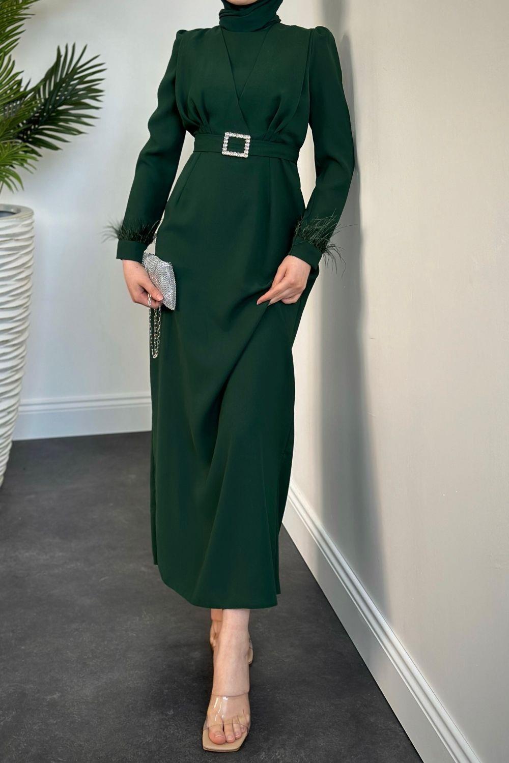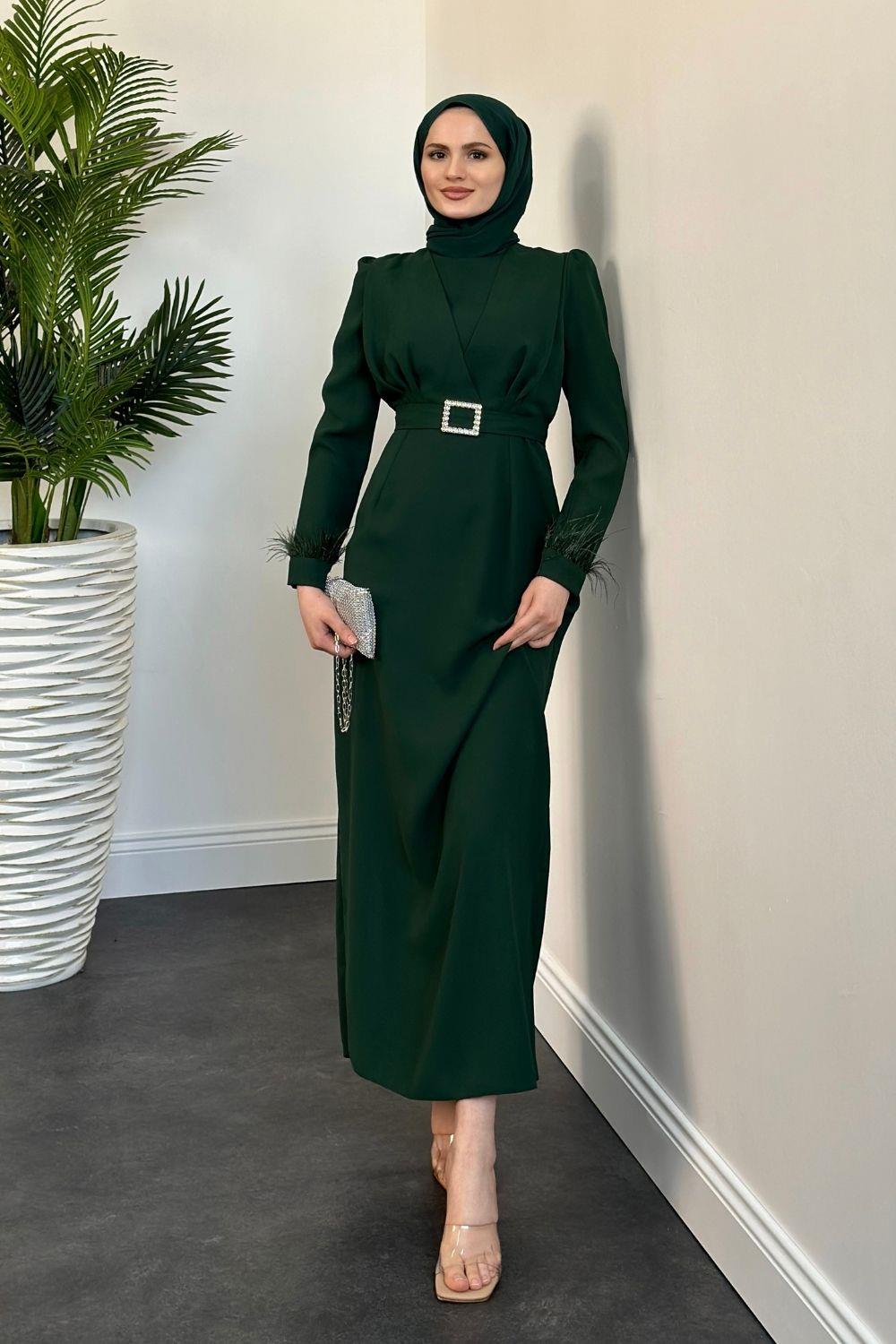 Stell Kolları Tüy Detay Kalem Abiye Yeşil