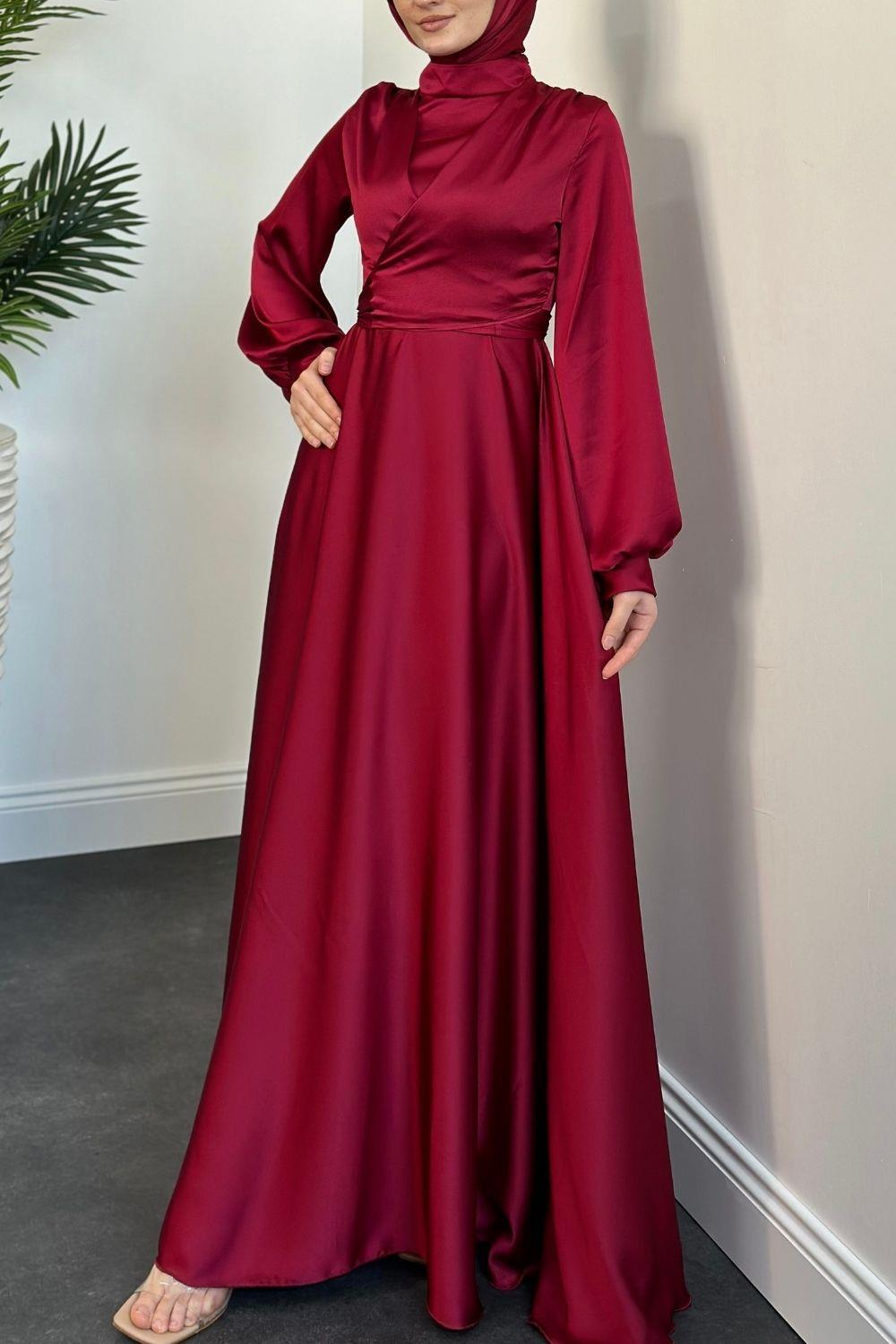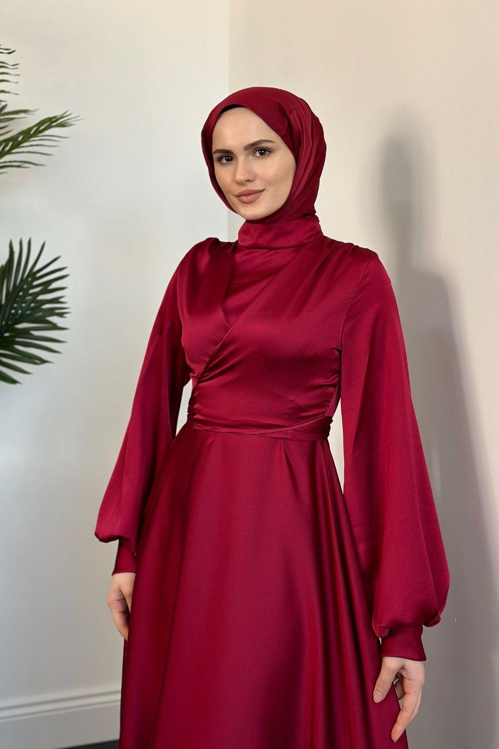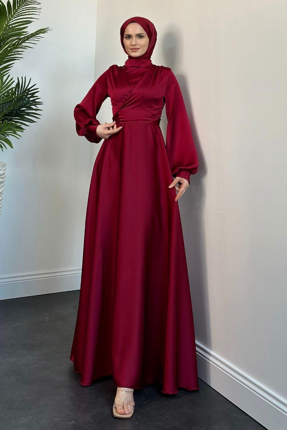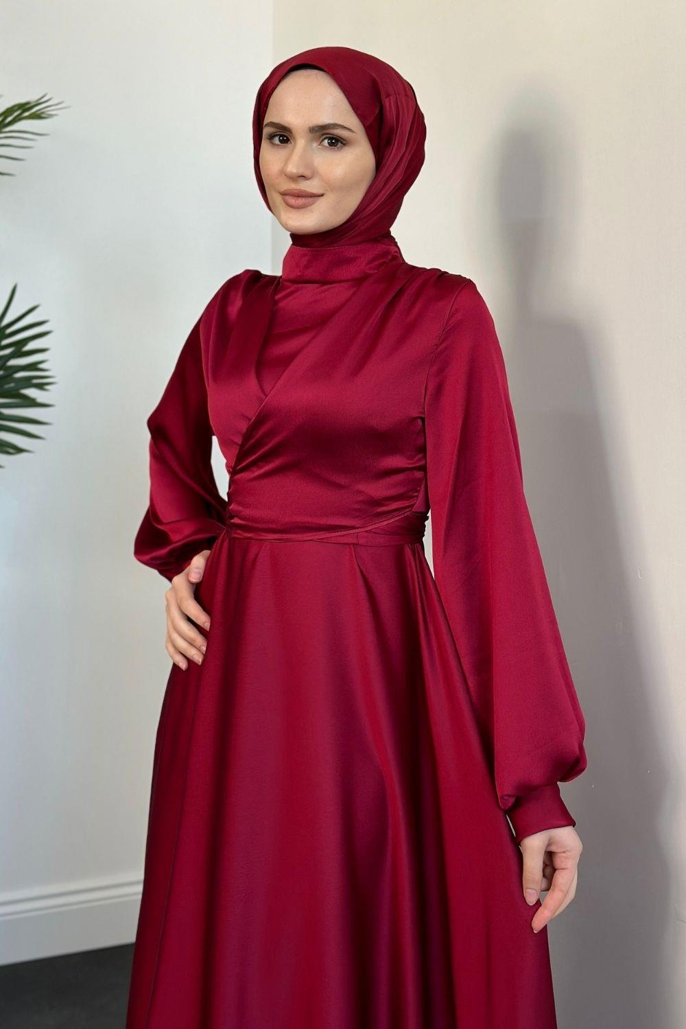 Isabella Kruvaze Detay Saten Abiye Bordo
