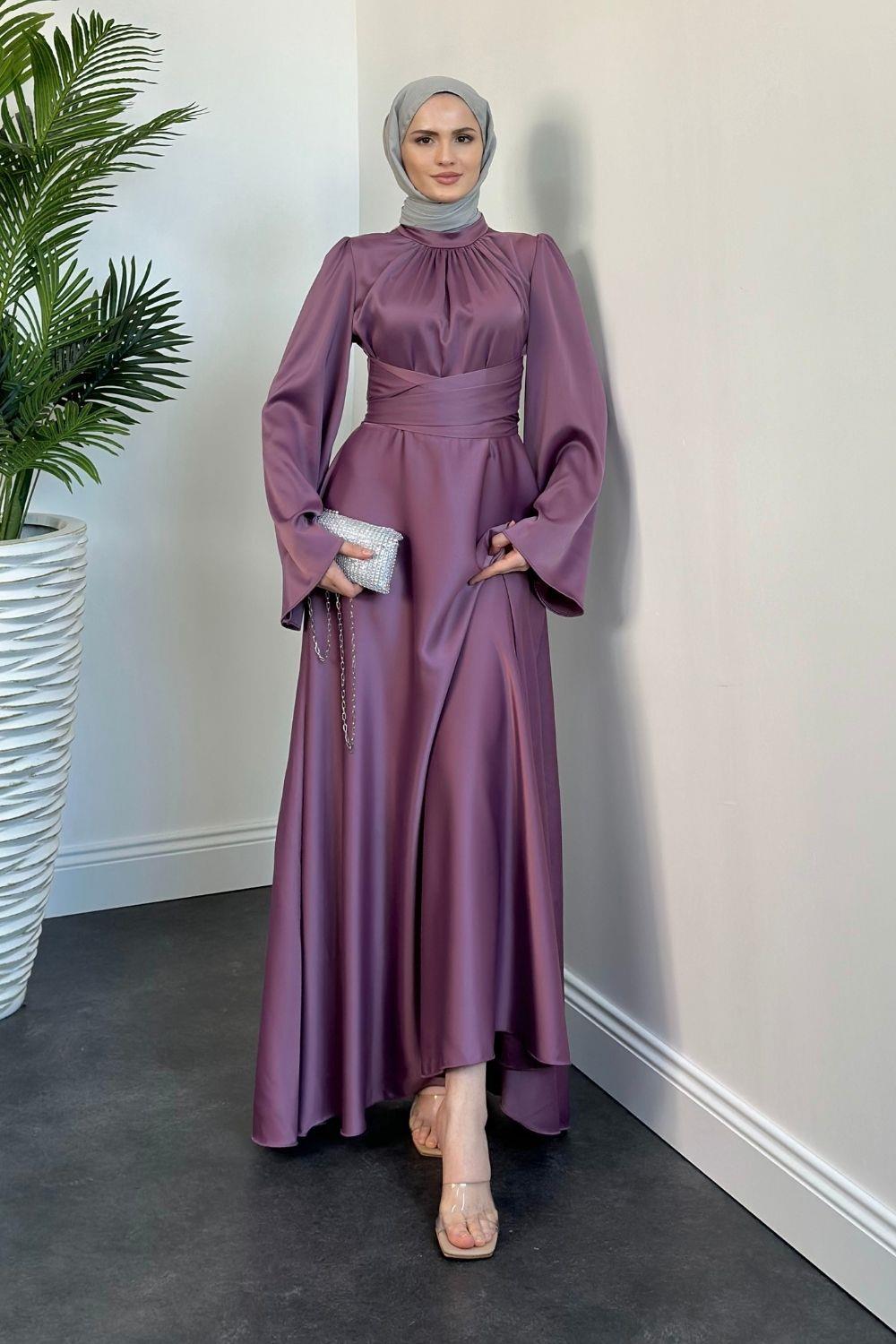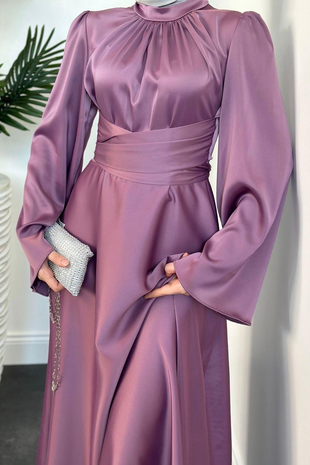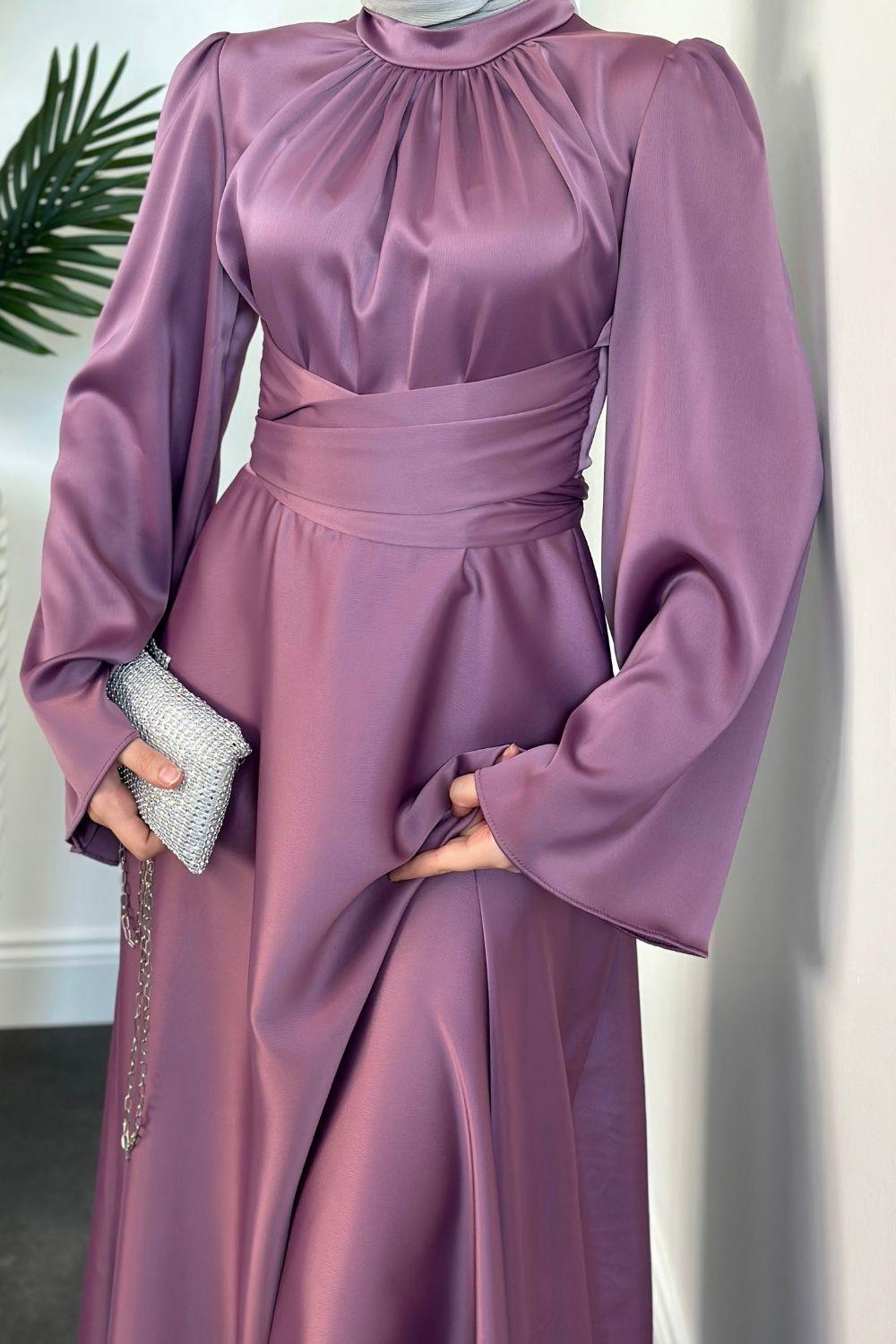 Violet İspanyol Kol Belden Bağlama Saten Elbise Leylak