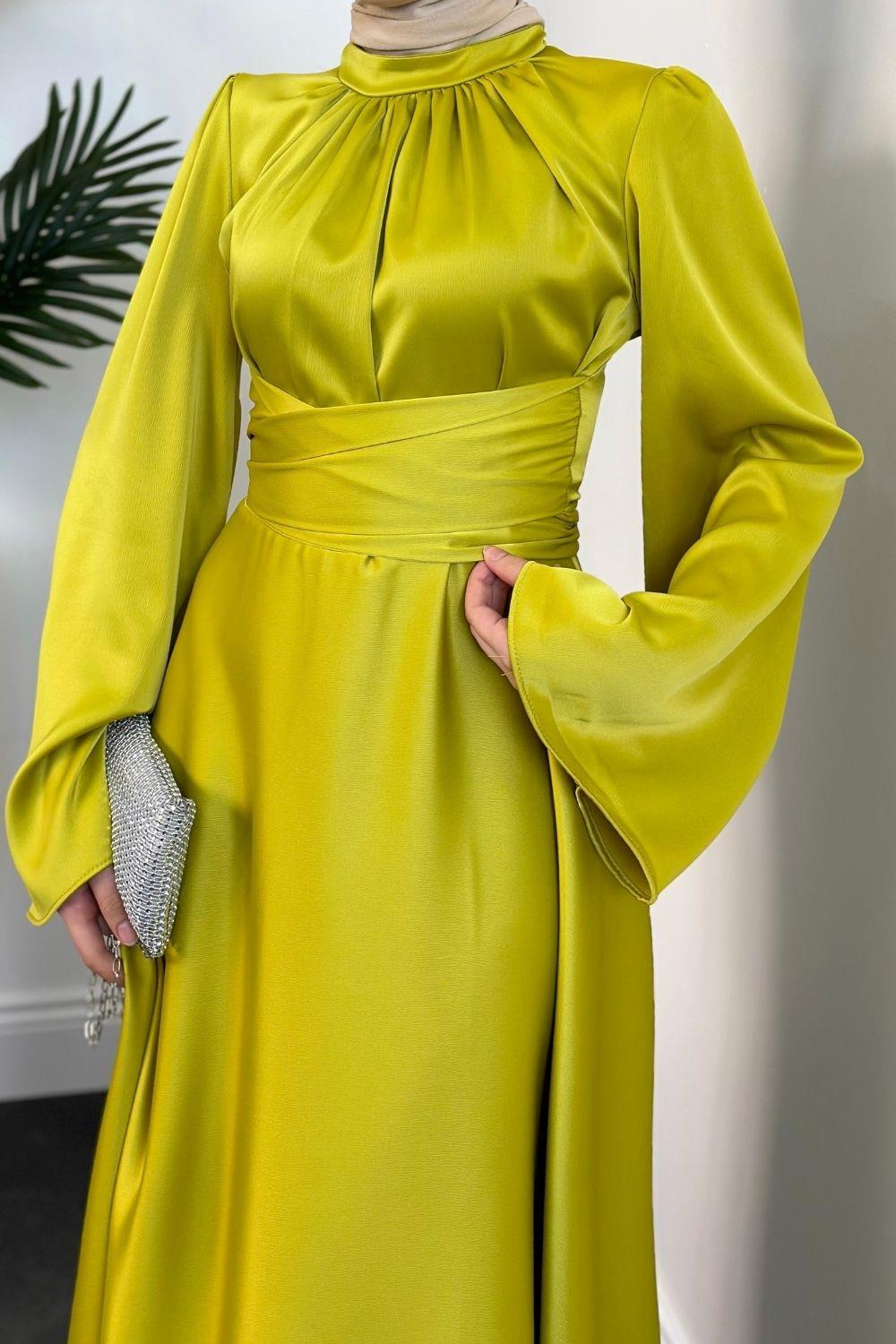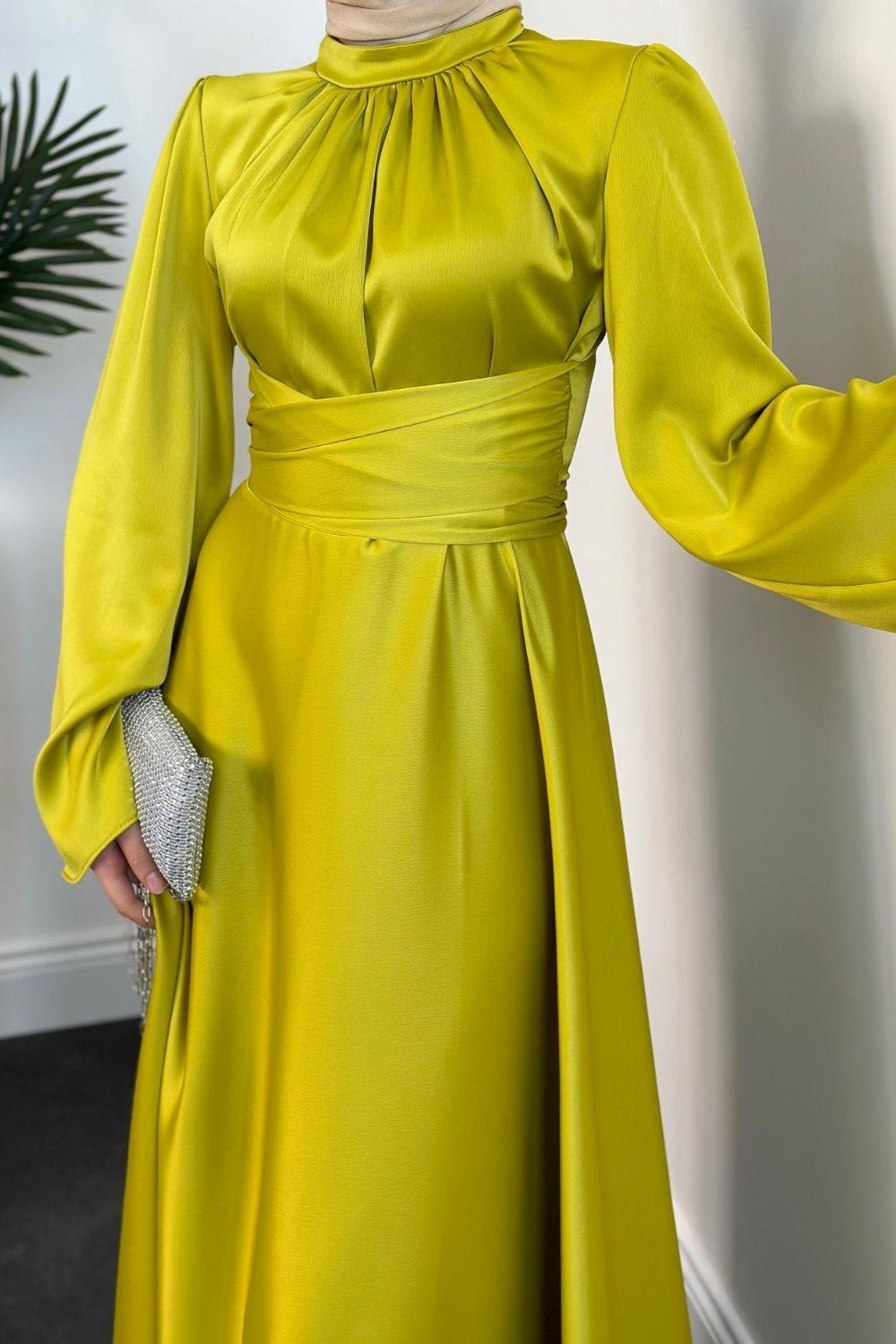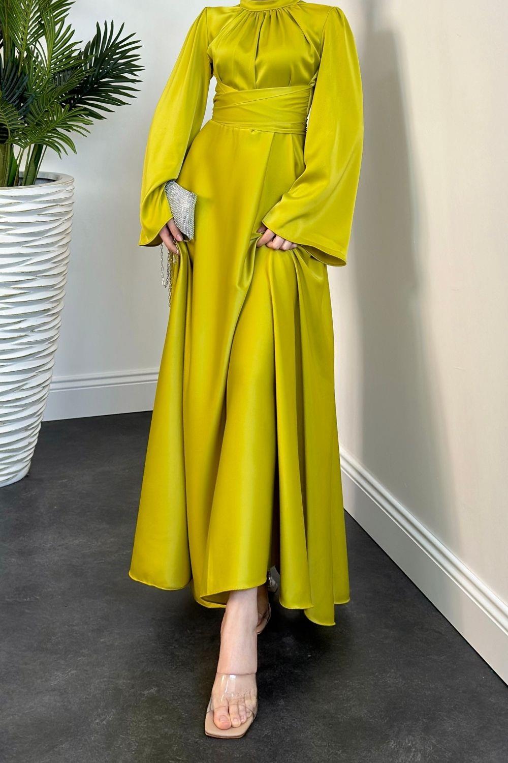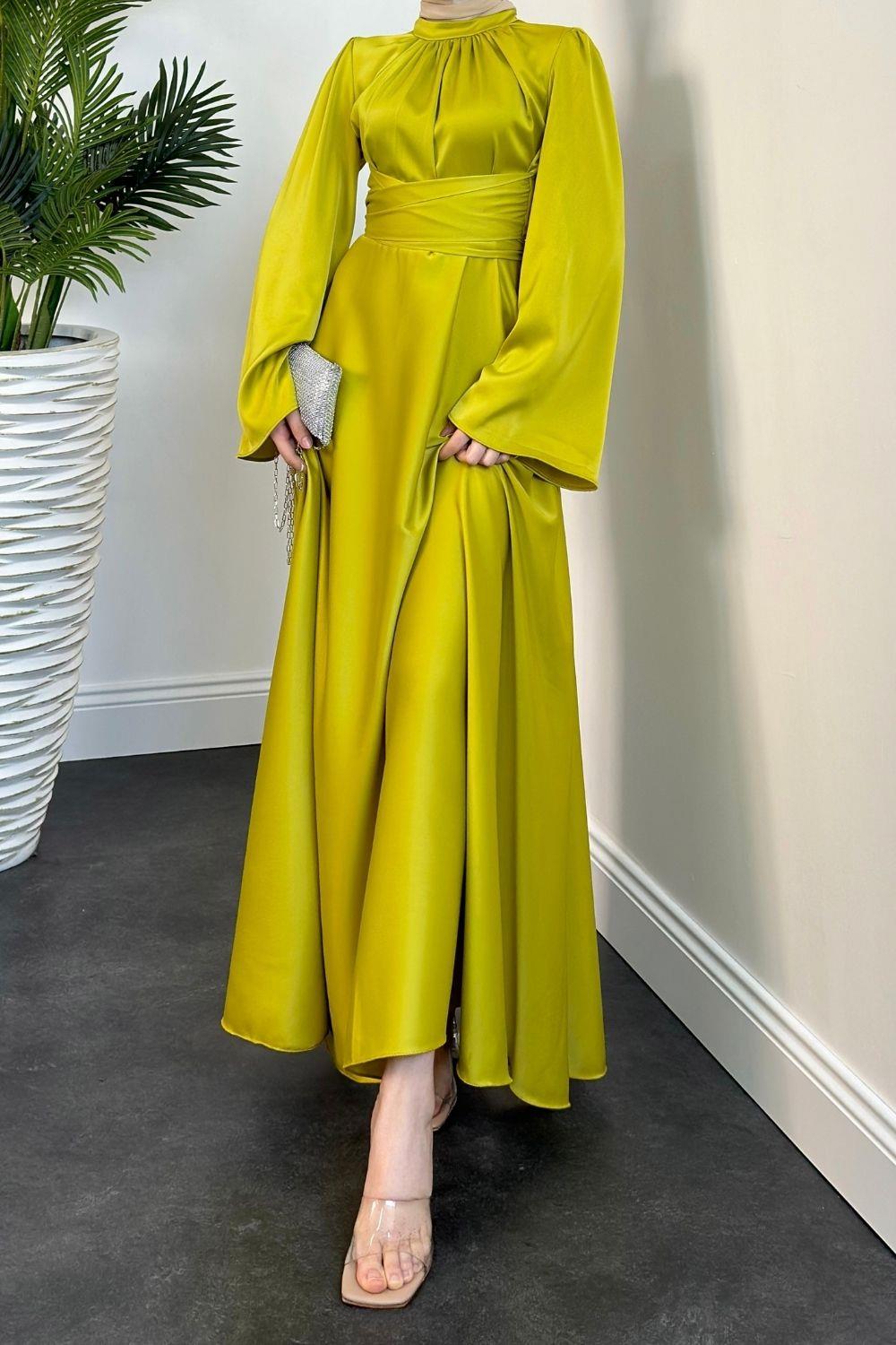 Violet İspanyol Kol Belden Bağlama Saten Elbise Yağ Yeşili
