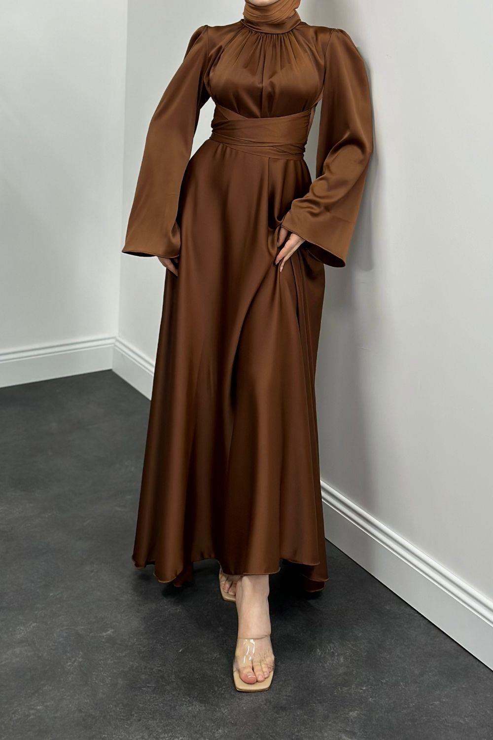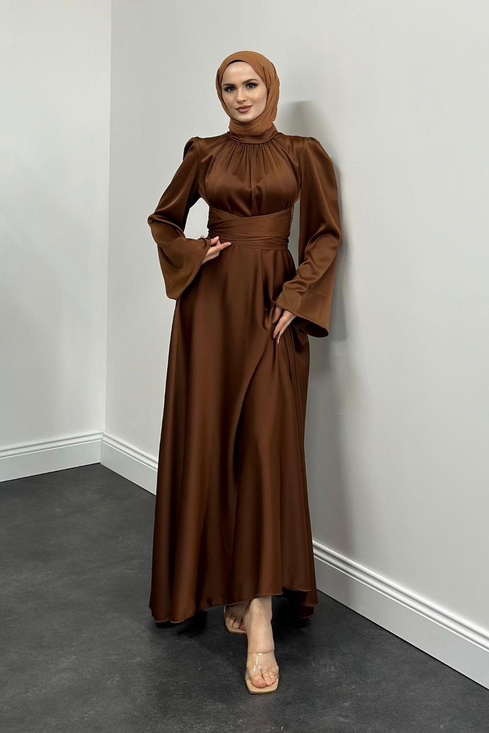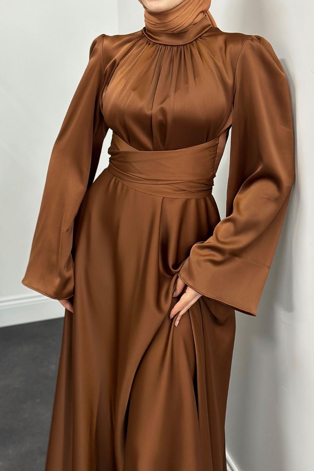 Violet İspanyol Kol Belden Bağlama Saten Elbise Taba