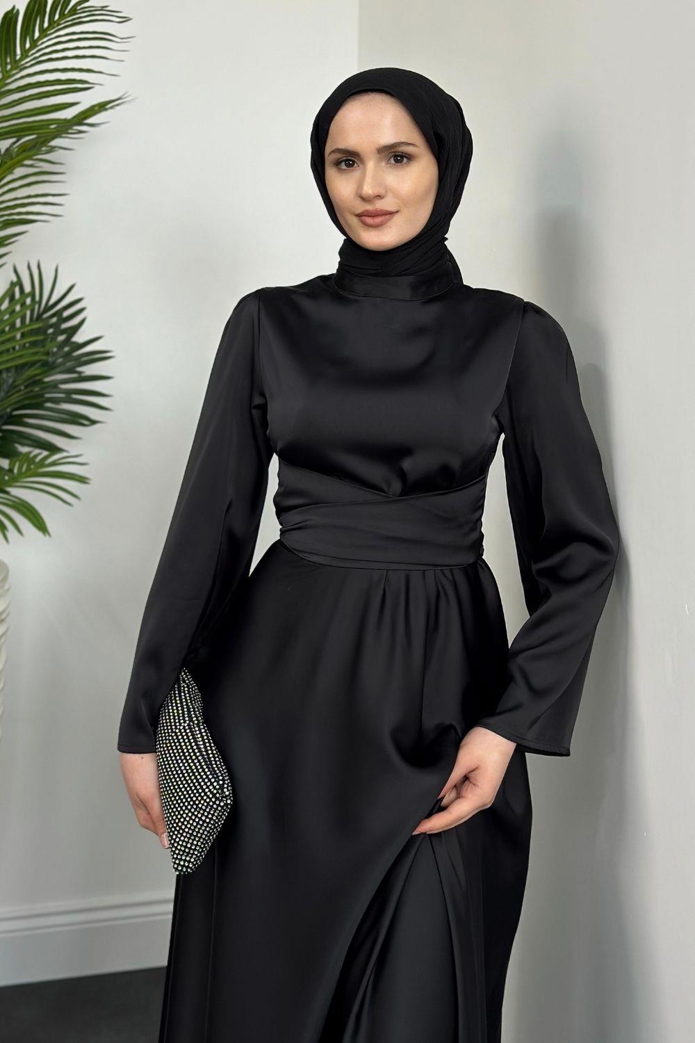 Valeria Kuşaklı Saten Abiye Siyah