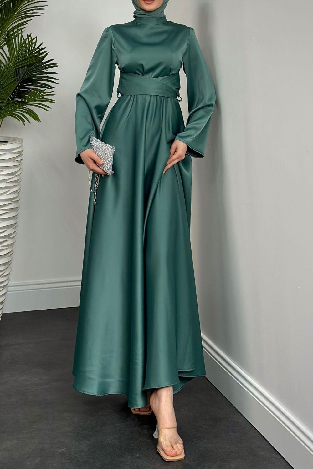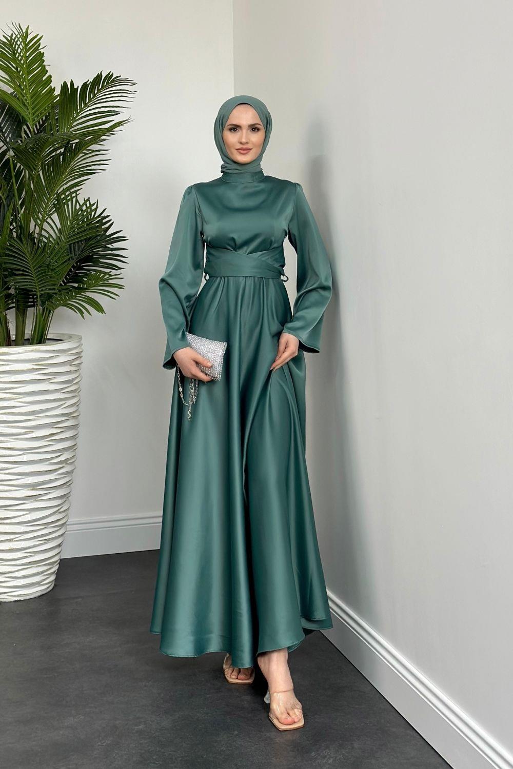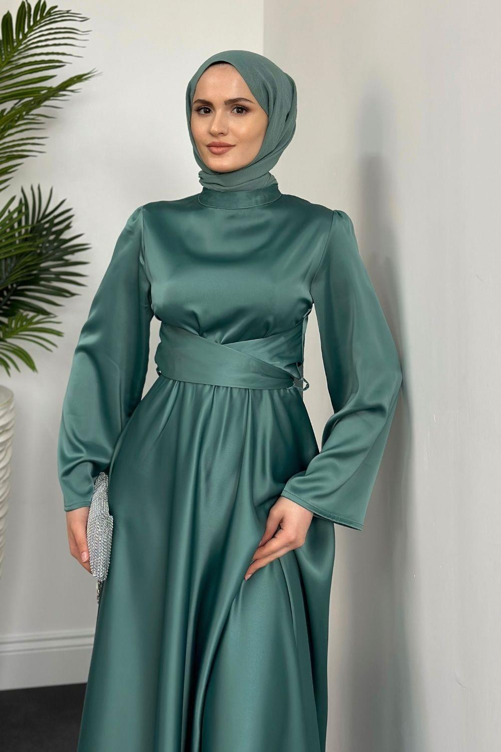 Valeria Kuşaklı Saten Abiye Mint Yeşili
