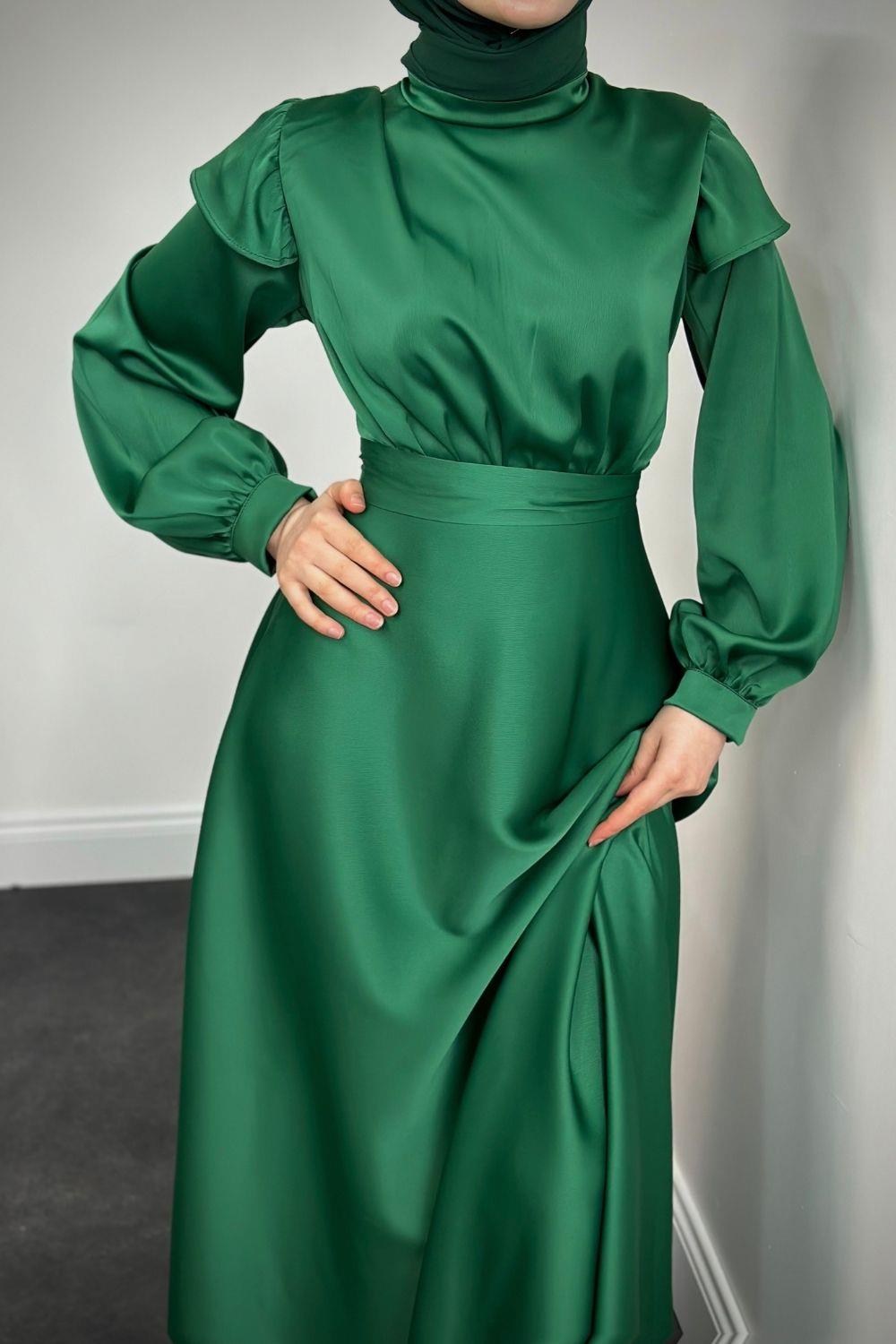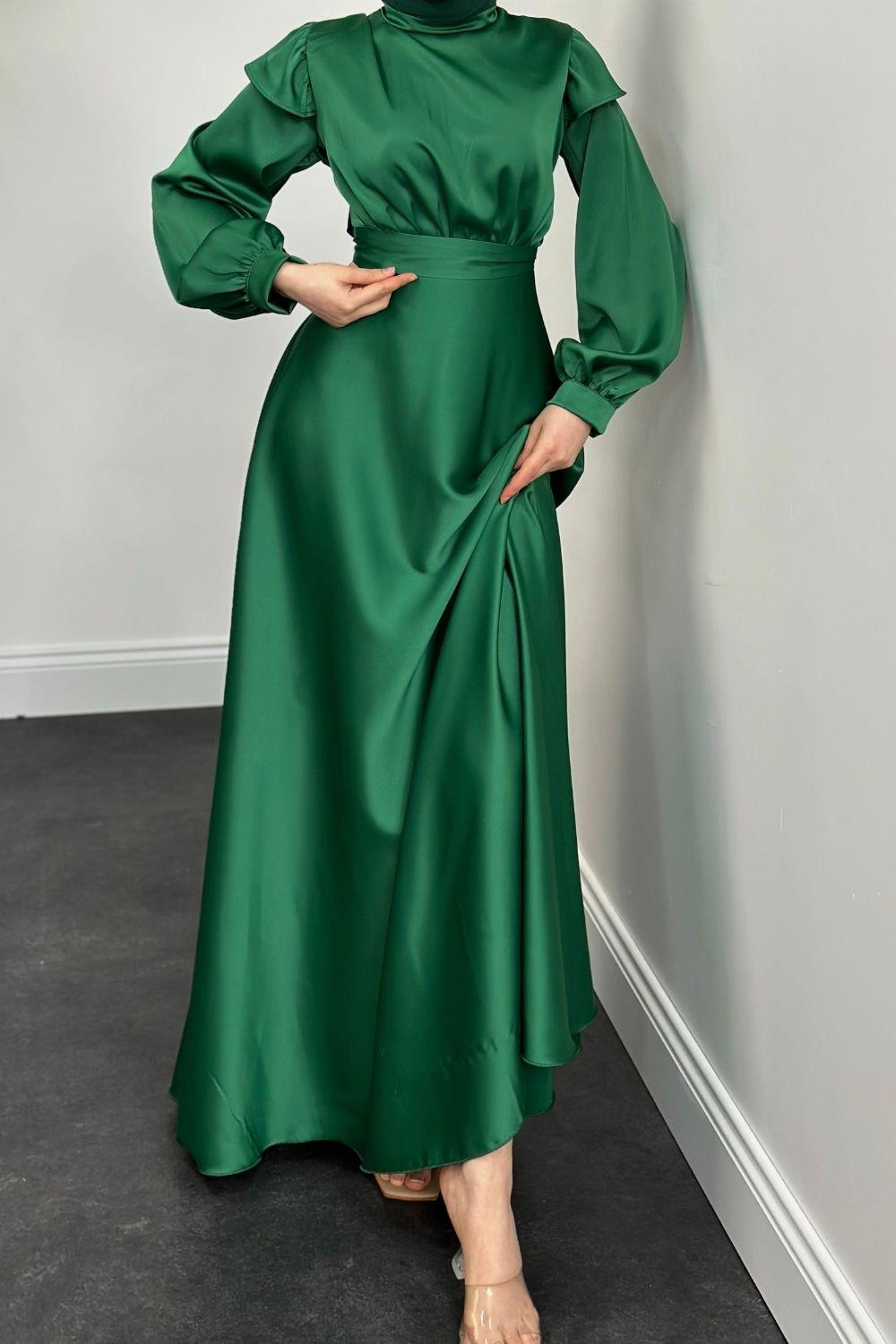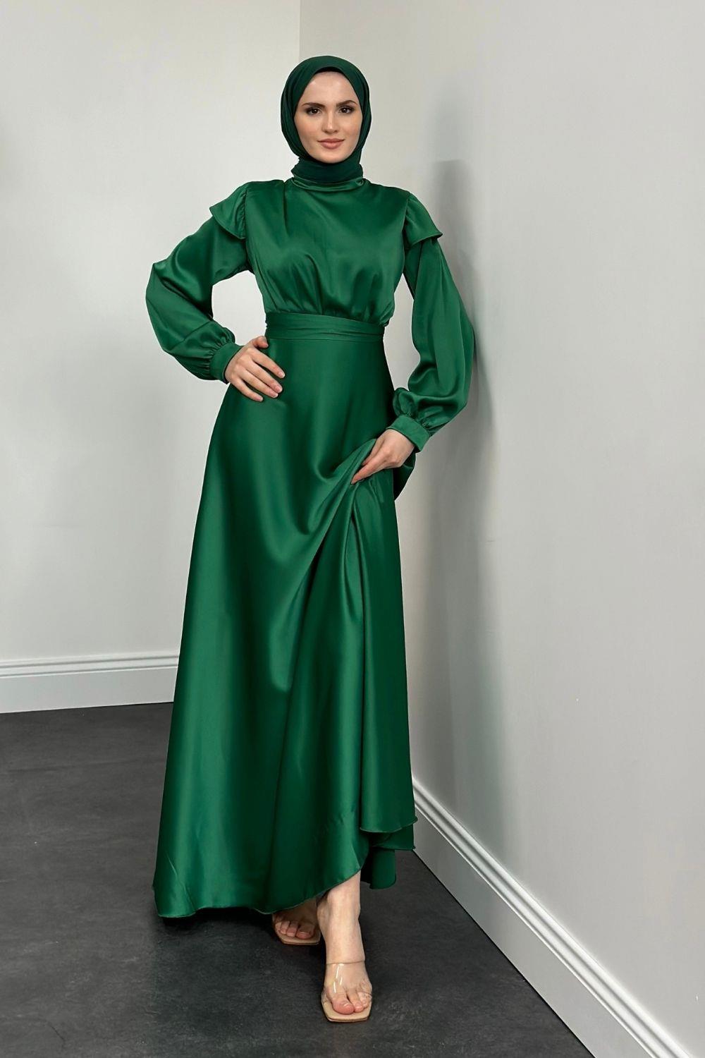 Cera Omzu Fırfır Saten Abiye Benetton Yeşili