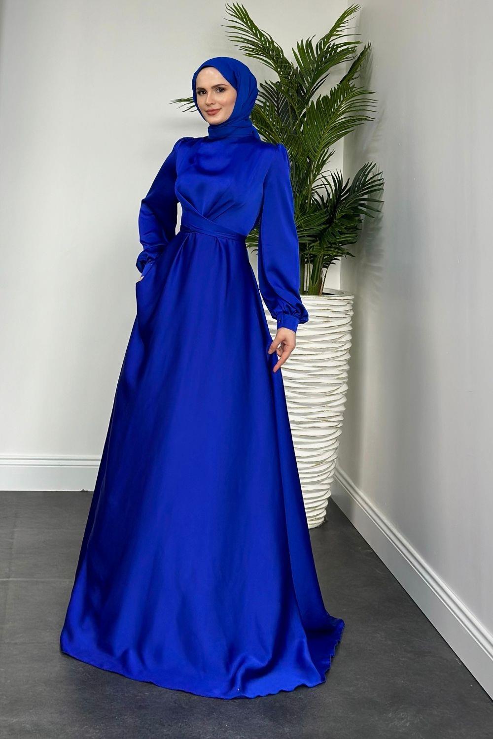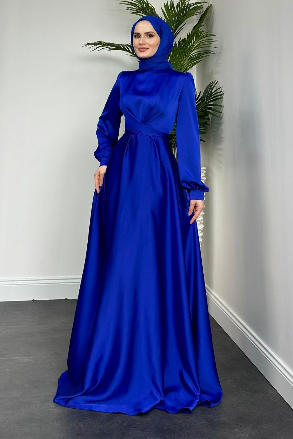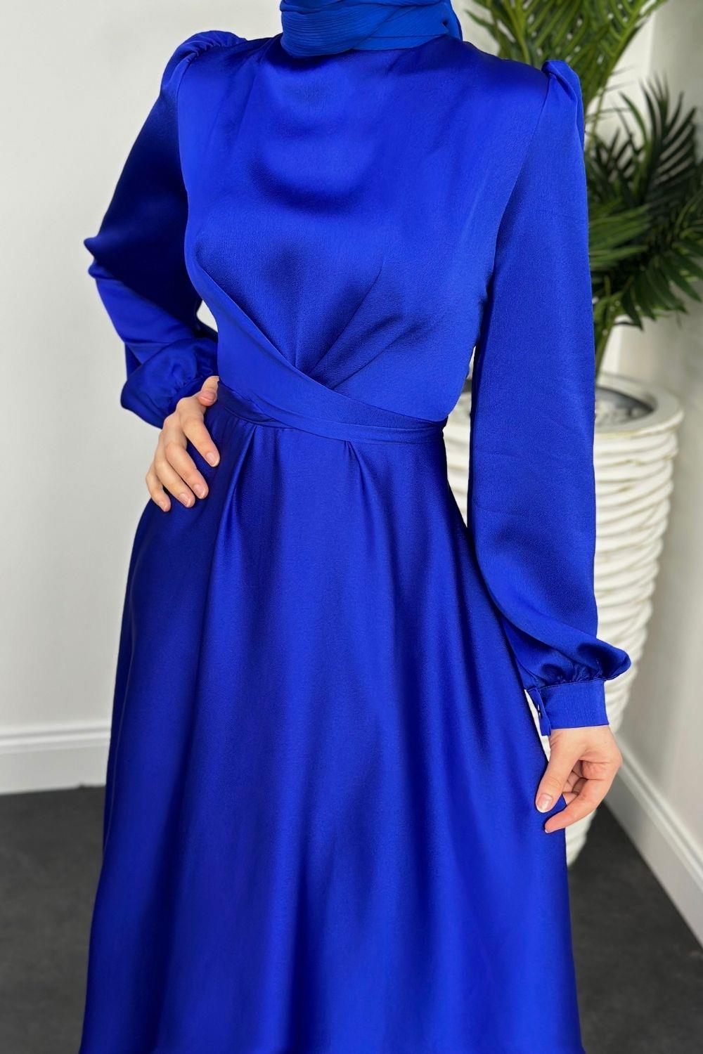 Samantha Önü Çapraz Detay Saten Abiye Saks Mavisi