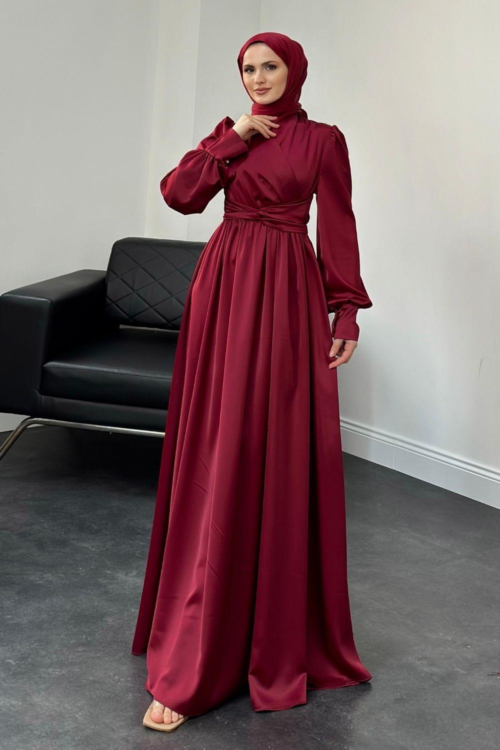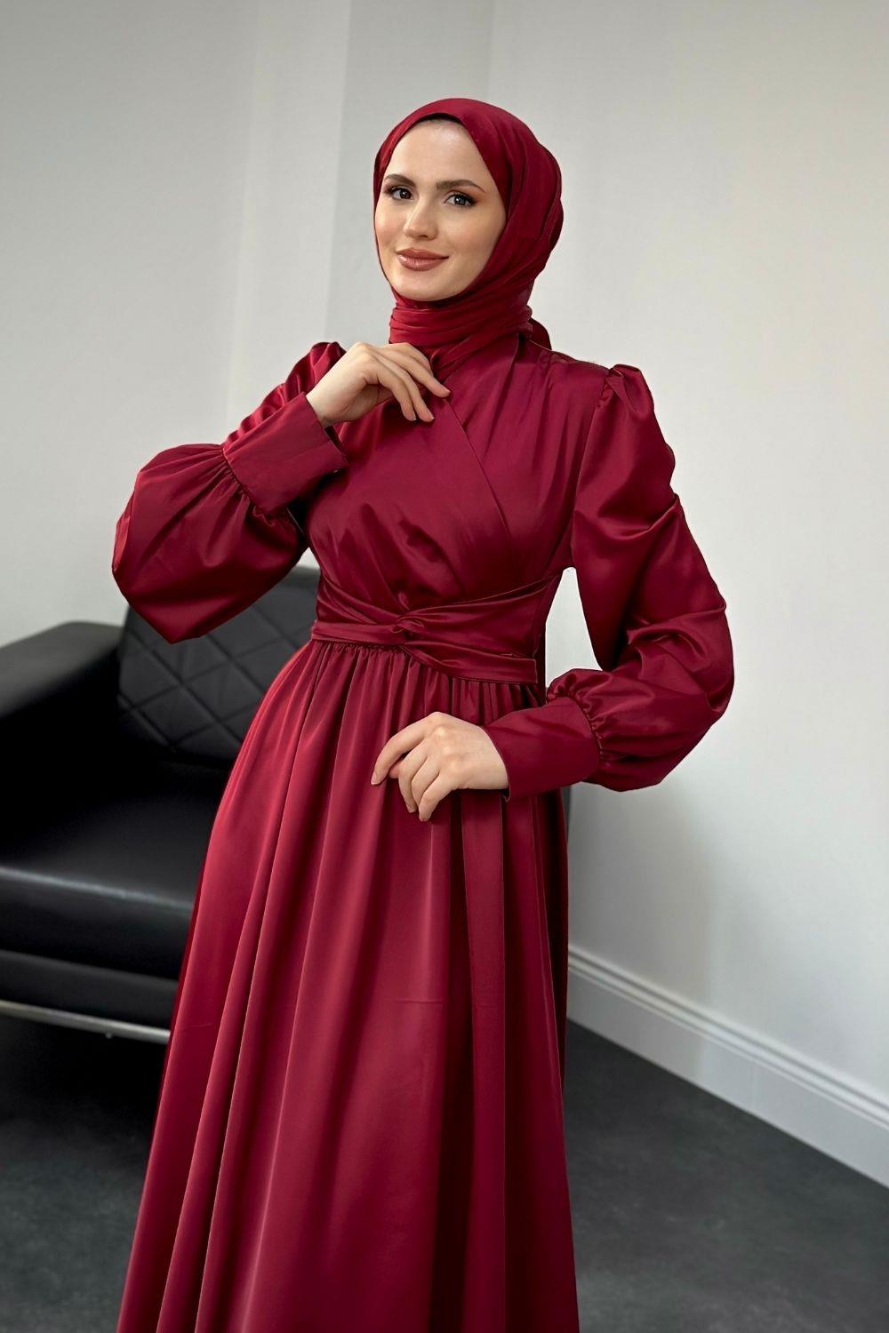 Camelia Kruvaze Yaka Saten Abiye Bordo
