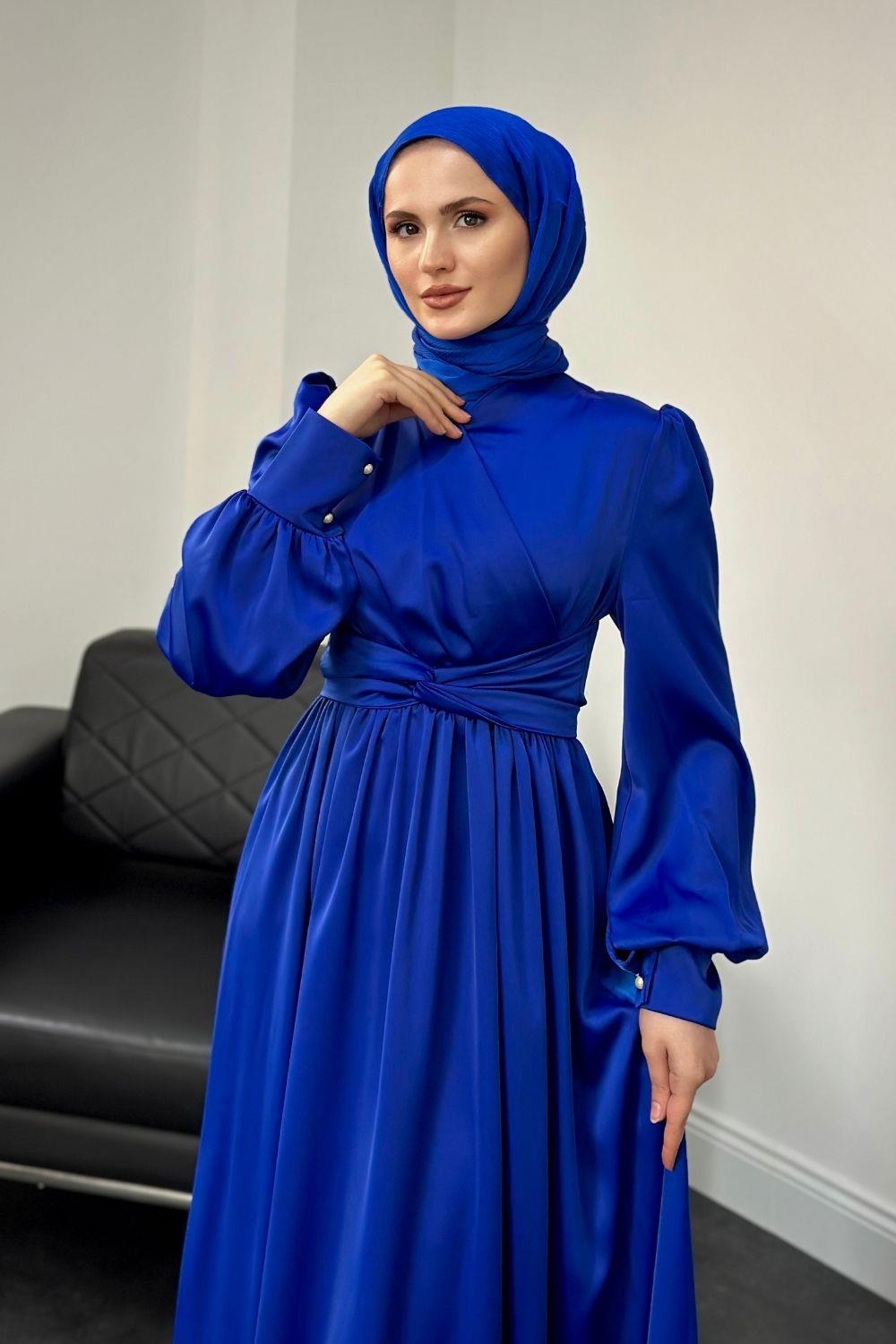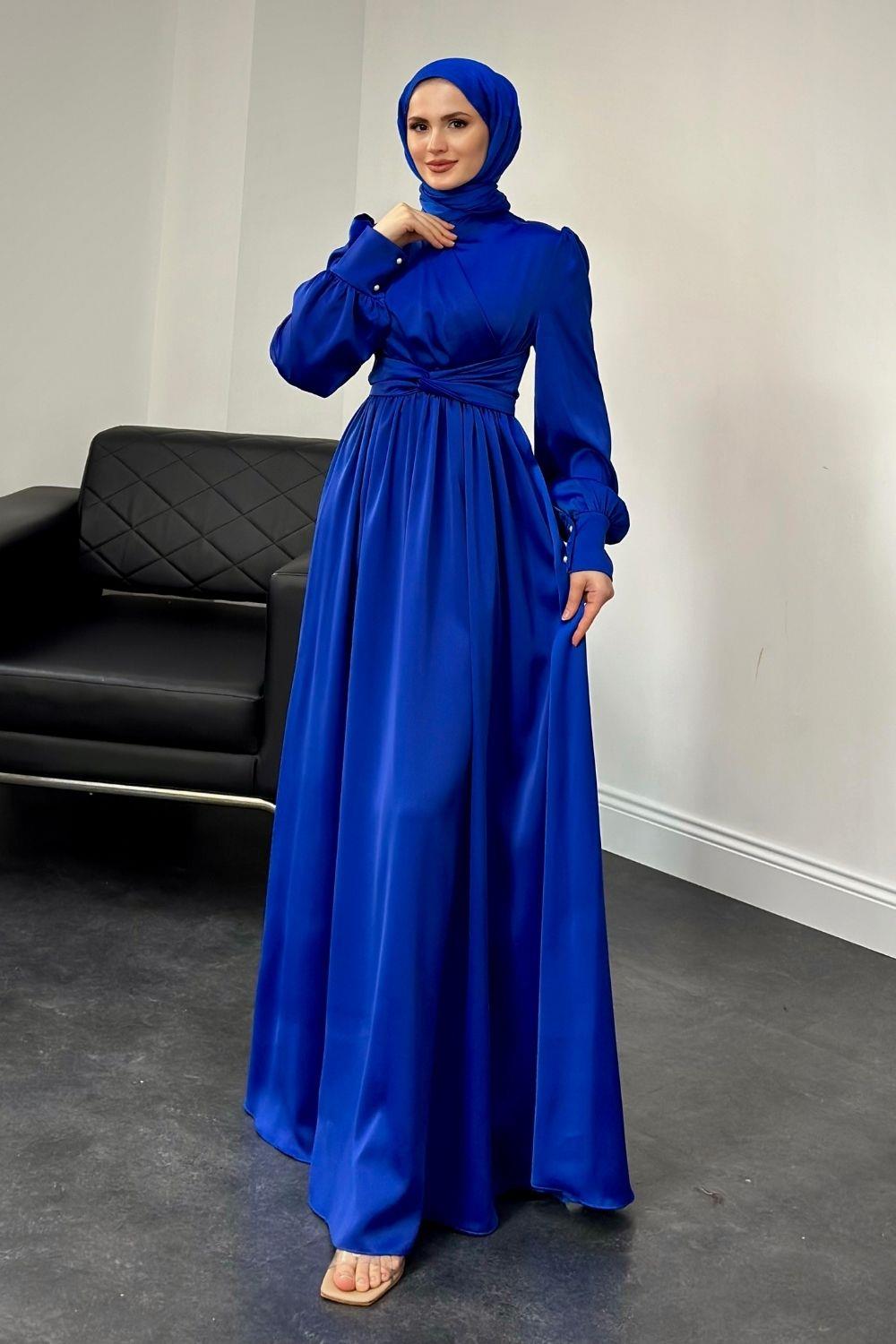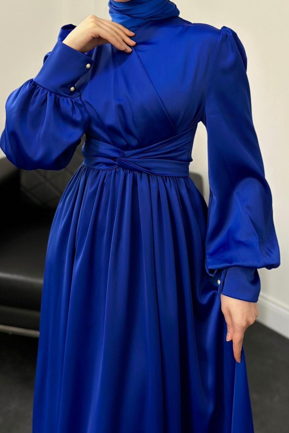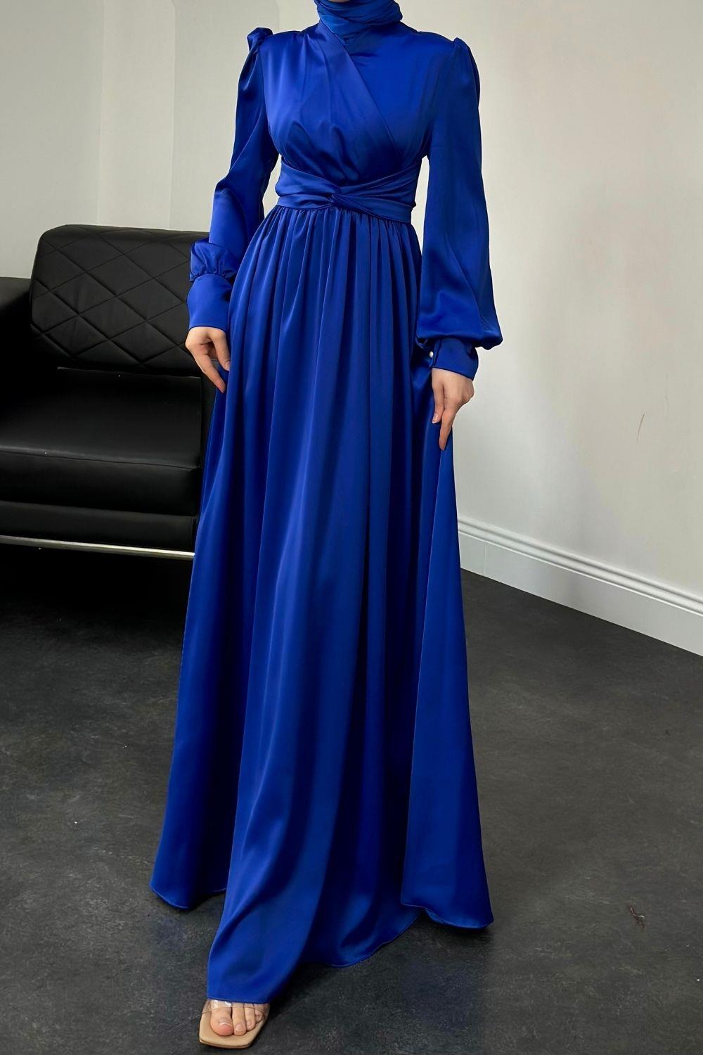 Camelia Kruvaze Yaka Saten Abiye Saks Mavisi