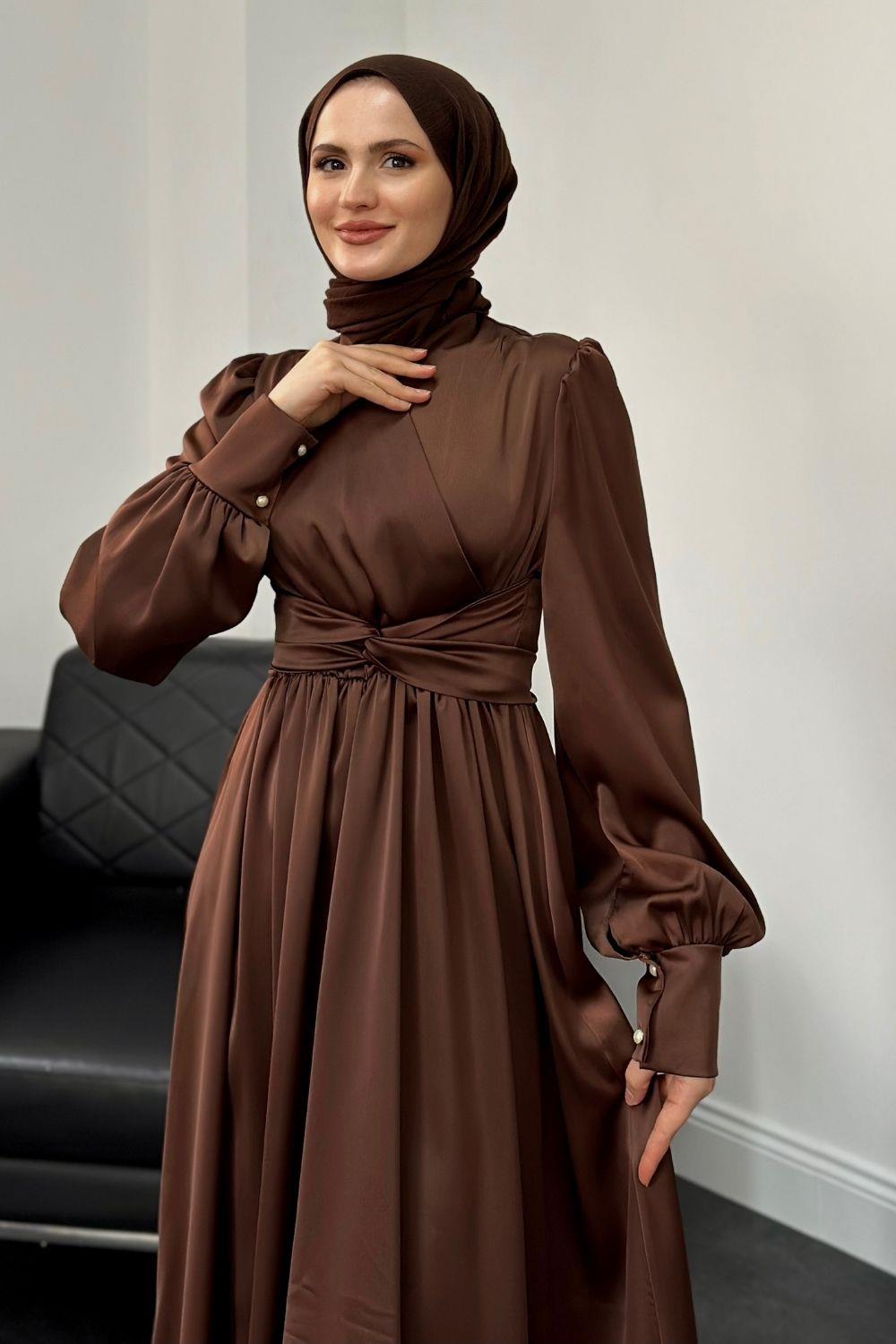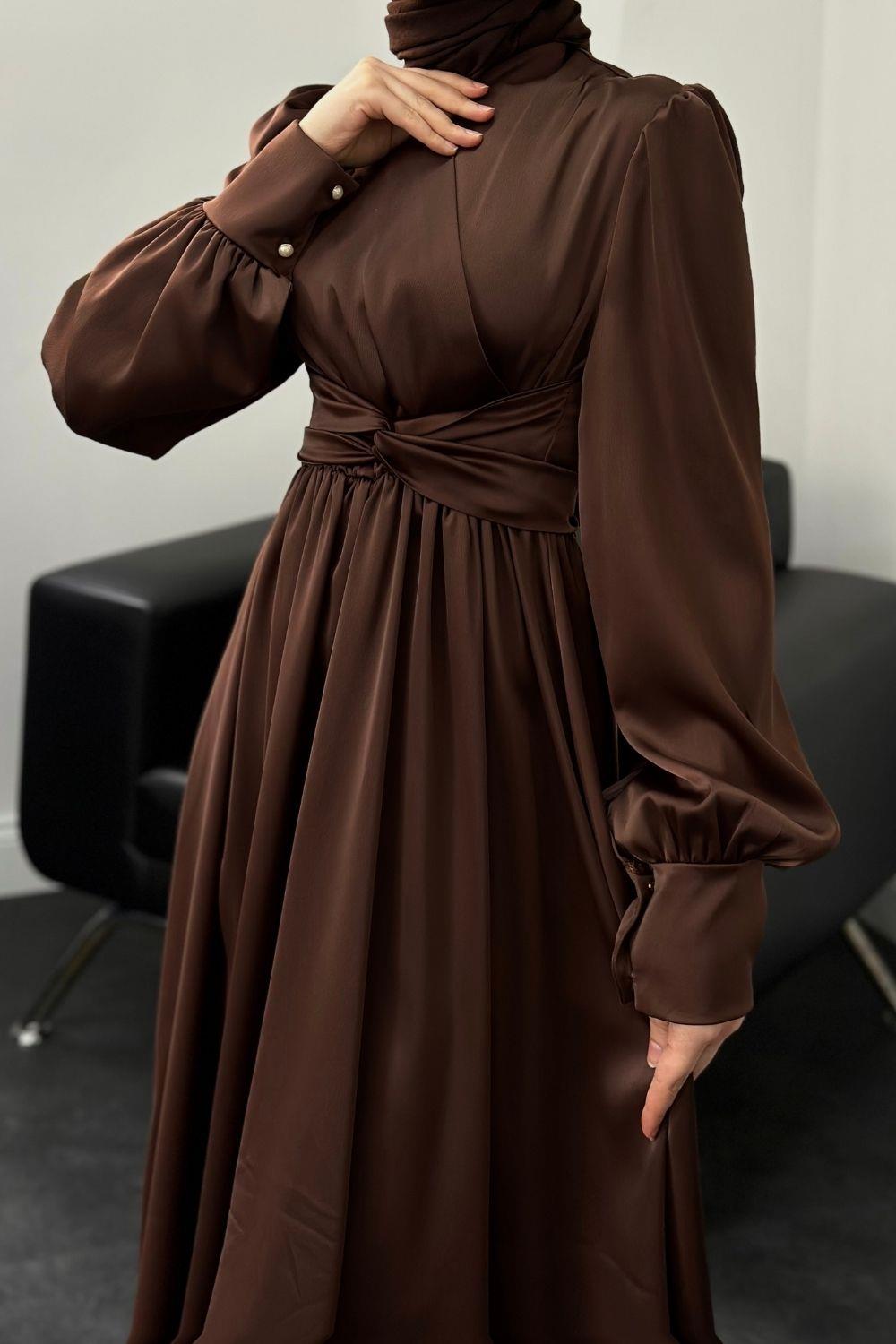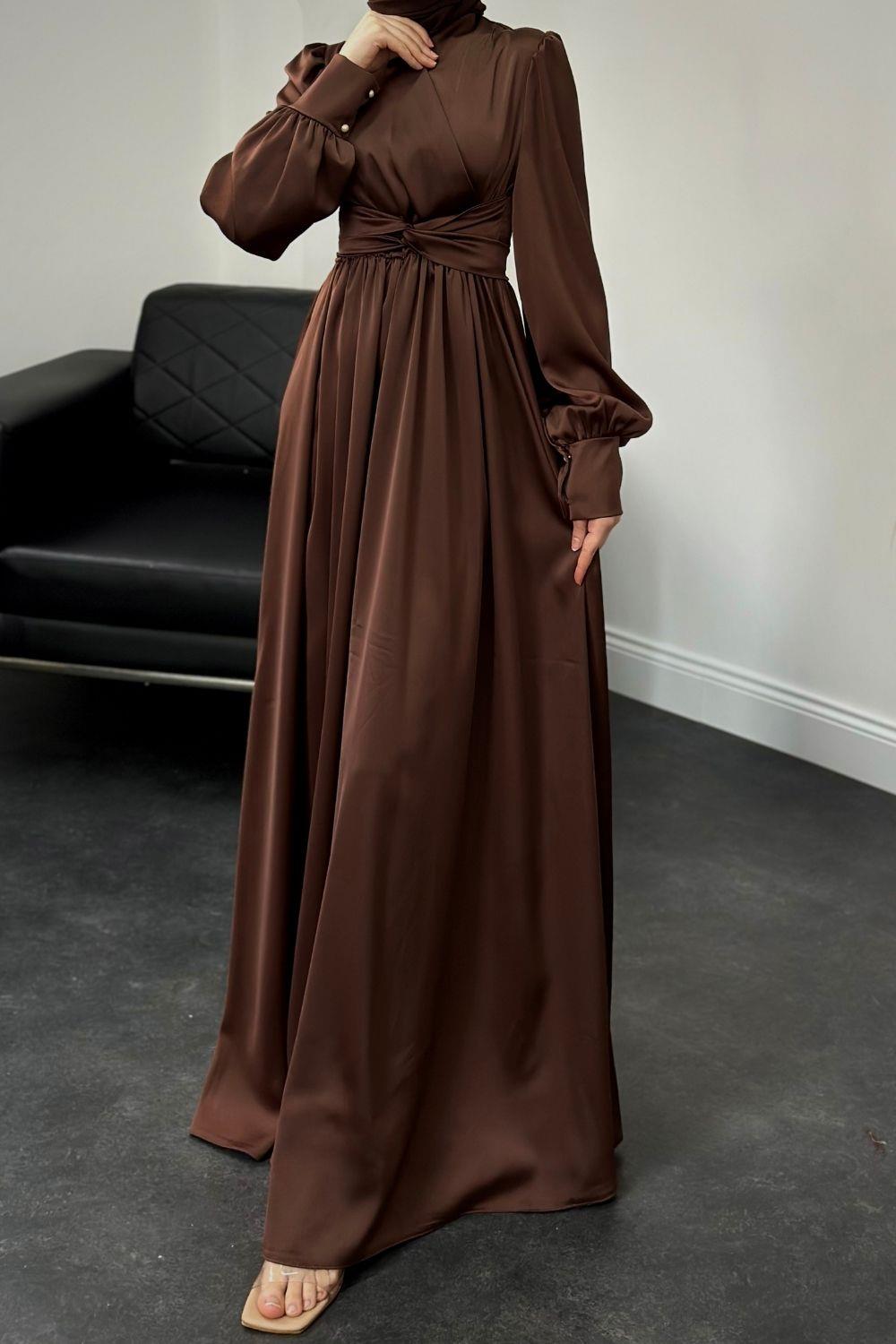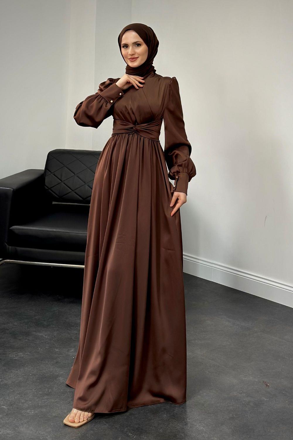 Camelia Kruvaze Yaka Saten Abiye Kahverengi