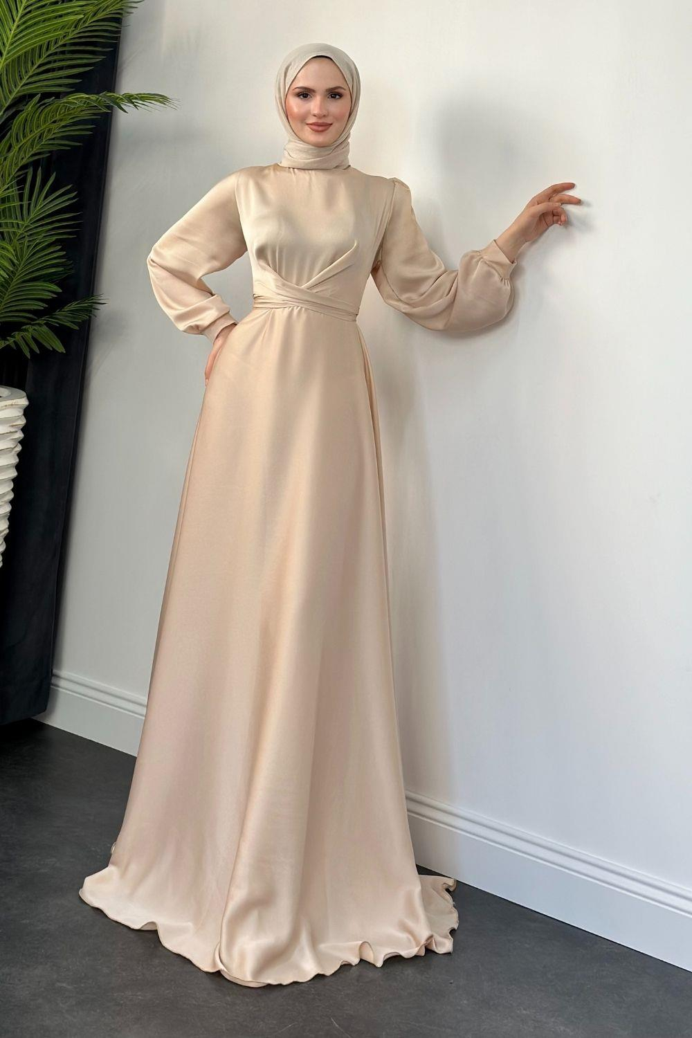 Samantha Önü Çapraz Detay Saten Abiye Krem