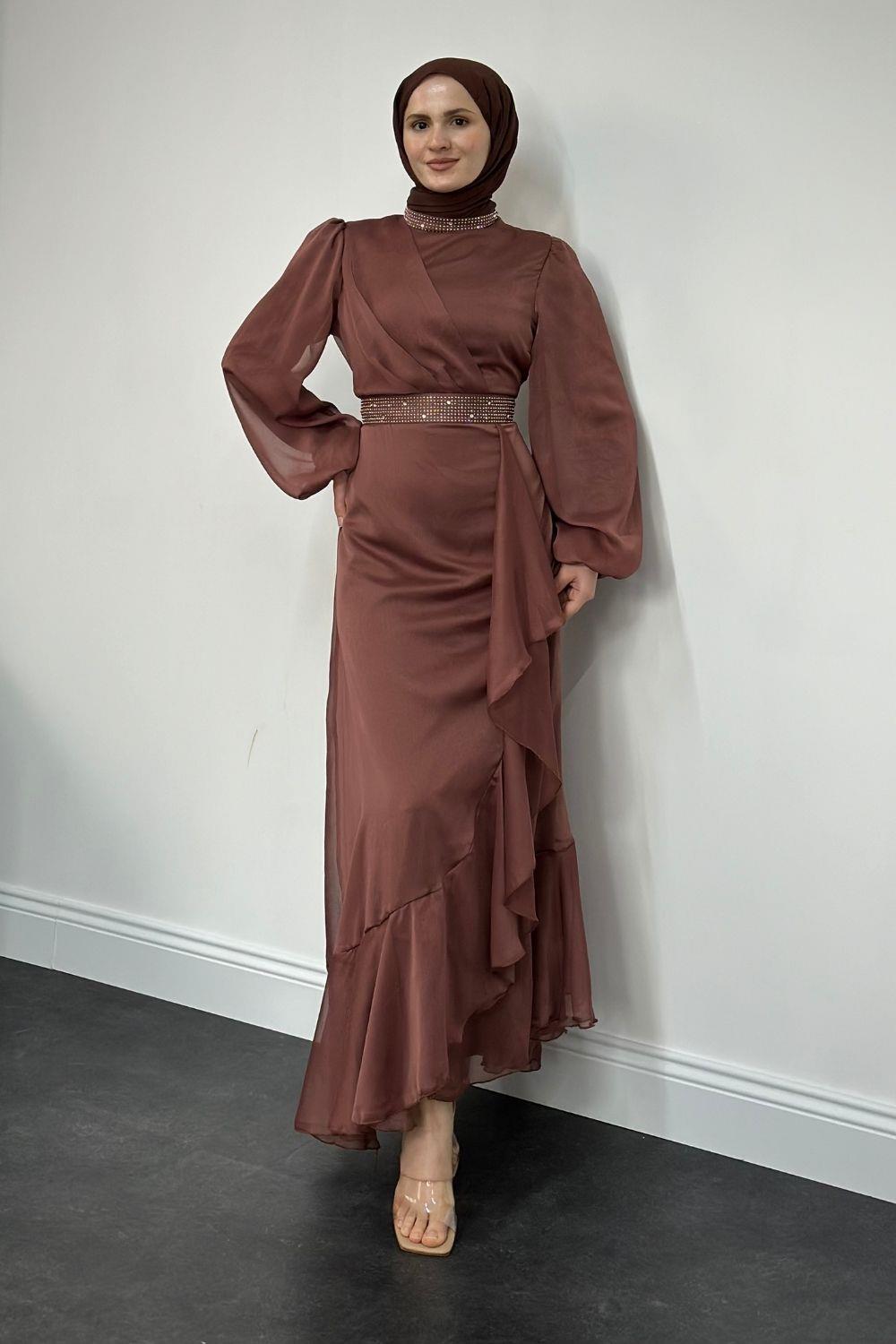 Efruz Janjan Önü Fırfır Abiye Kahverengi