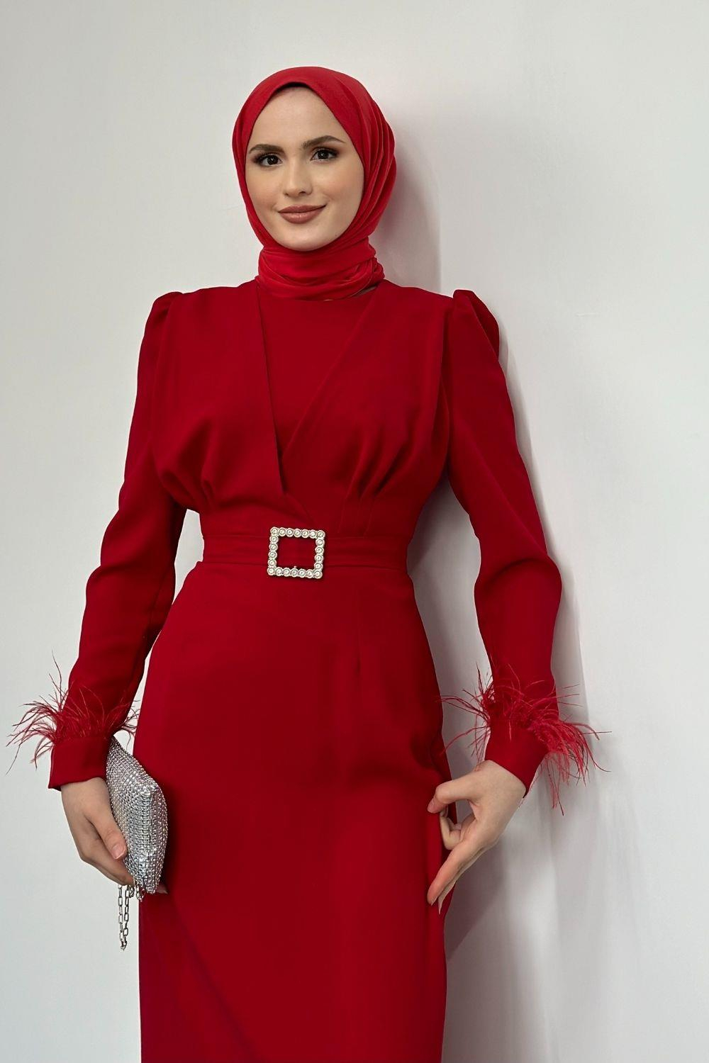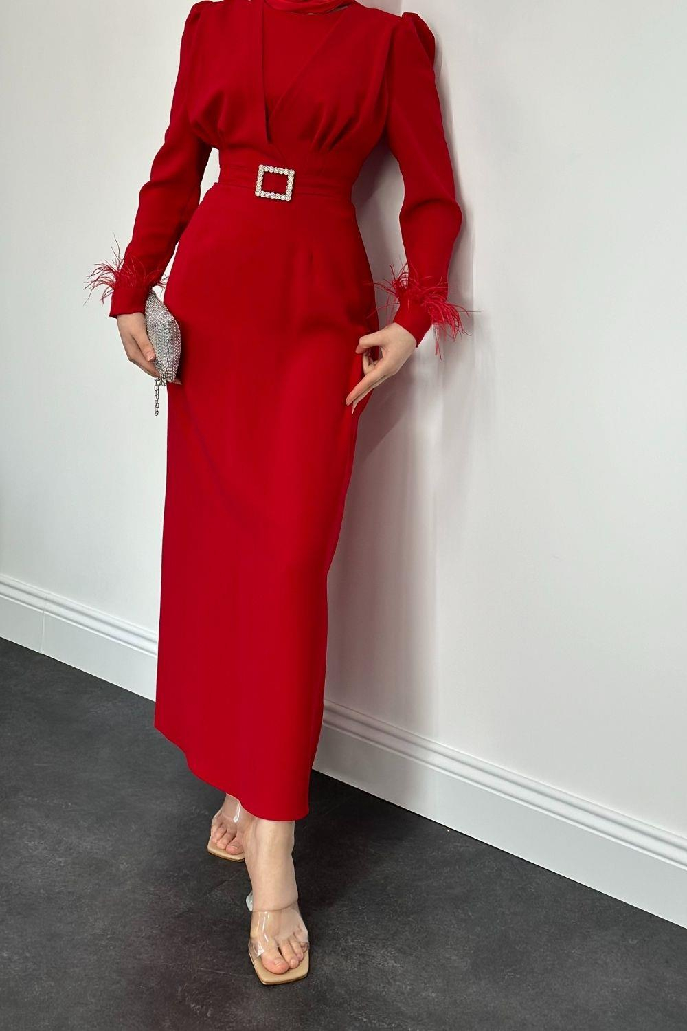 Stell Kolları Tüy Detay Kalem Abiye Kırmızı