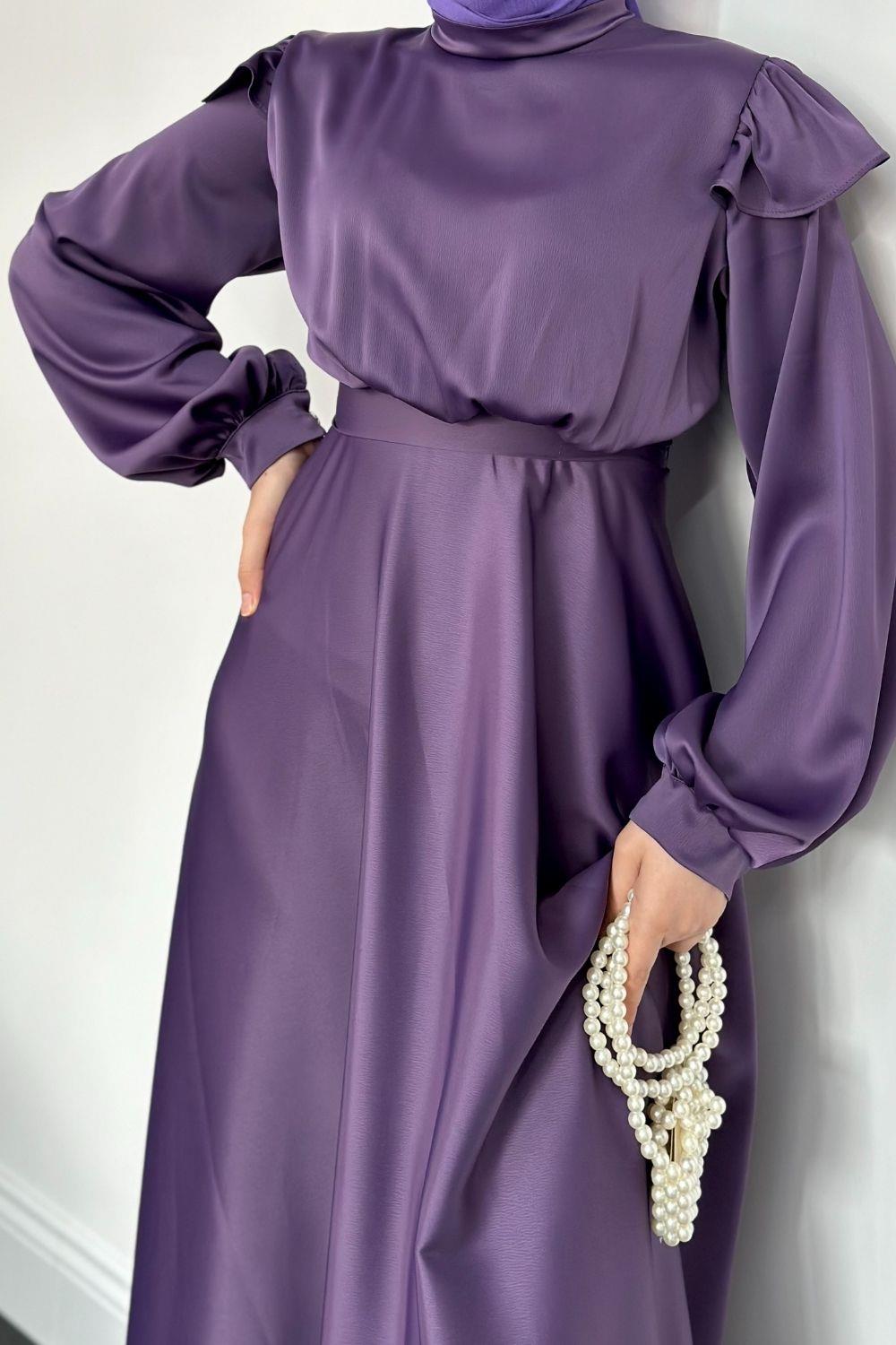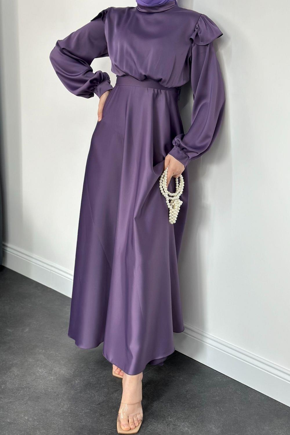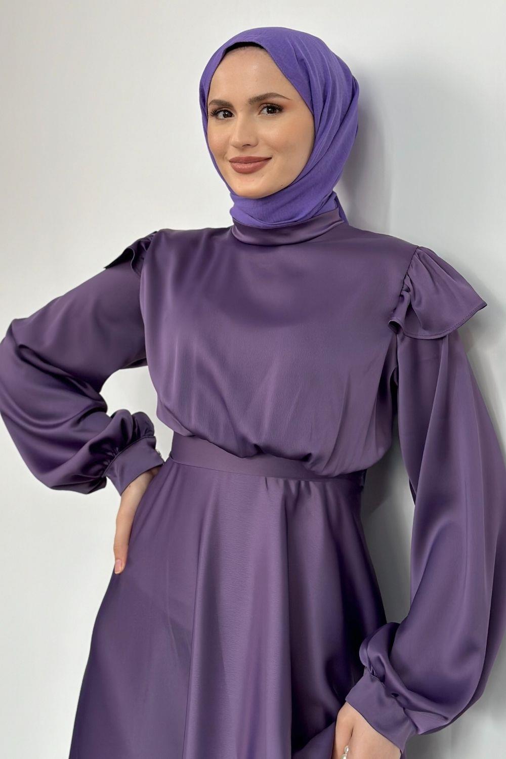 Cera Omzu Fırfır Saten Abiye Lila