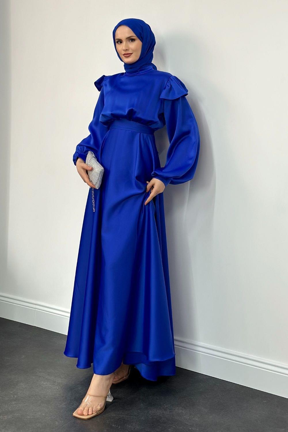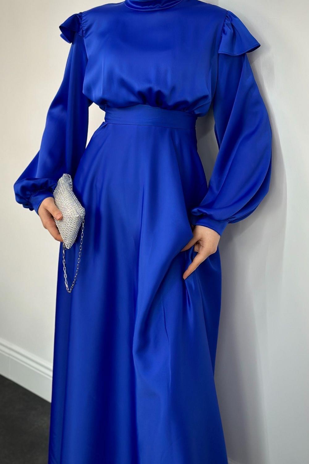 Cera Omzu Fırfır Saten Abiye Saks Mavisi
