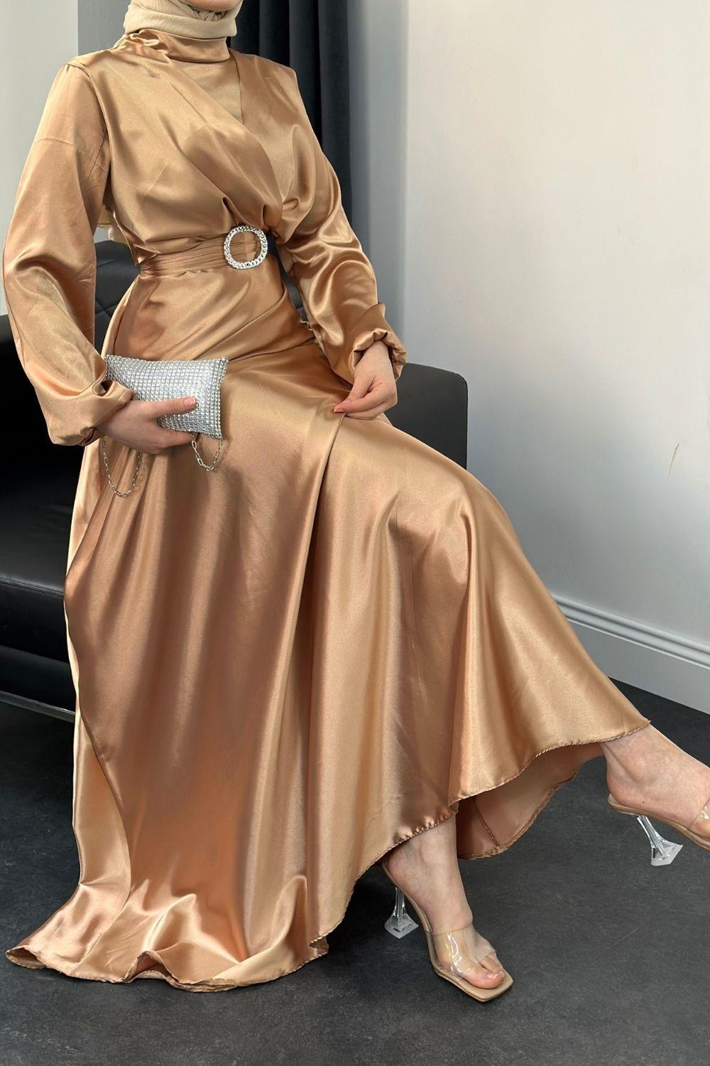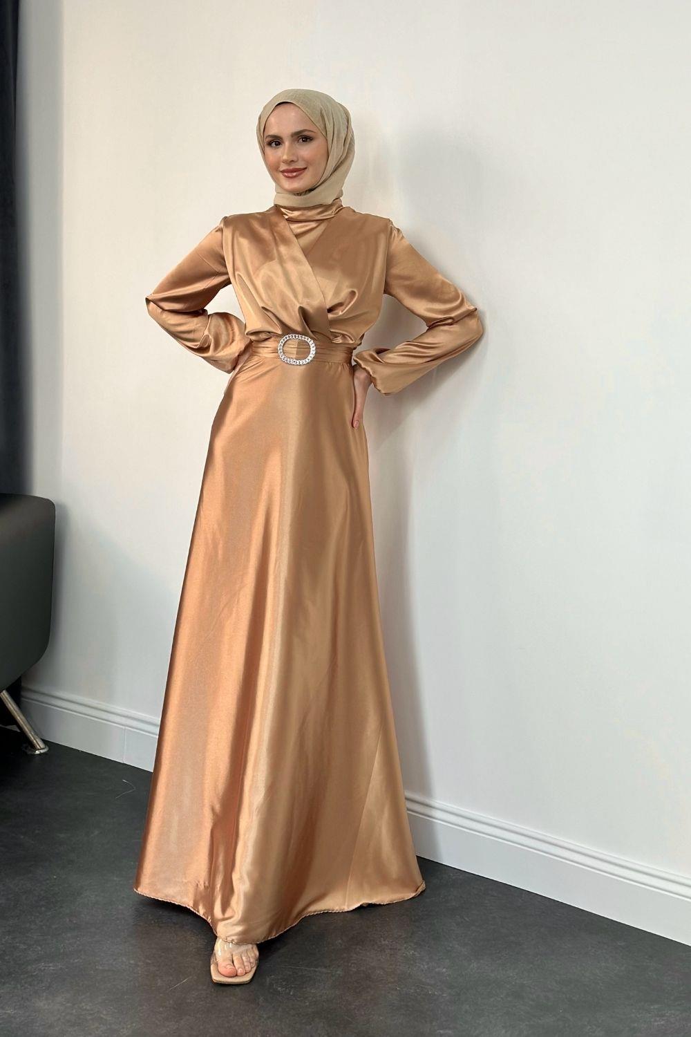 Monorika Önü Çapraz Kemerli Saten Abiye Vizon