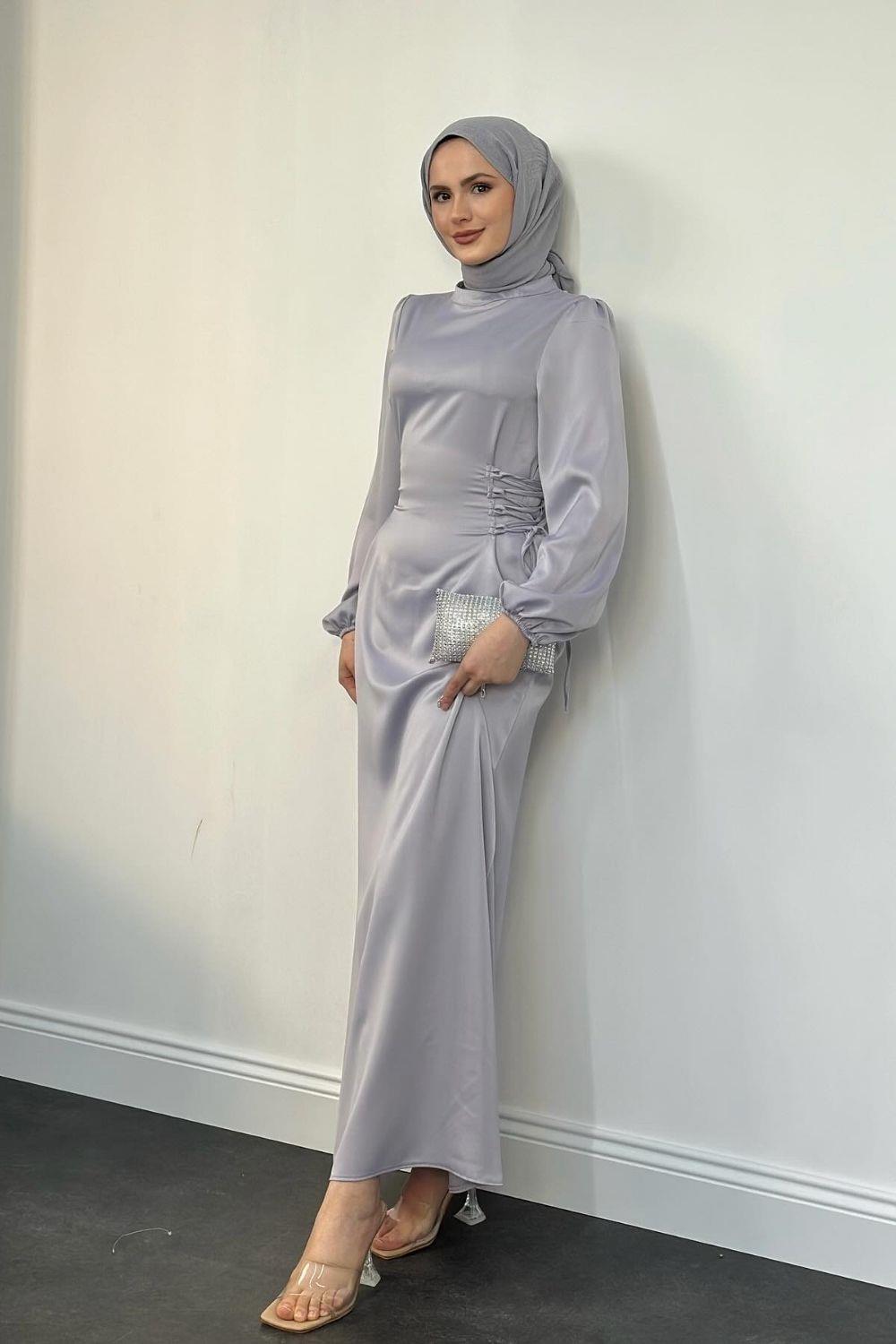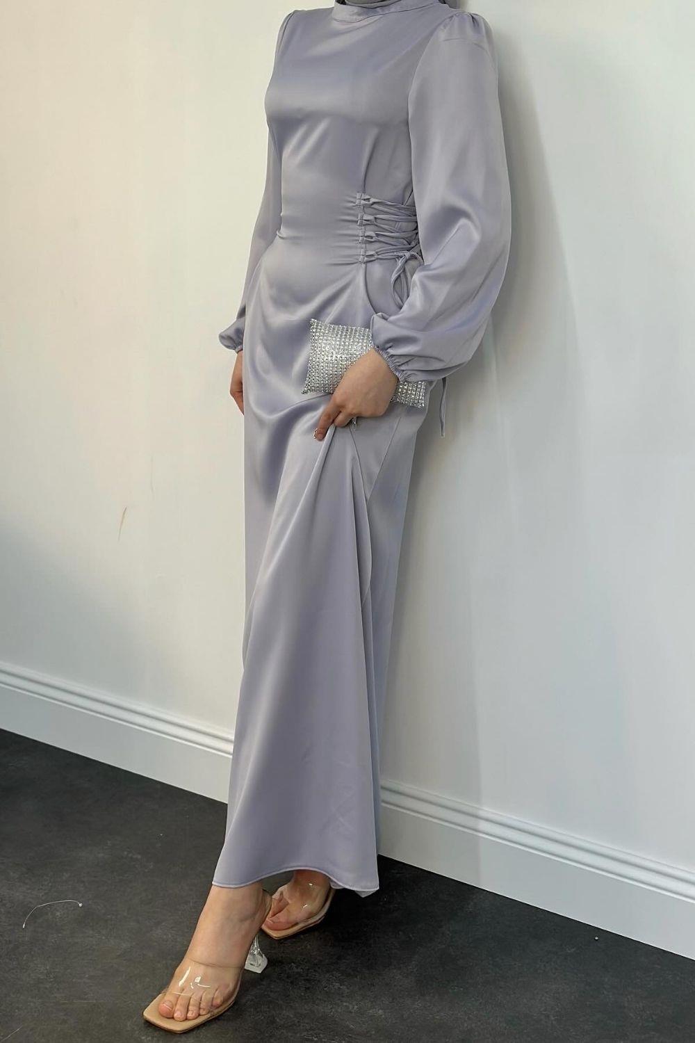 Elenor Belden Bağlamalı Saten Tesettür Elbise Gri
