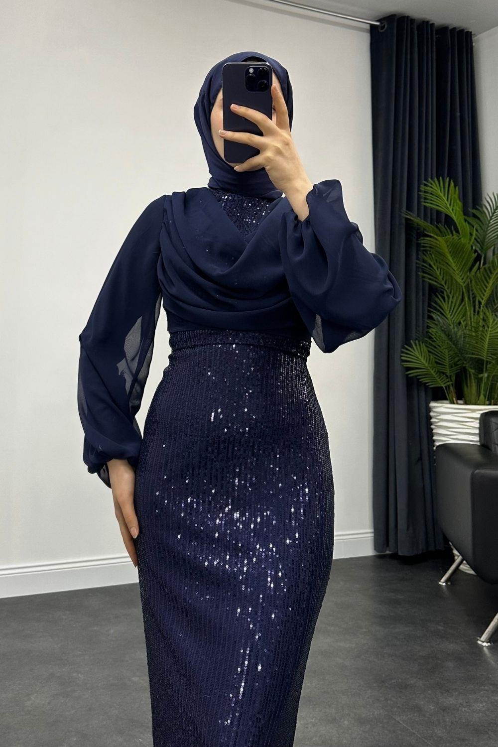 Davis Üstü Şifon Kalem Abiye Lacivert