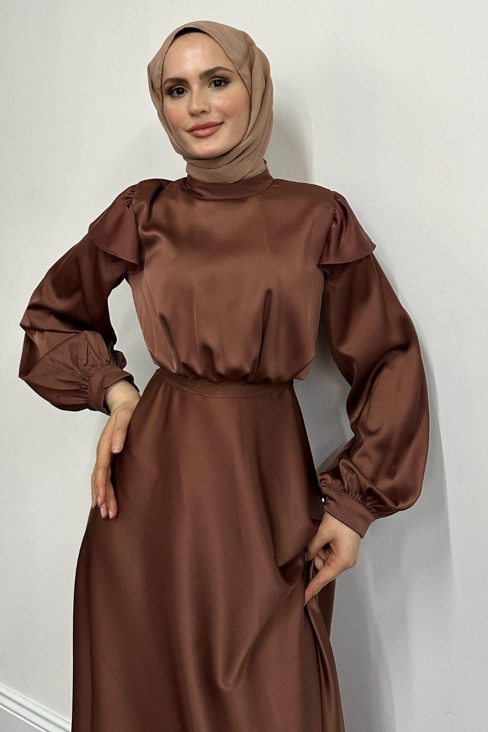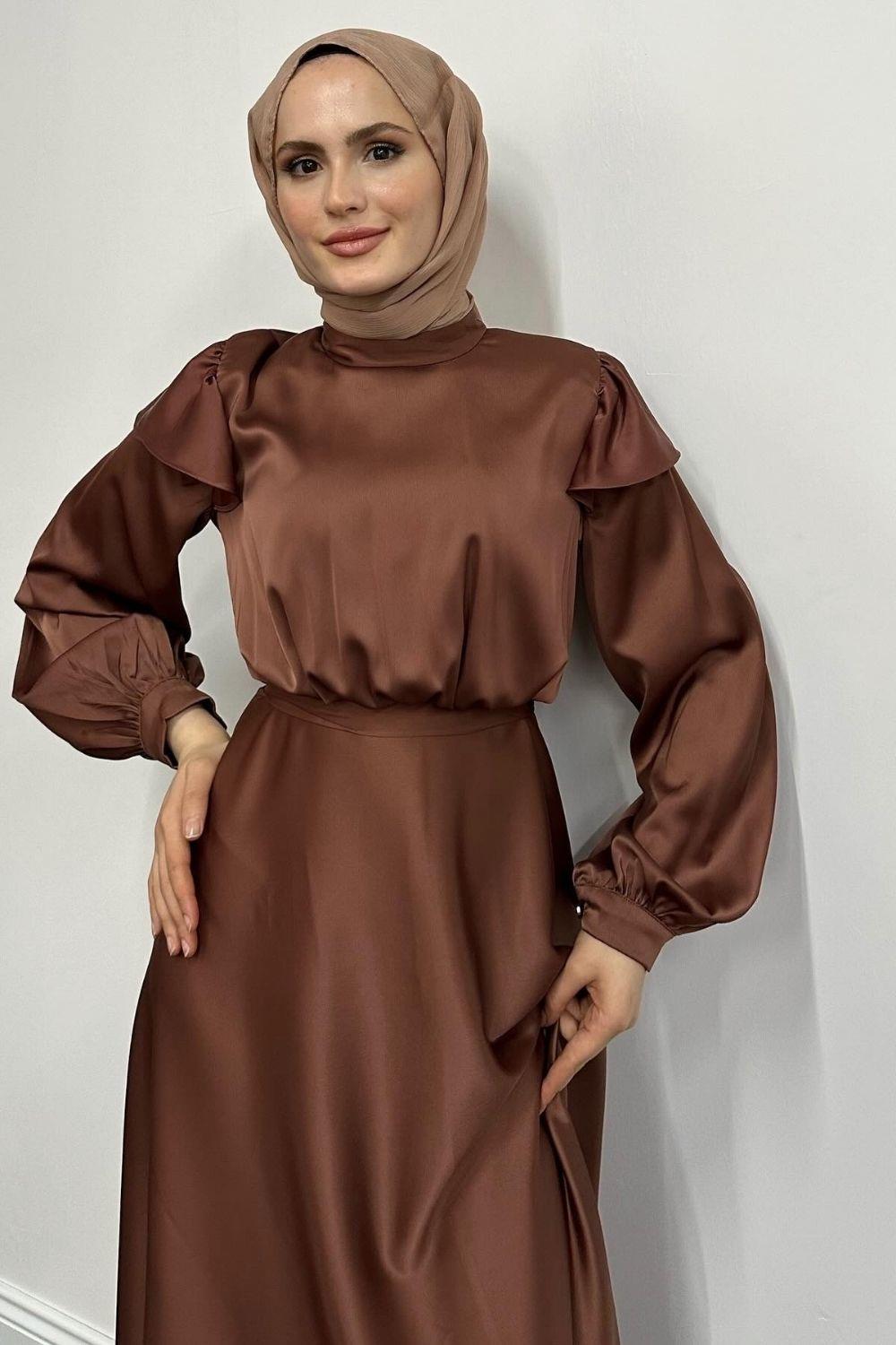 Cera Omzu Fırfır Saten Abiye Kahve