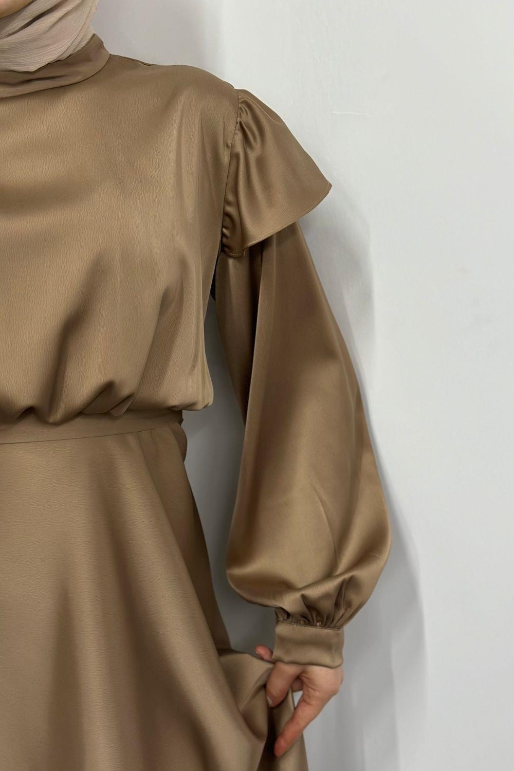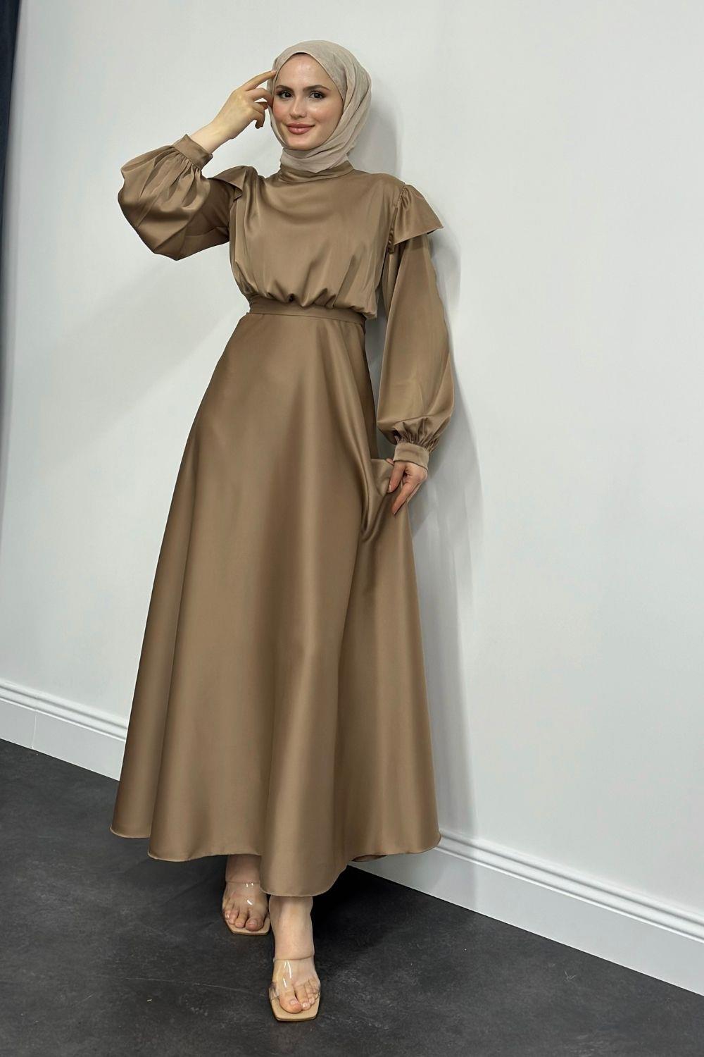 Cera Omzu Fırfır Saten Abiye Vizon