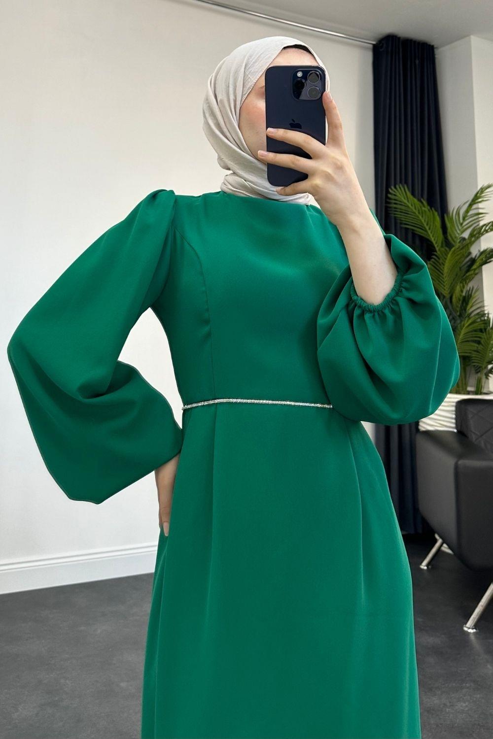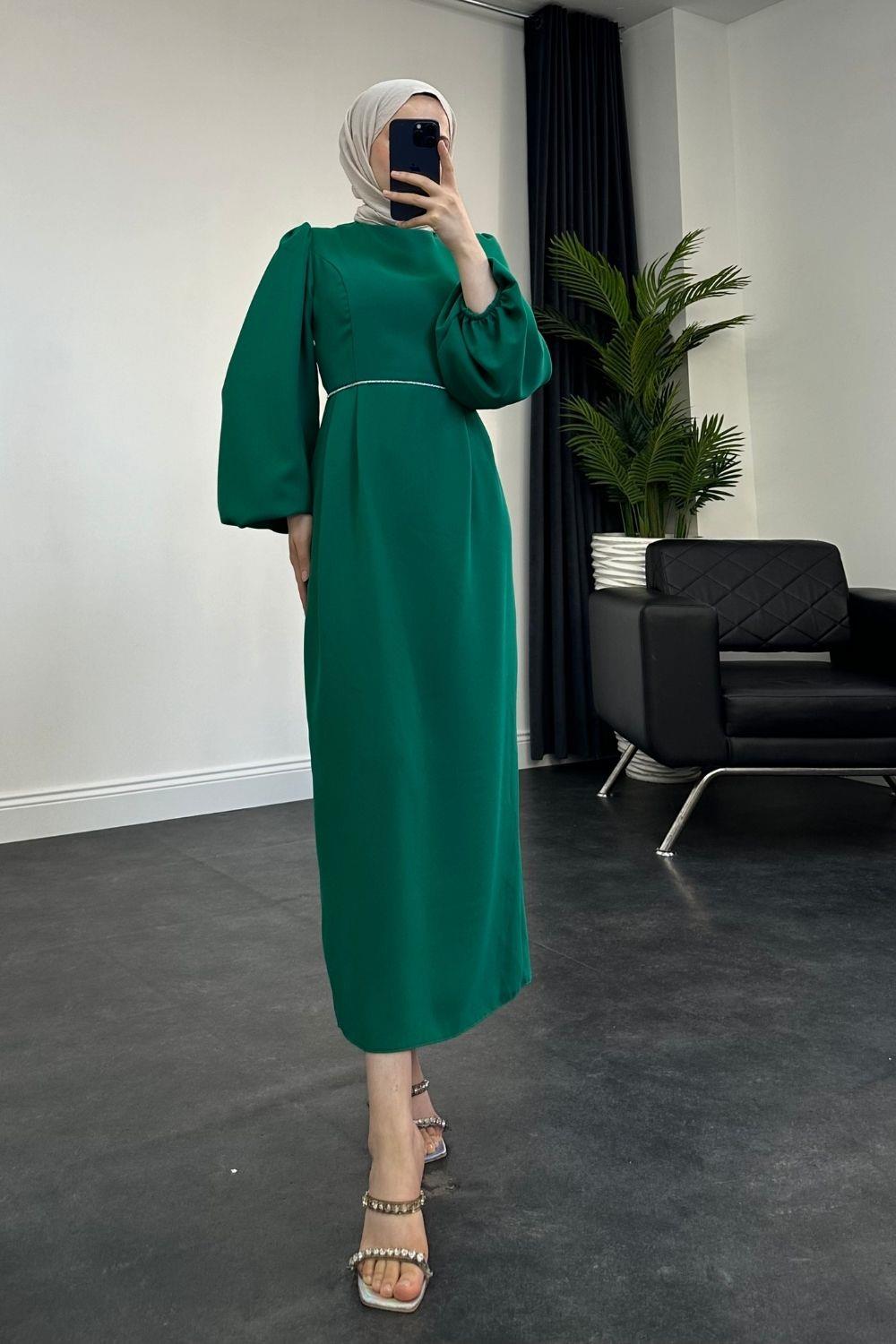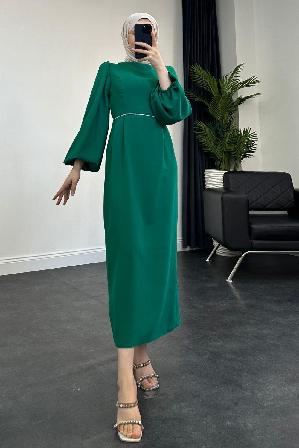 Karen Balon Kol Beli Taşlı Abiye Yeşil