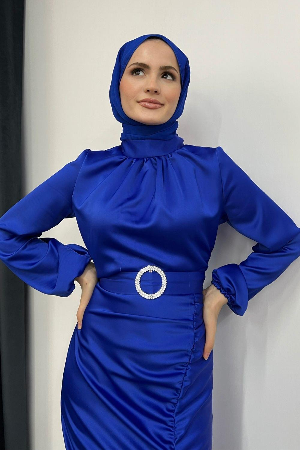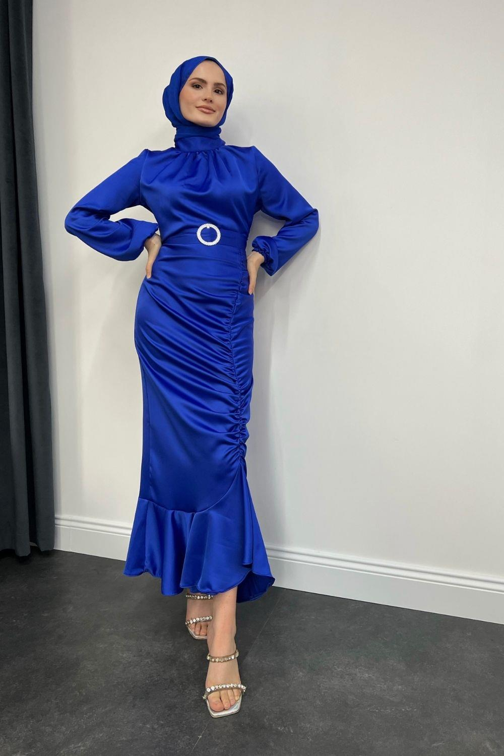 Eteği Büzgülü Kemerli Saten Abiye Saks