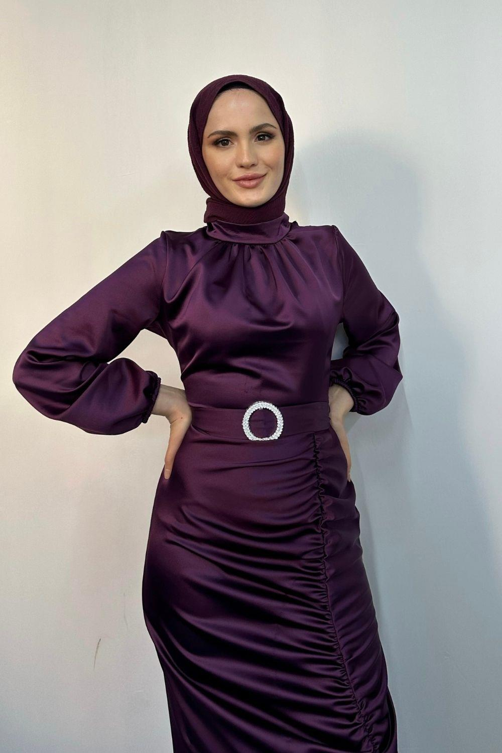 Eteği Büzgülü Kemerli Saten Abiye Mor