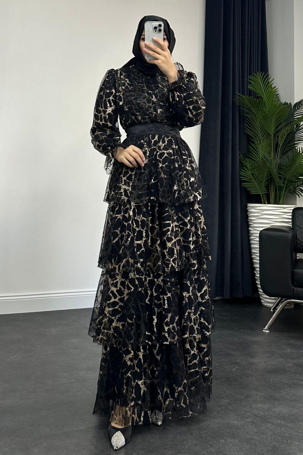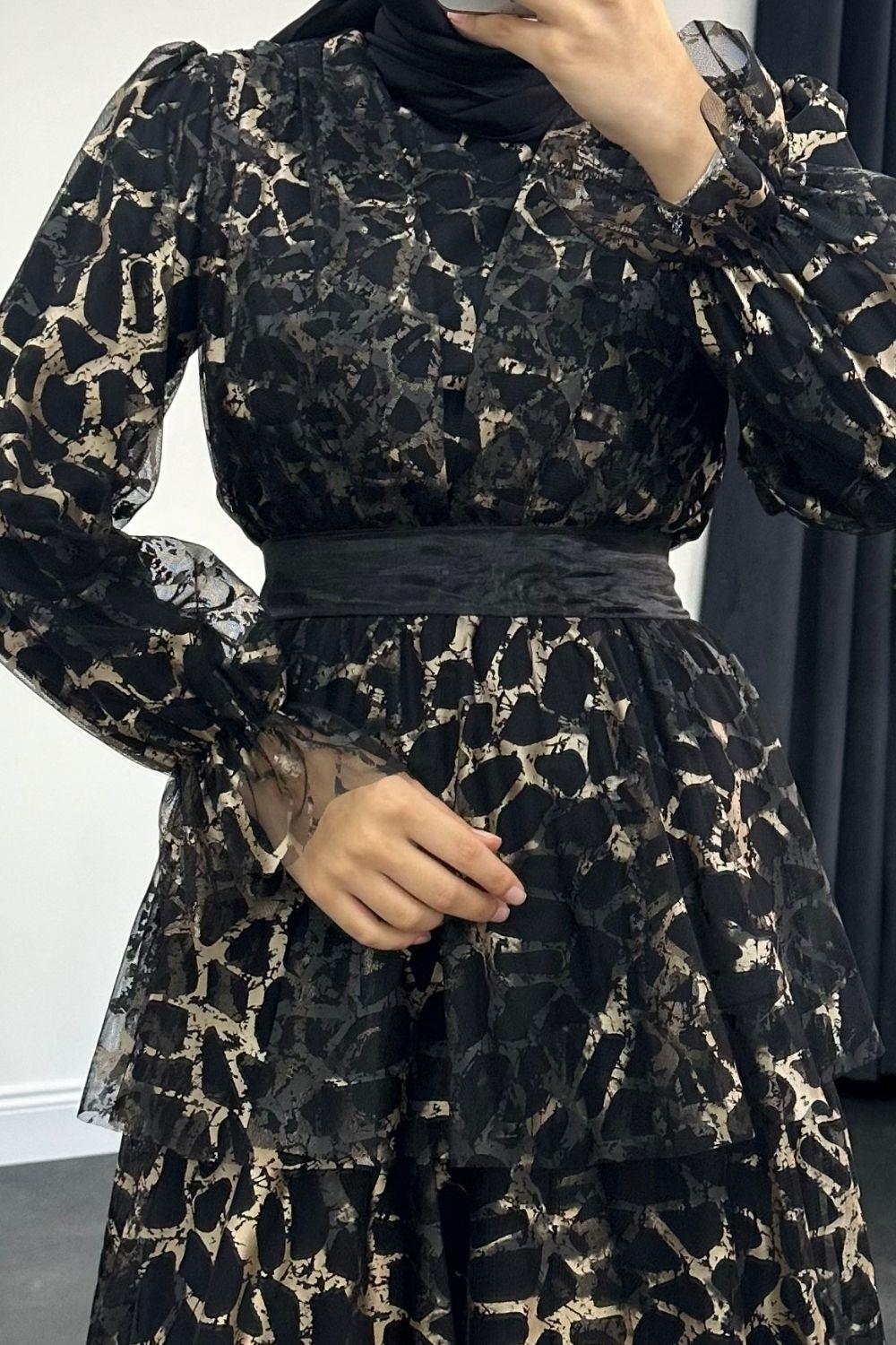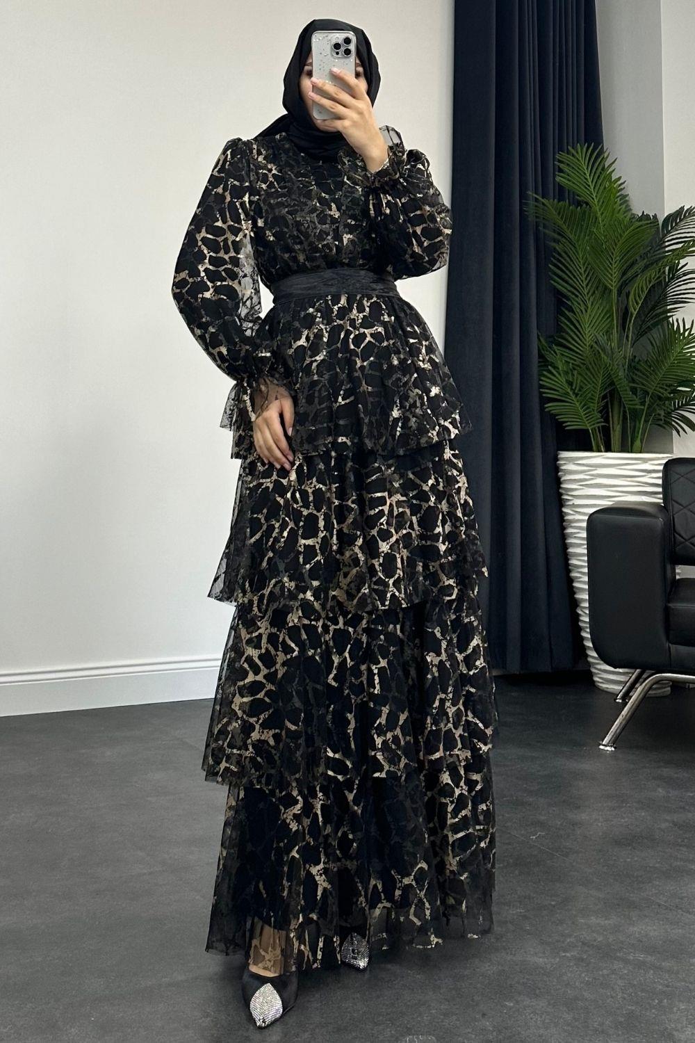 Leopar Katkat Tül Abiye Siyah
