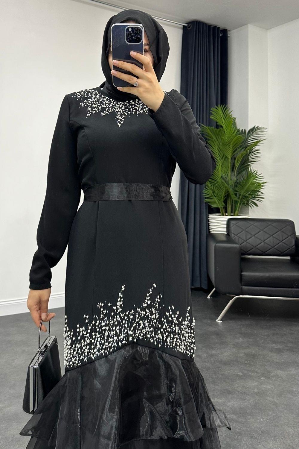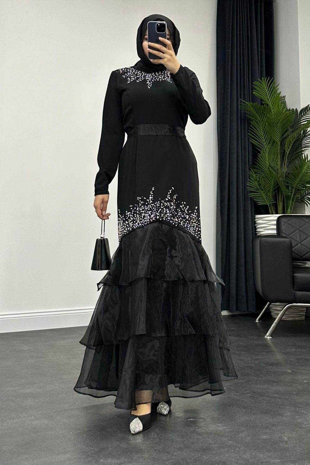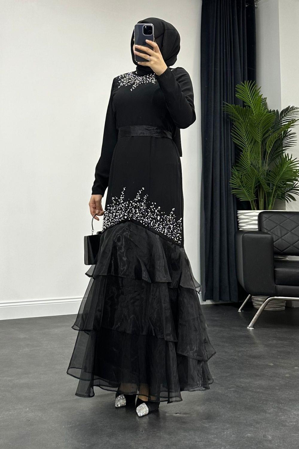 Davina Taşlı Eteği Tül Detaylı Abiye Siyah