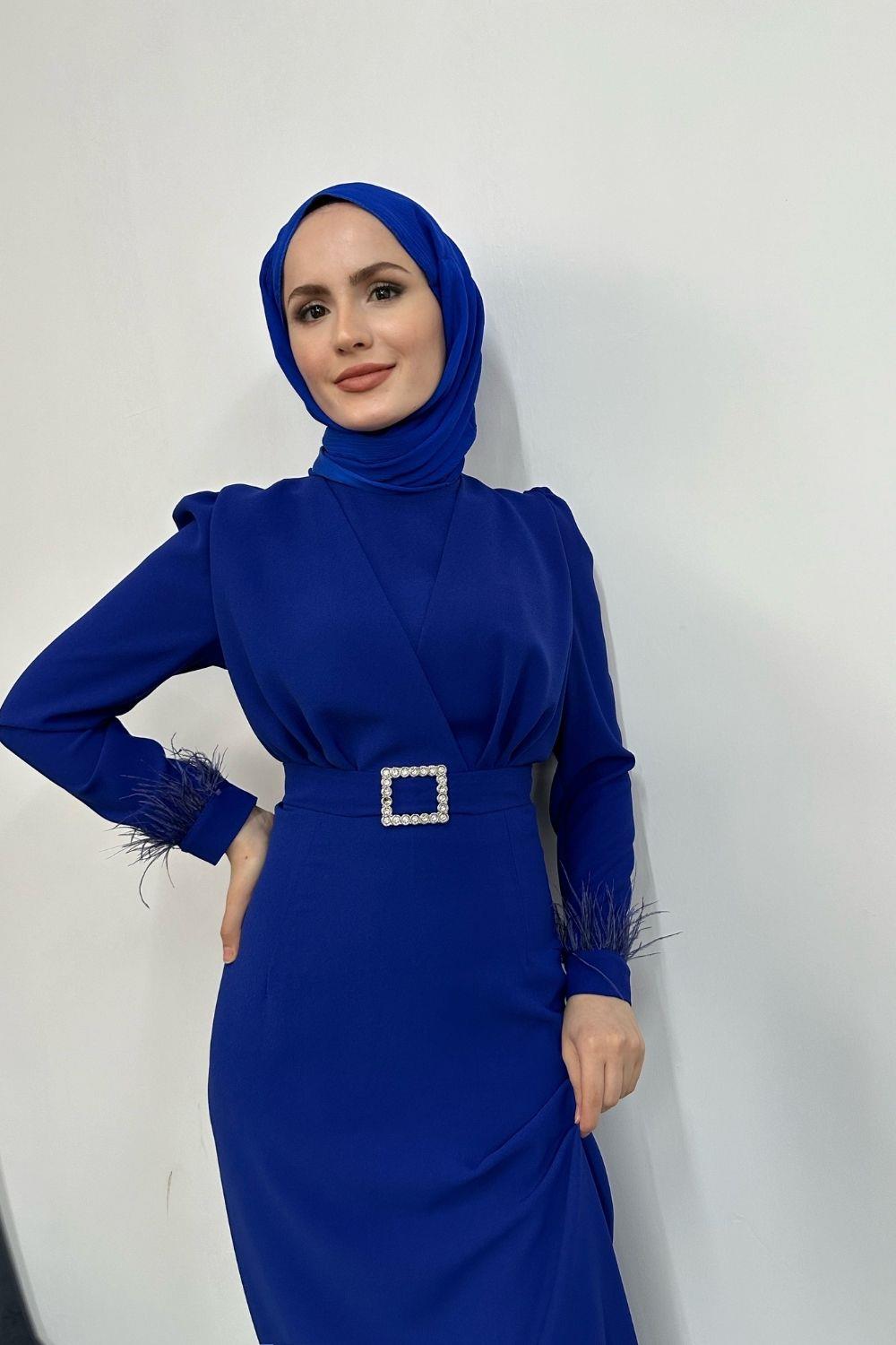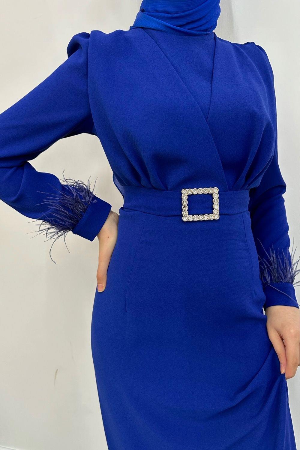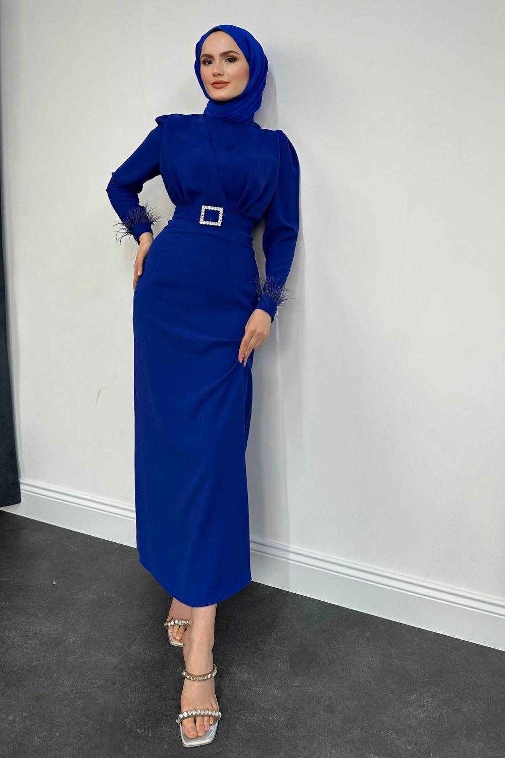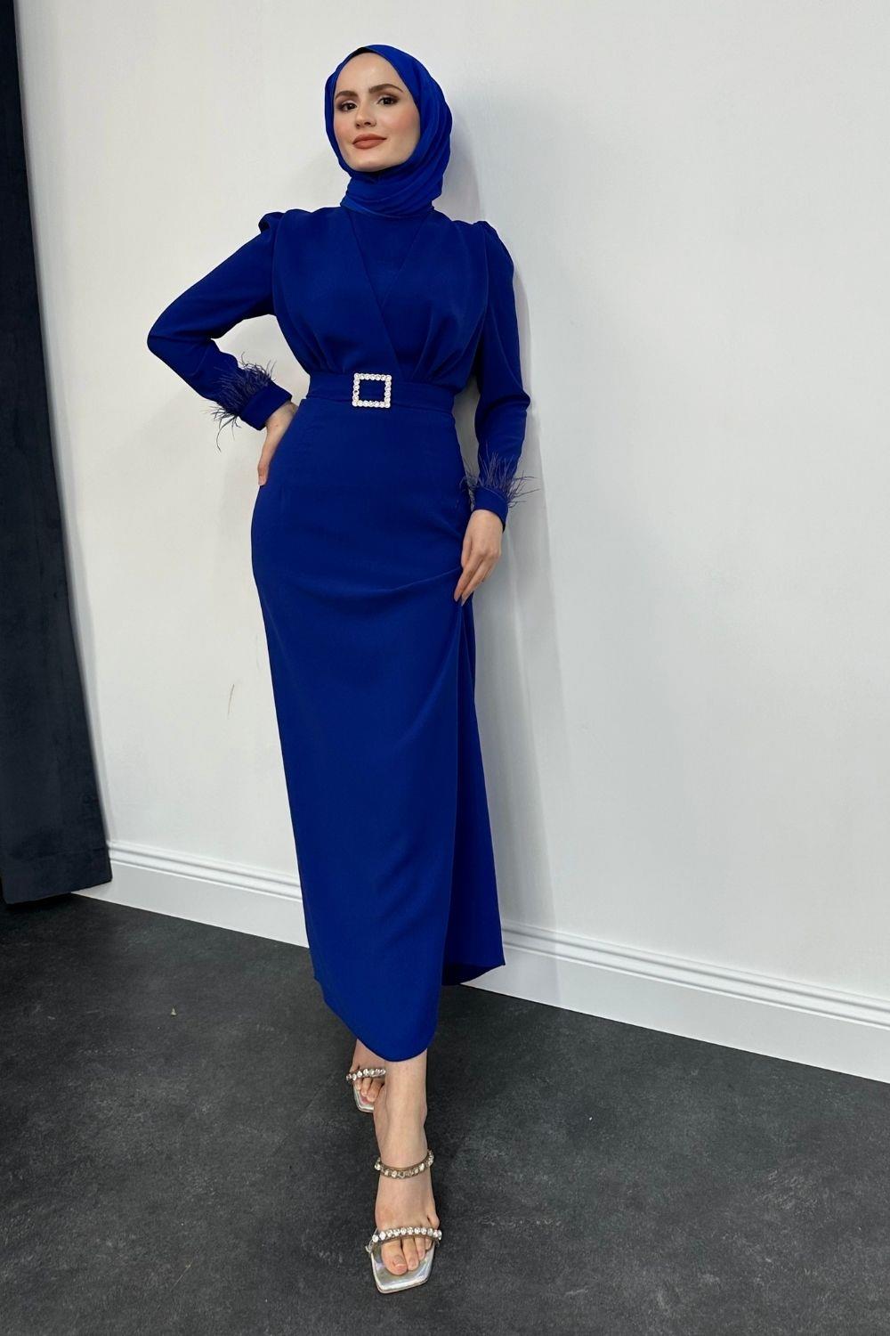 Stell Kolları Tüy Detay Kalem Abiye Saks Mavisi