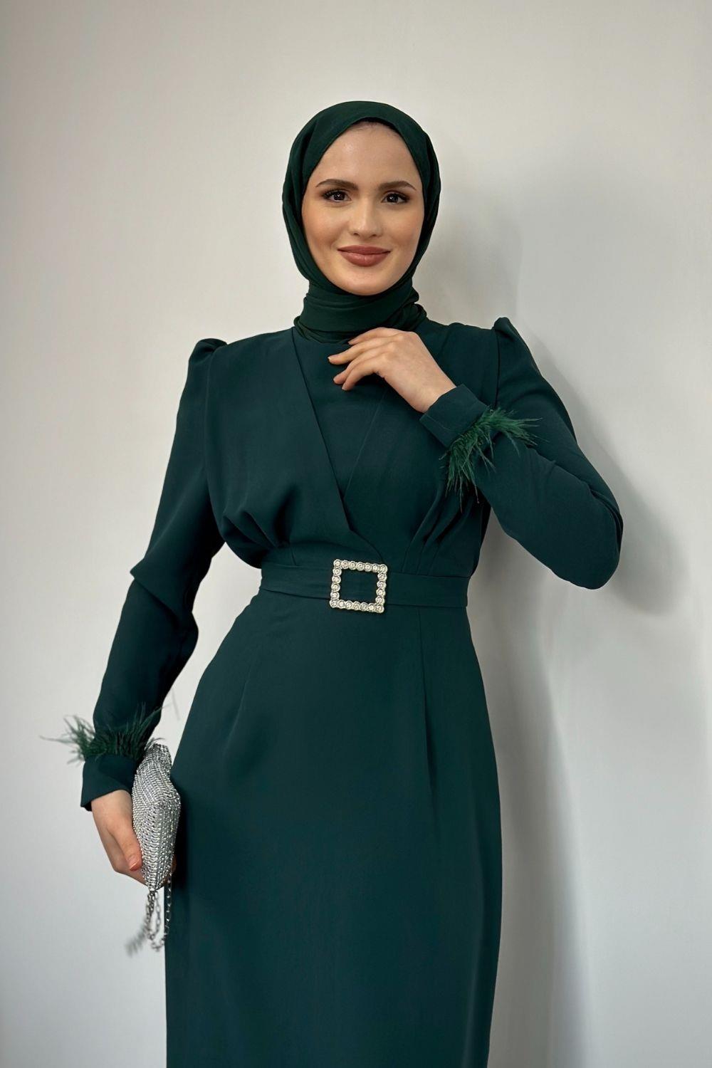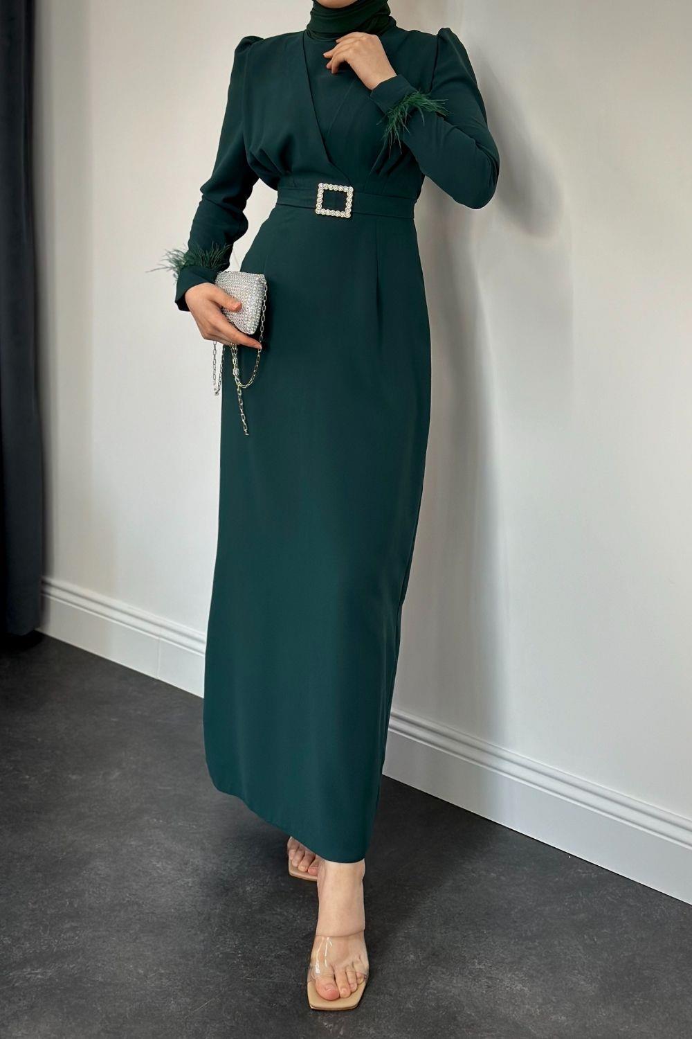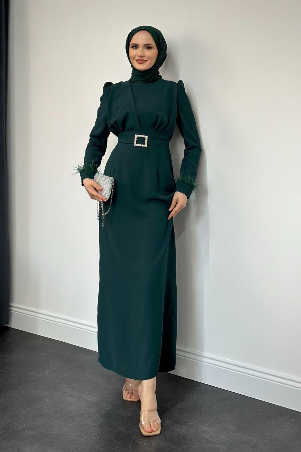 Stell Kolları Tüy Detay Kalem Abiye Zümrüt