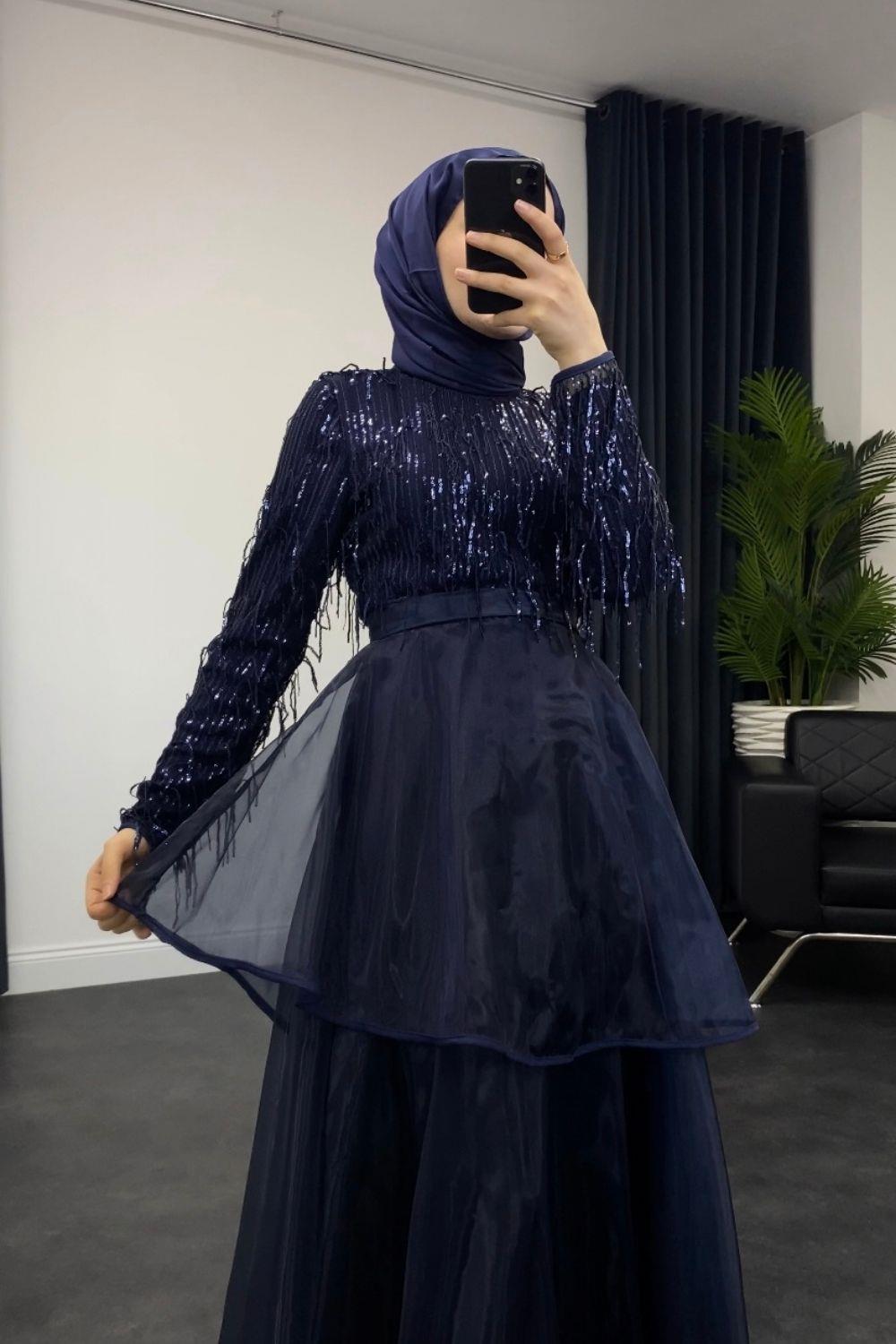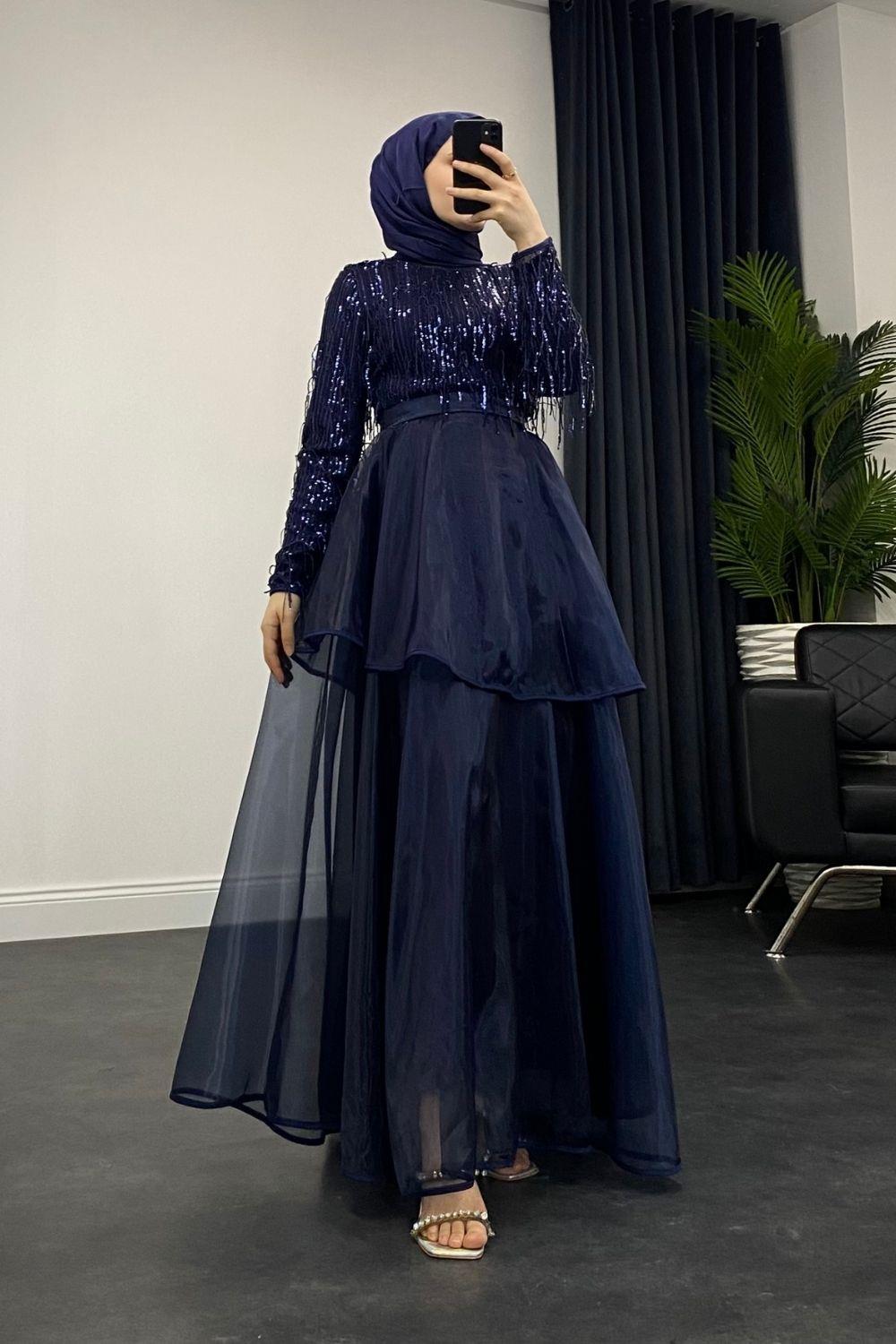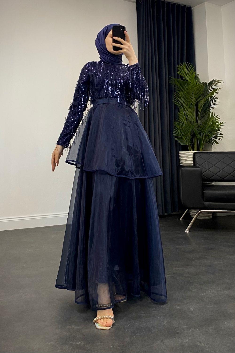 Üstü Püsküllü Altı Kat Kat Abiye Lacivert