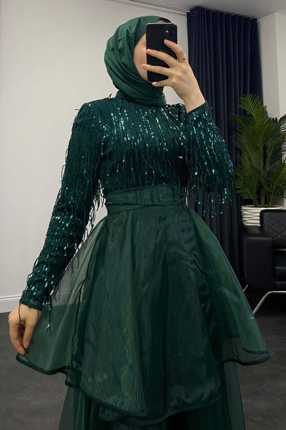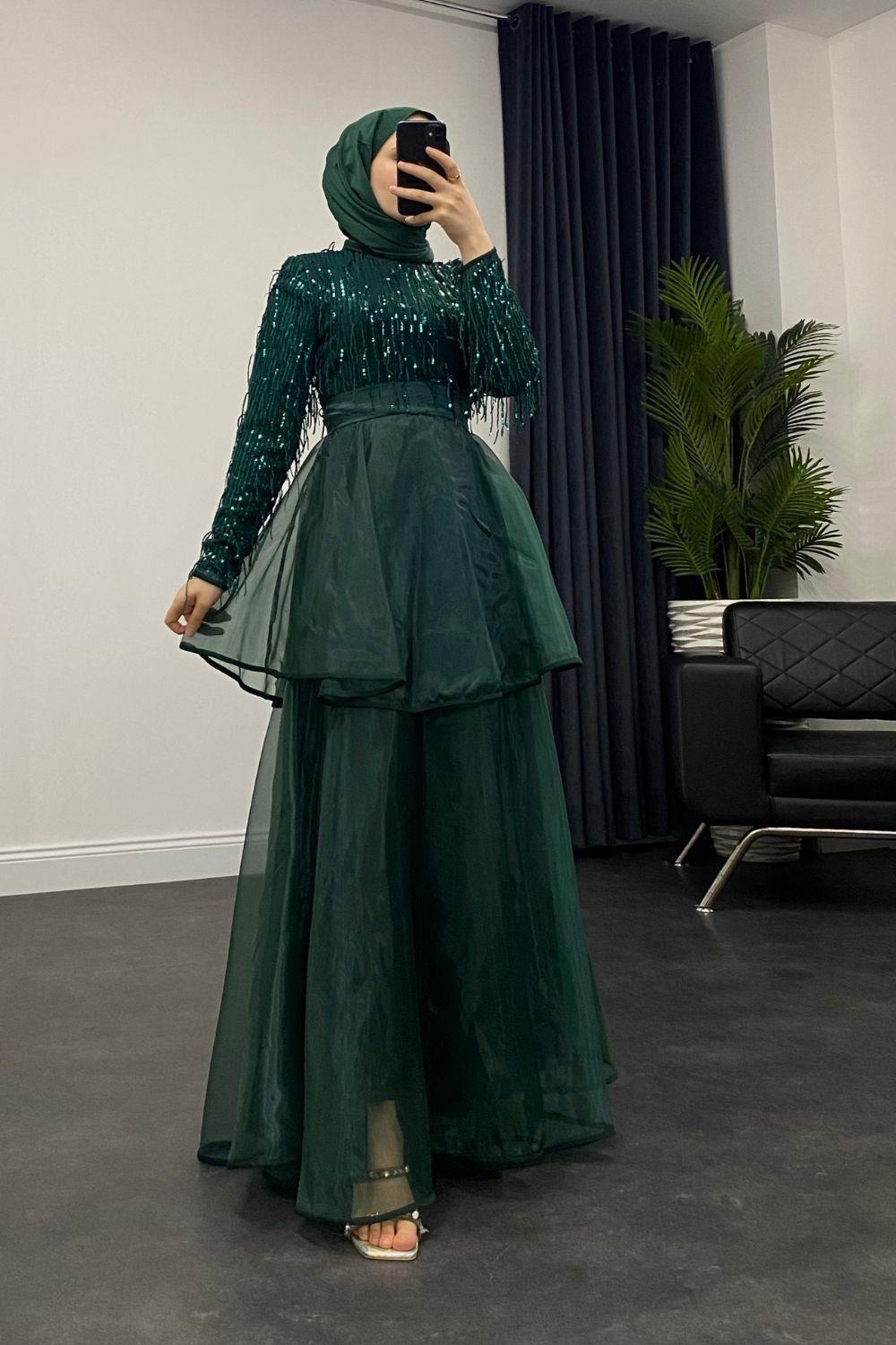 Üstü Püsküllü Altı Kat Kat Abiye Zümrüt