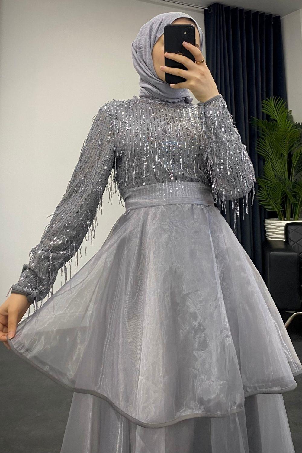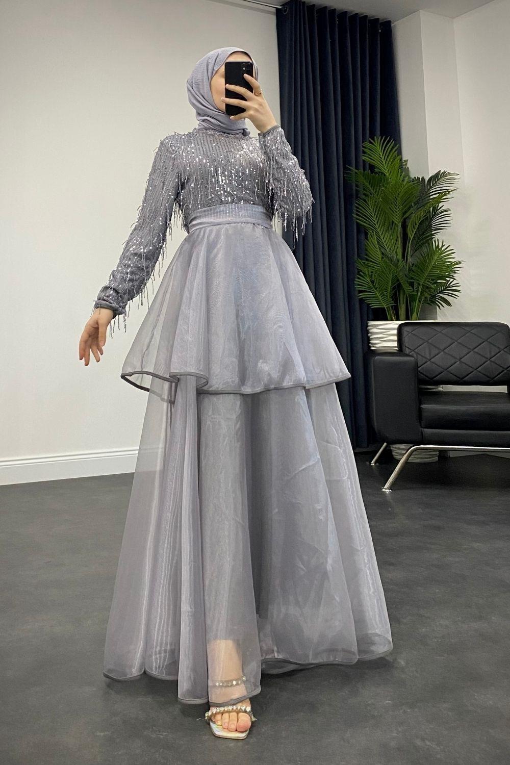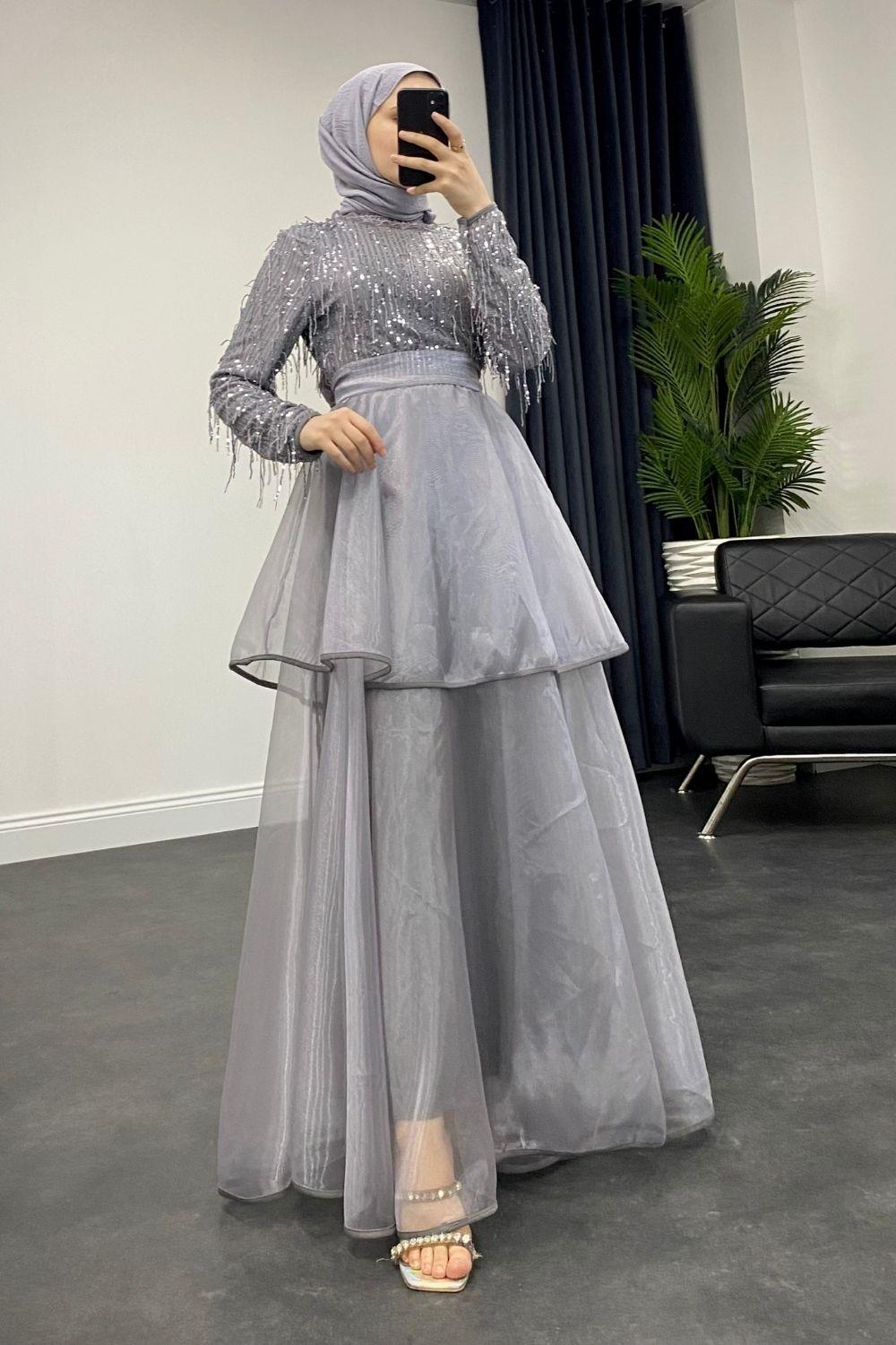 Üstü Püsküllü Altı Kat Kat Abiye Gri