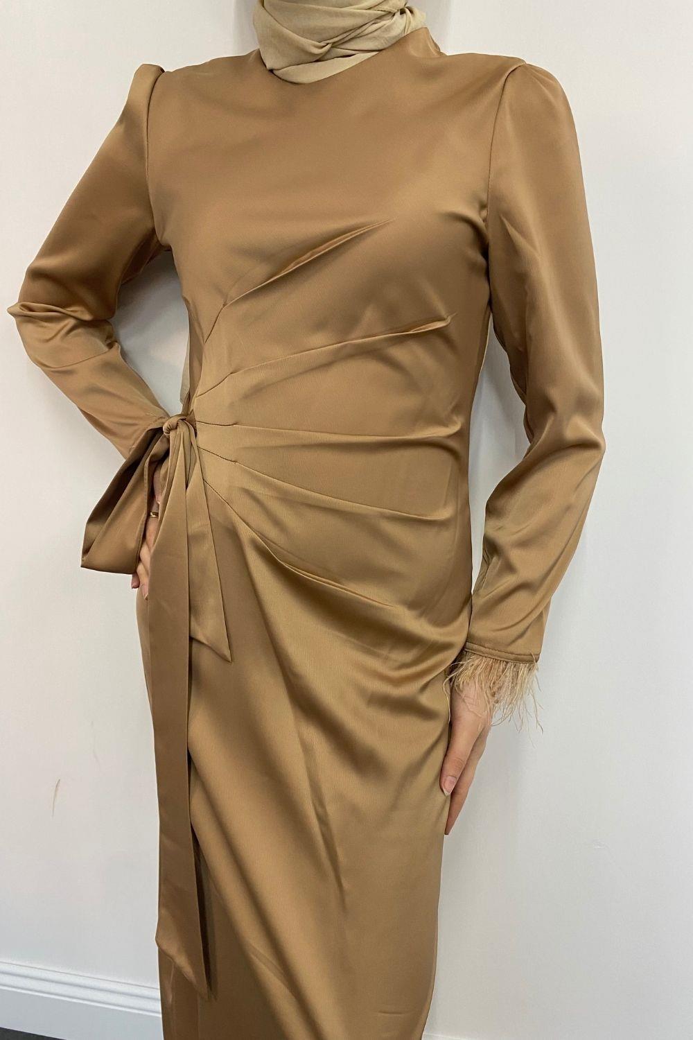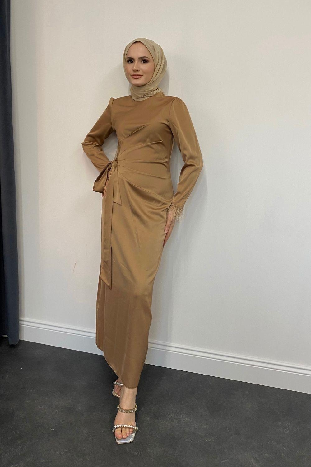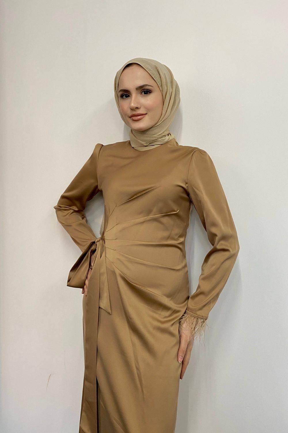 Kol Saçaklı Saten Abiye Sütlü Kahve