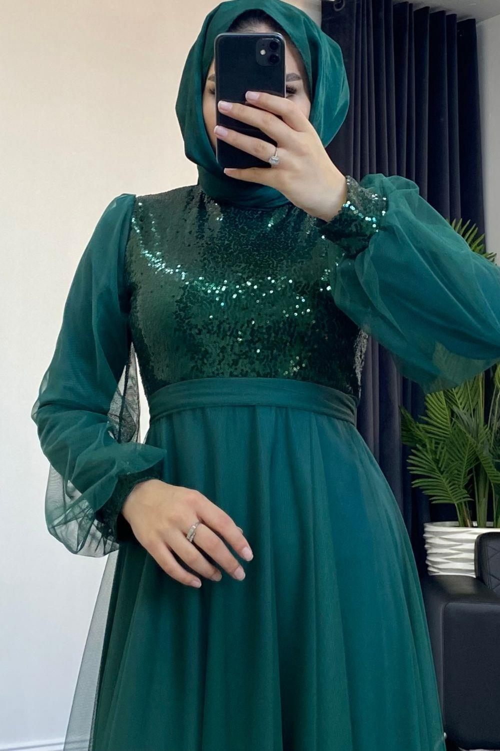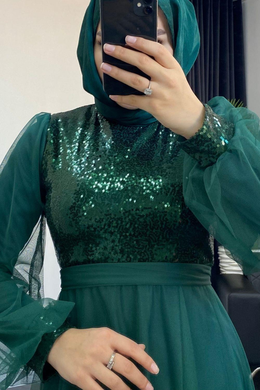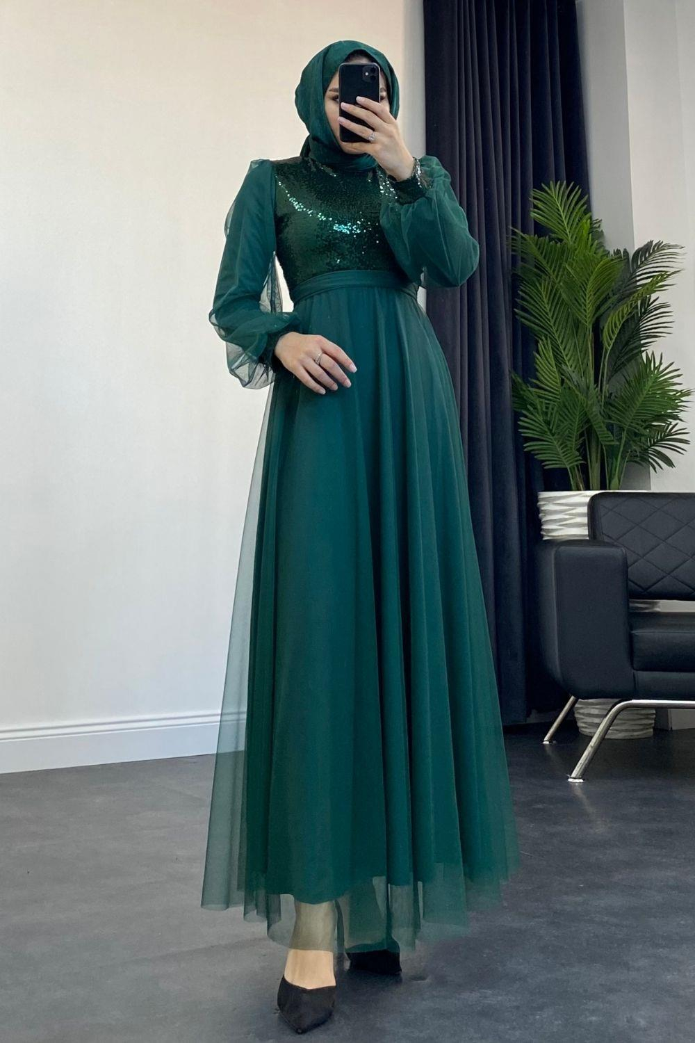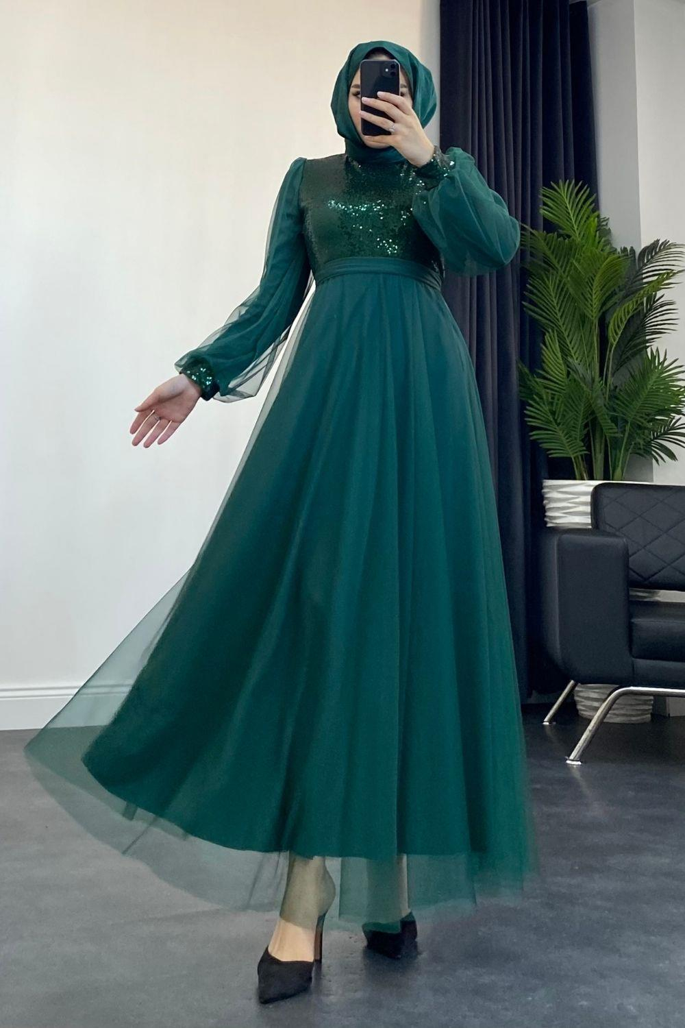 Yakamoz Tül Payet Abiye Zümrüt