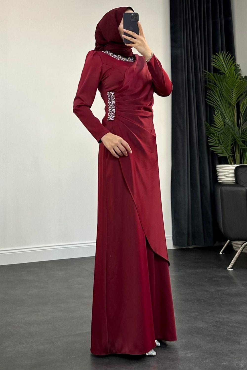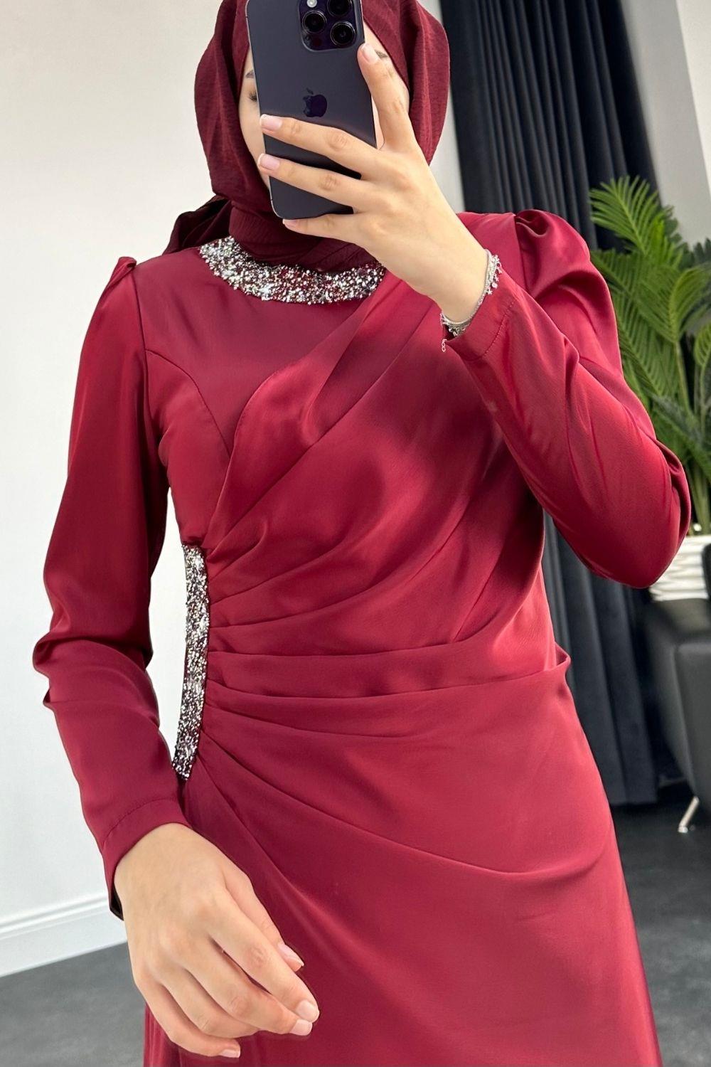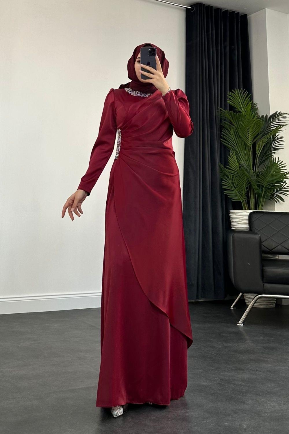 Beli Ve Boynu İşlemeli Saten Abiye Bordo