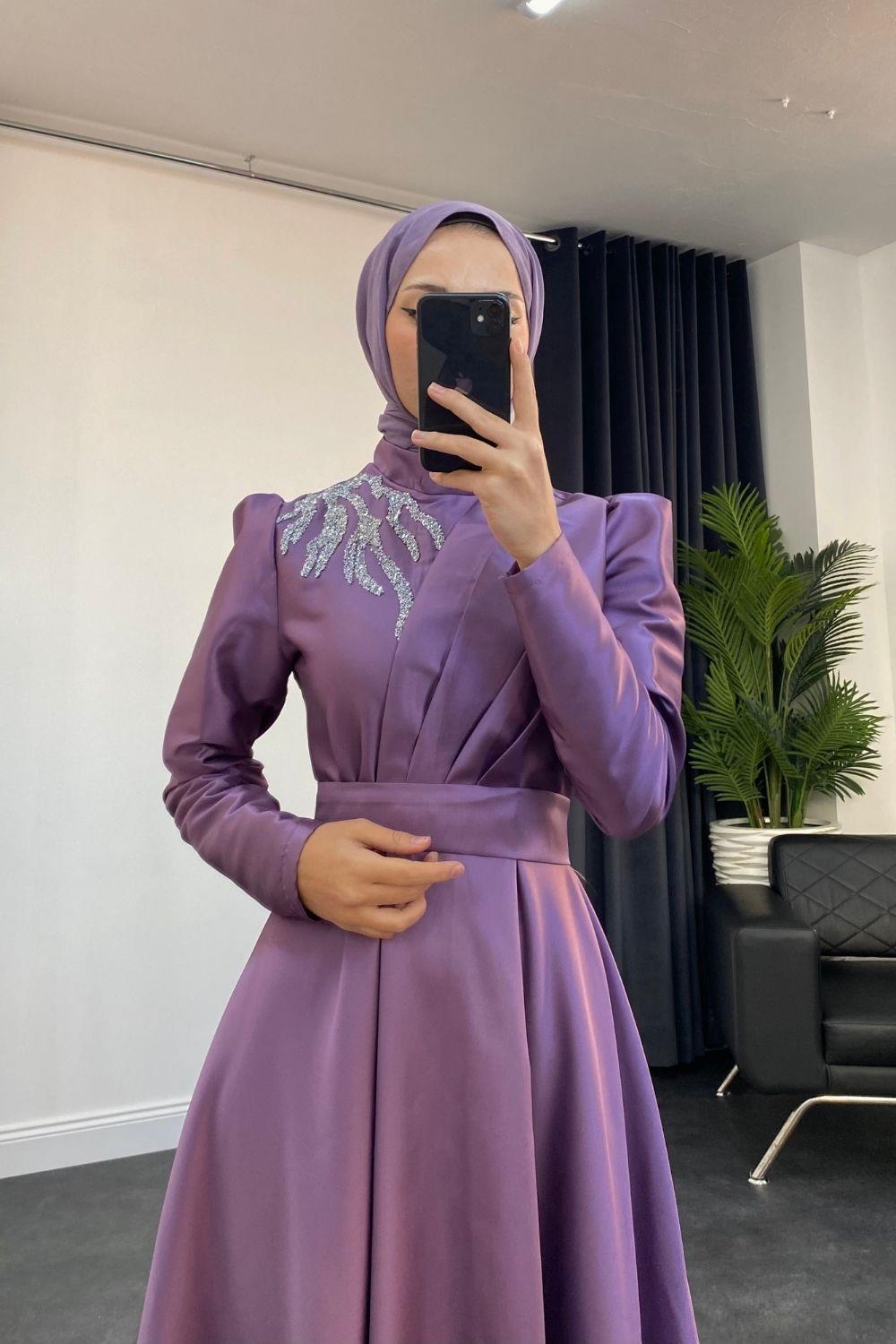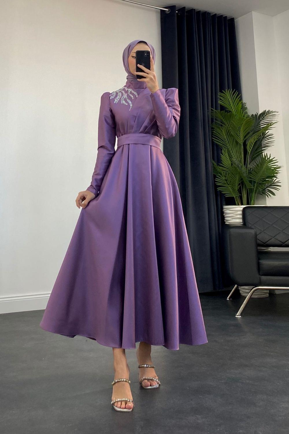 Tia Omzu Taşlı Abiye Tafta Abiye Lila