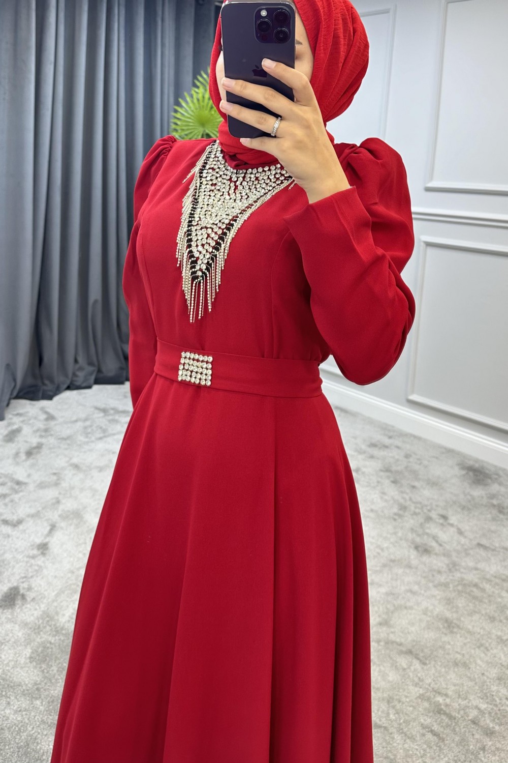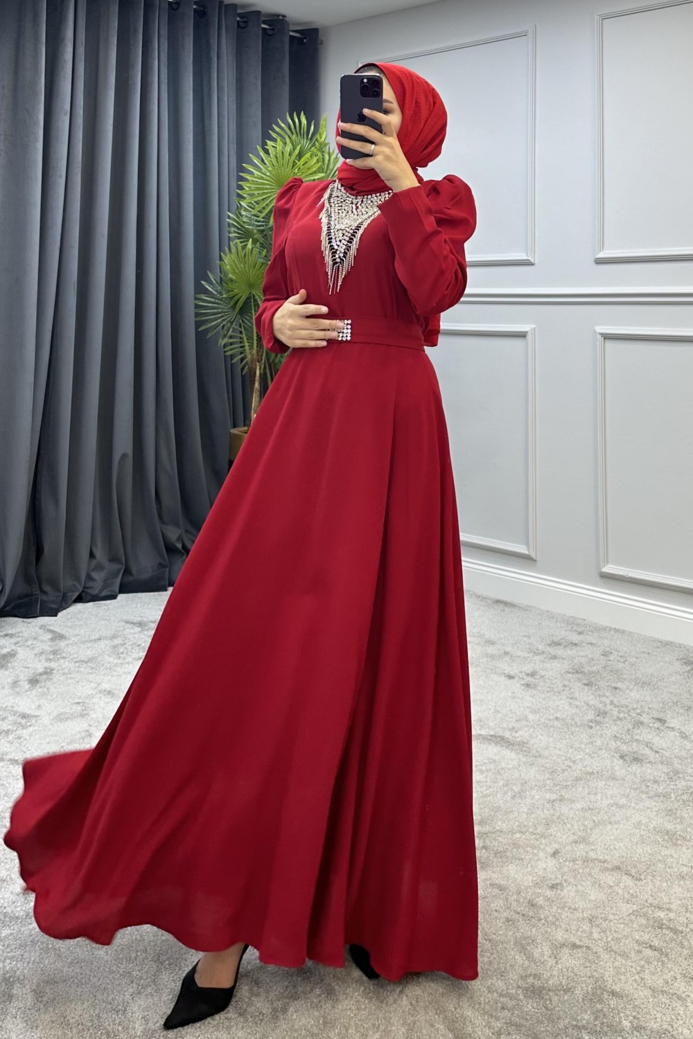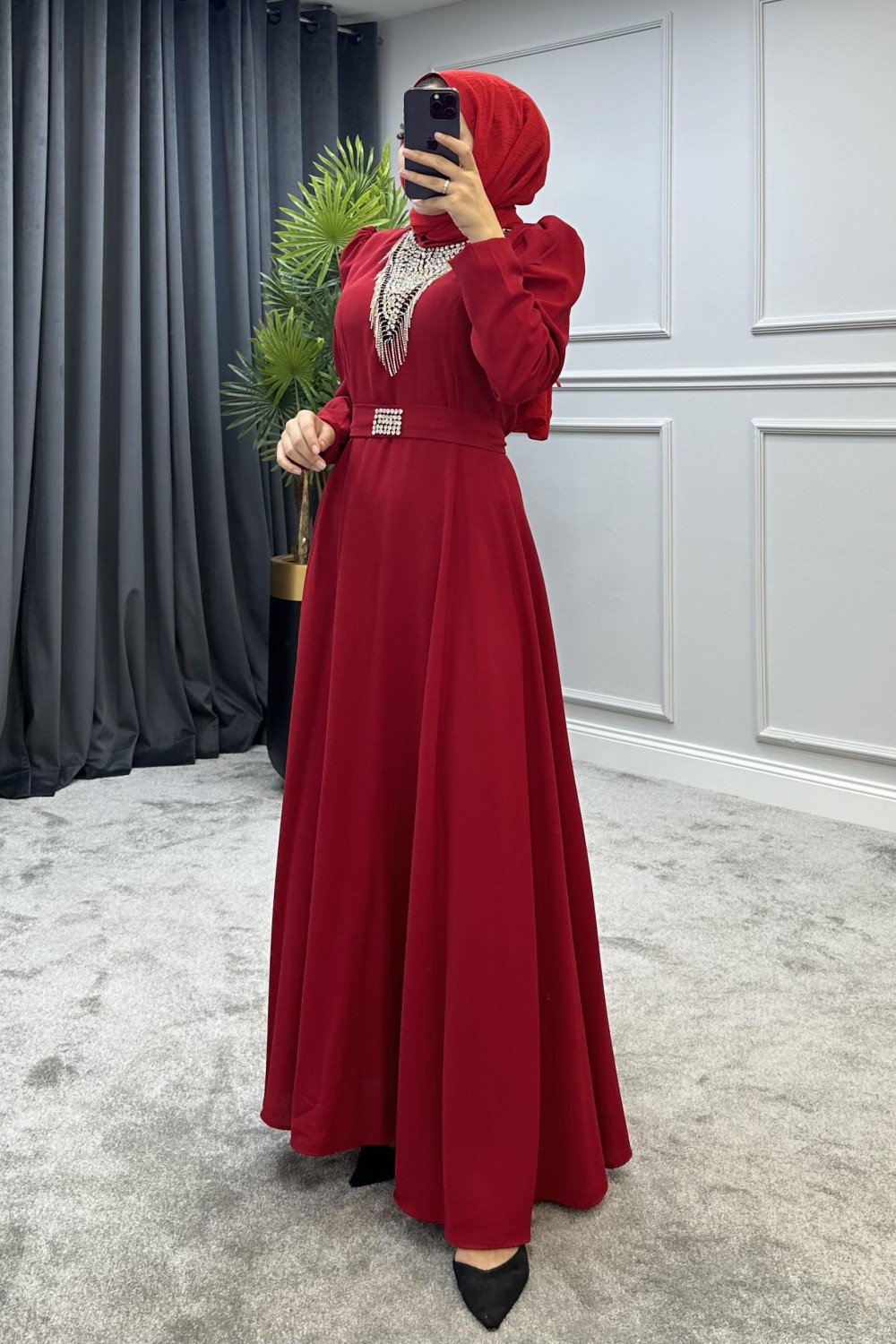 Göğsü Ve Kemeri Taşlı Abiye Bordo