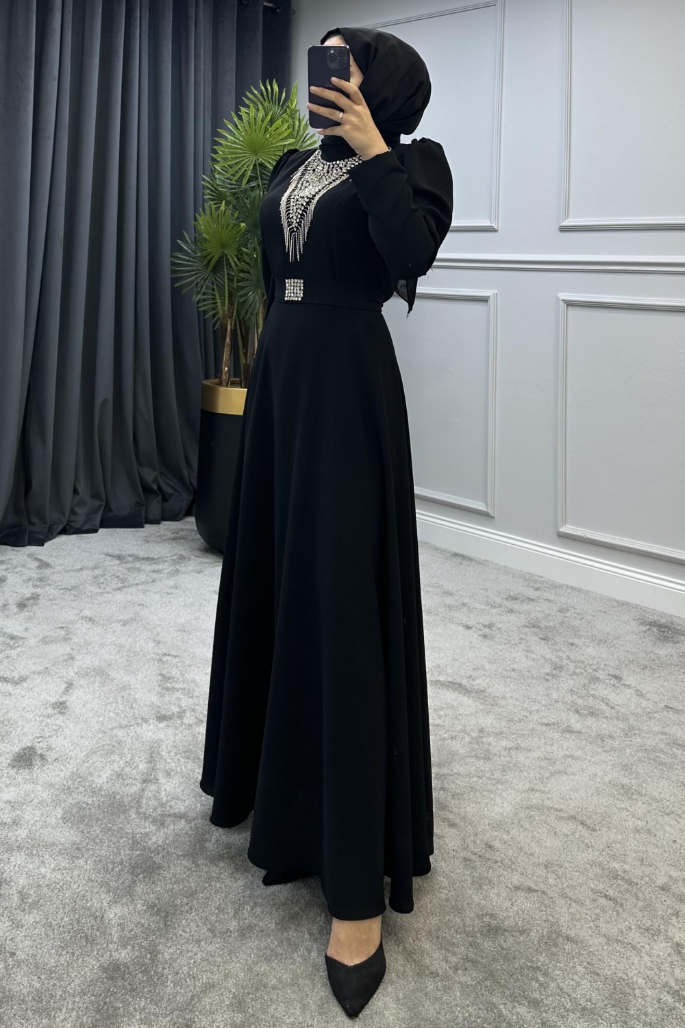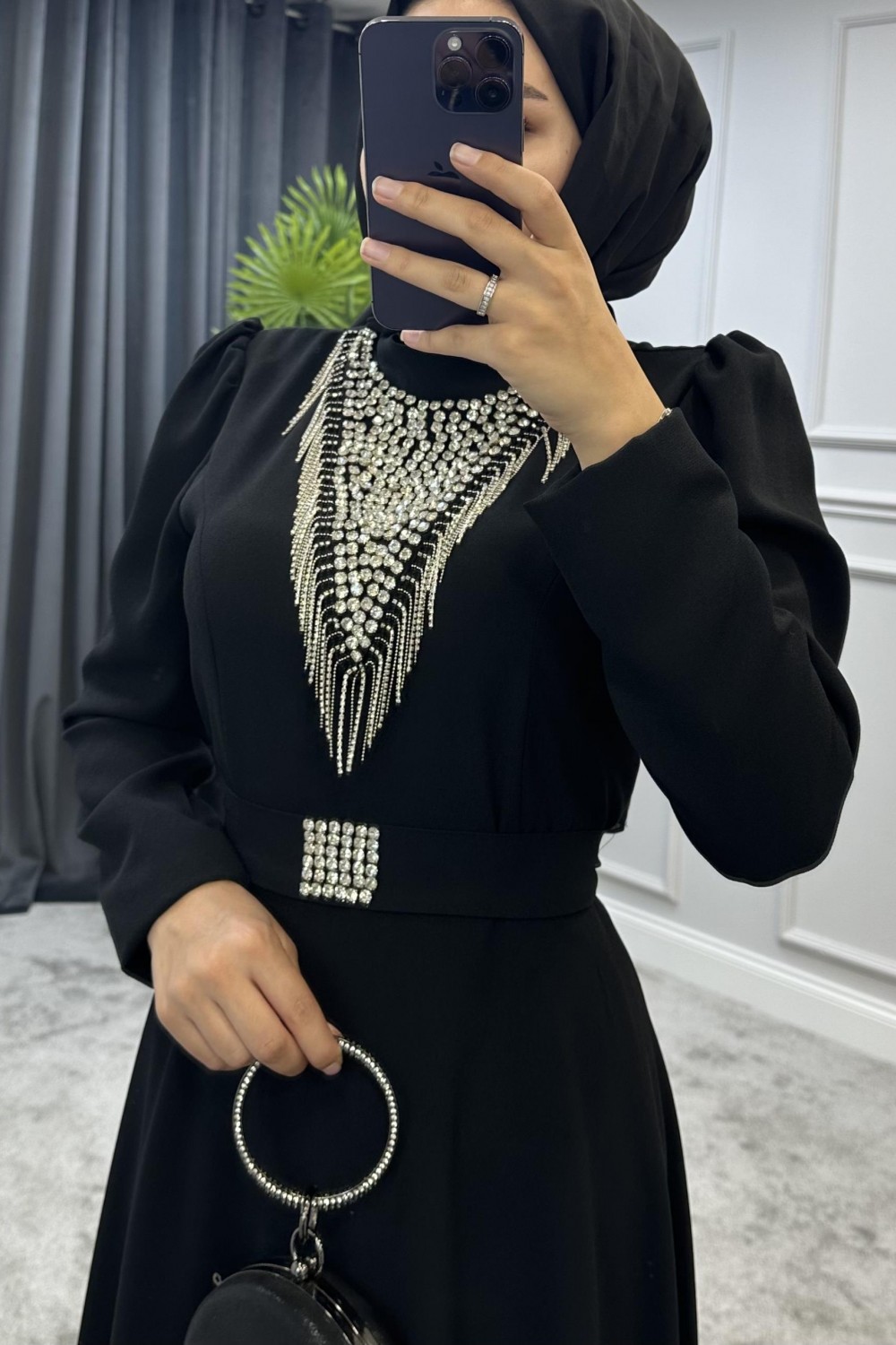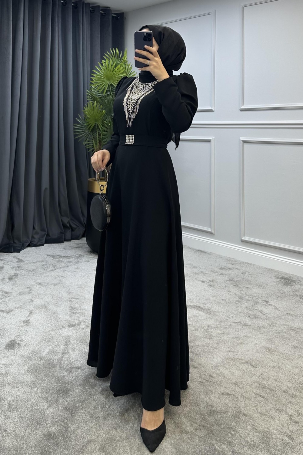 Göğsü Ve Kemeri Taşlı Abiye Siyah