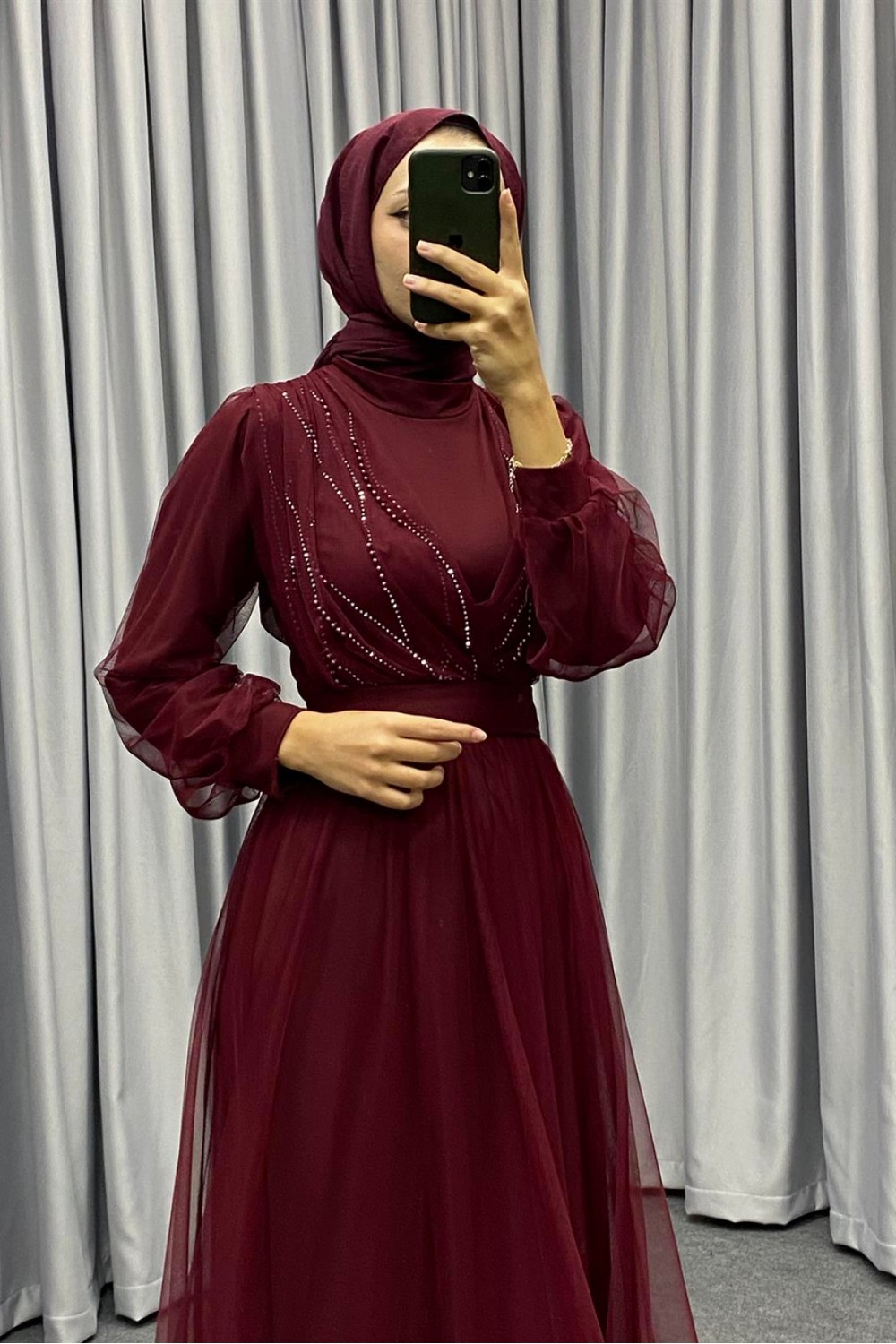 Helena Önü Taşlı Abiye Bordo