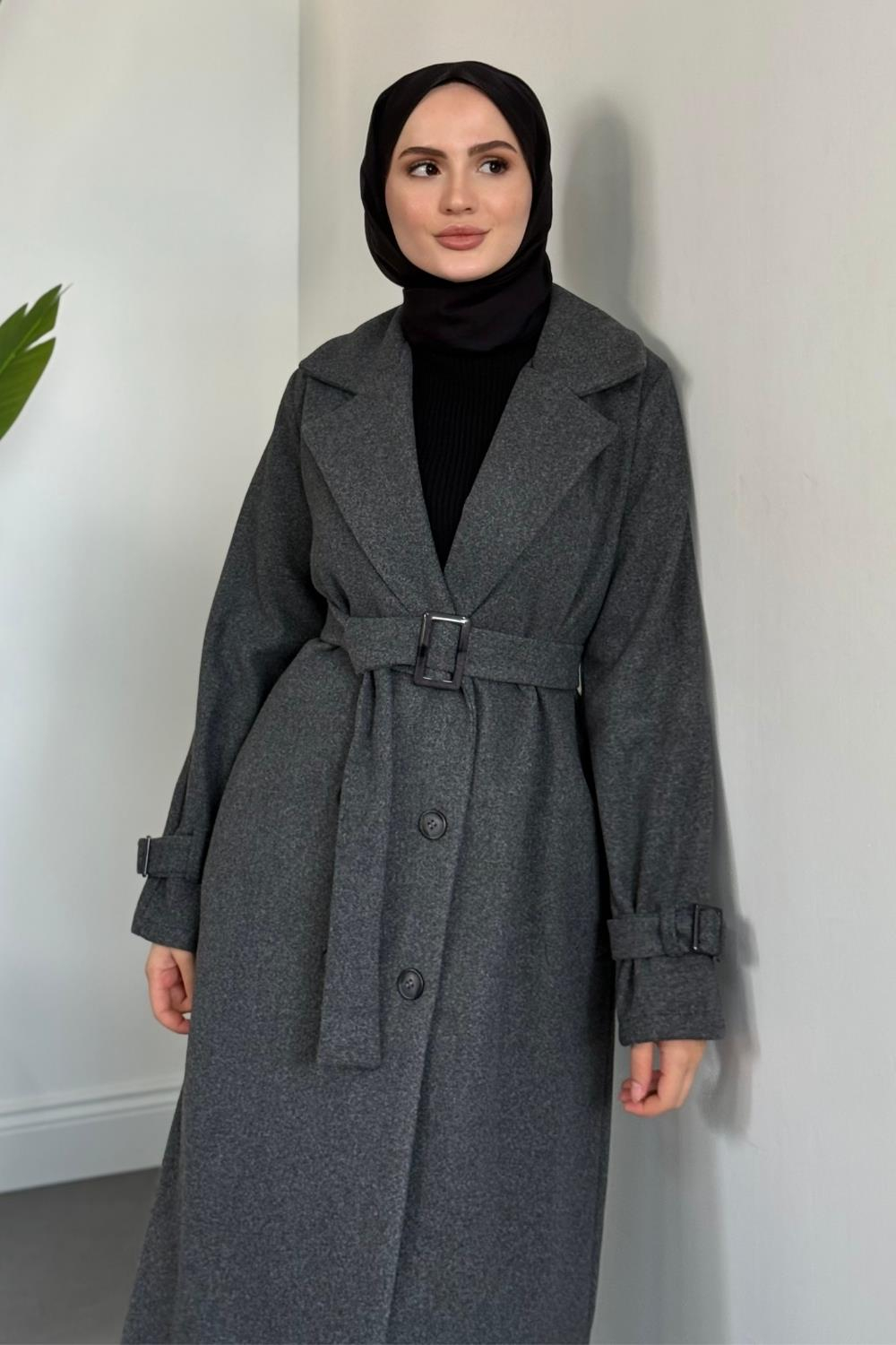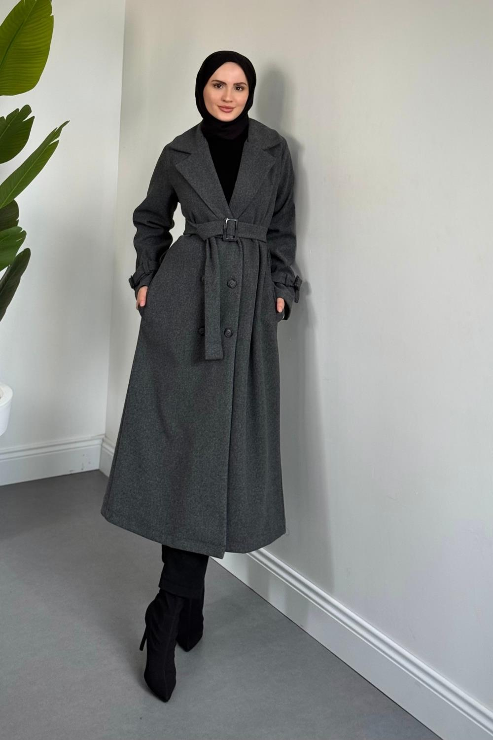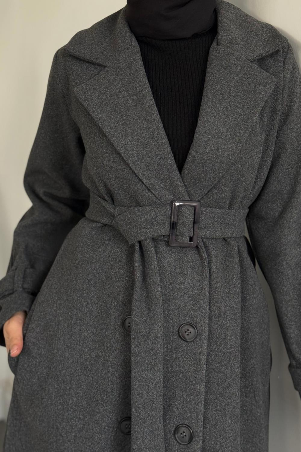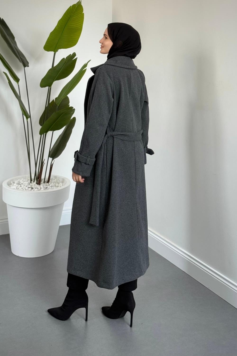 Eliane Astarlı Kemerli Kaşe Kaban Füme