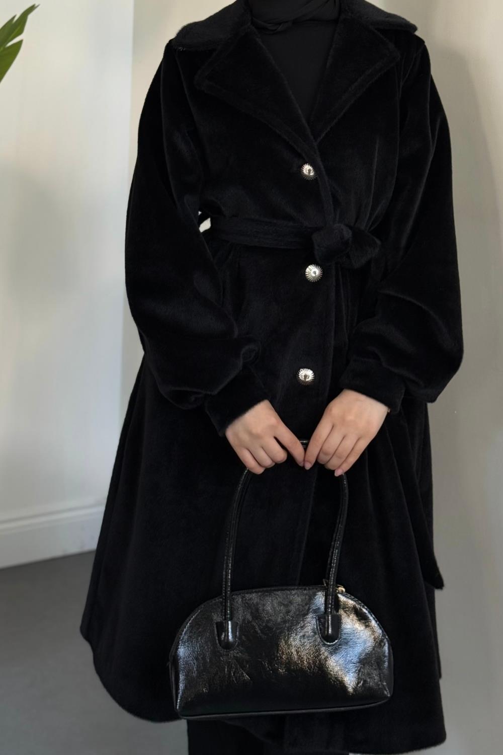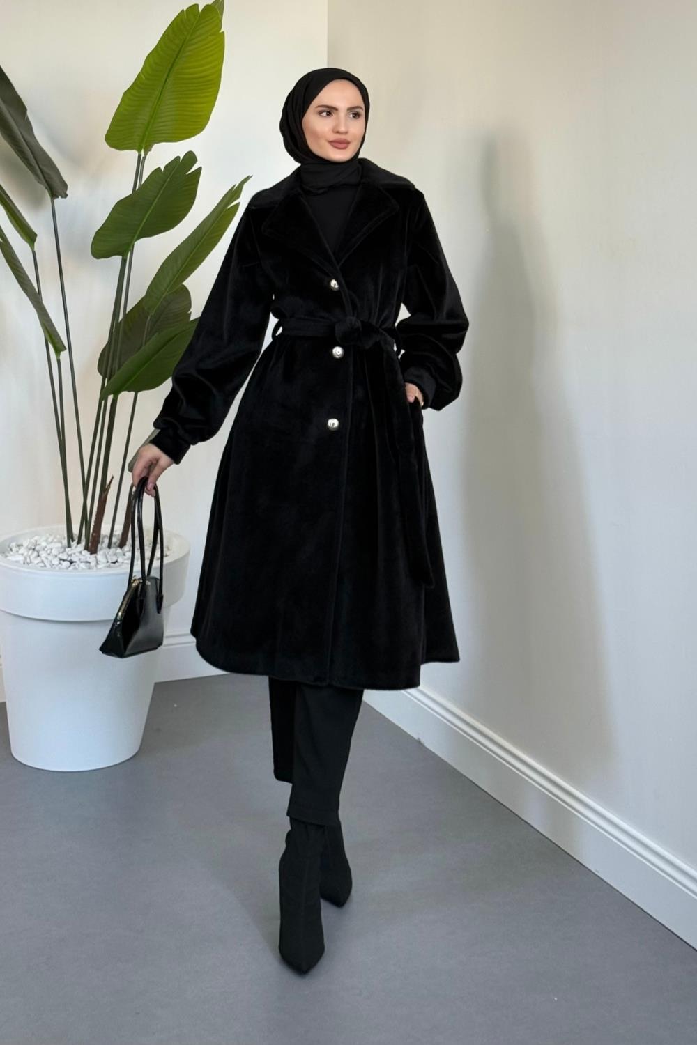 Marvil Astarlı Kuşaklı Kaşmir Kumaş Kaban Siyah