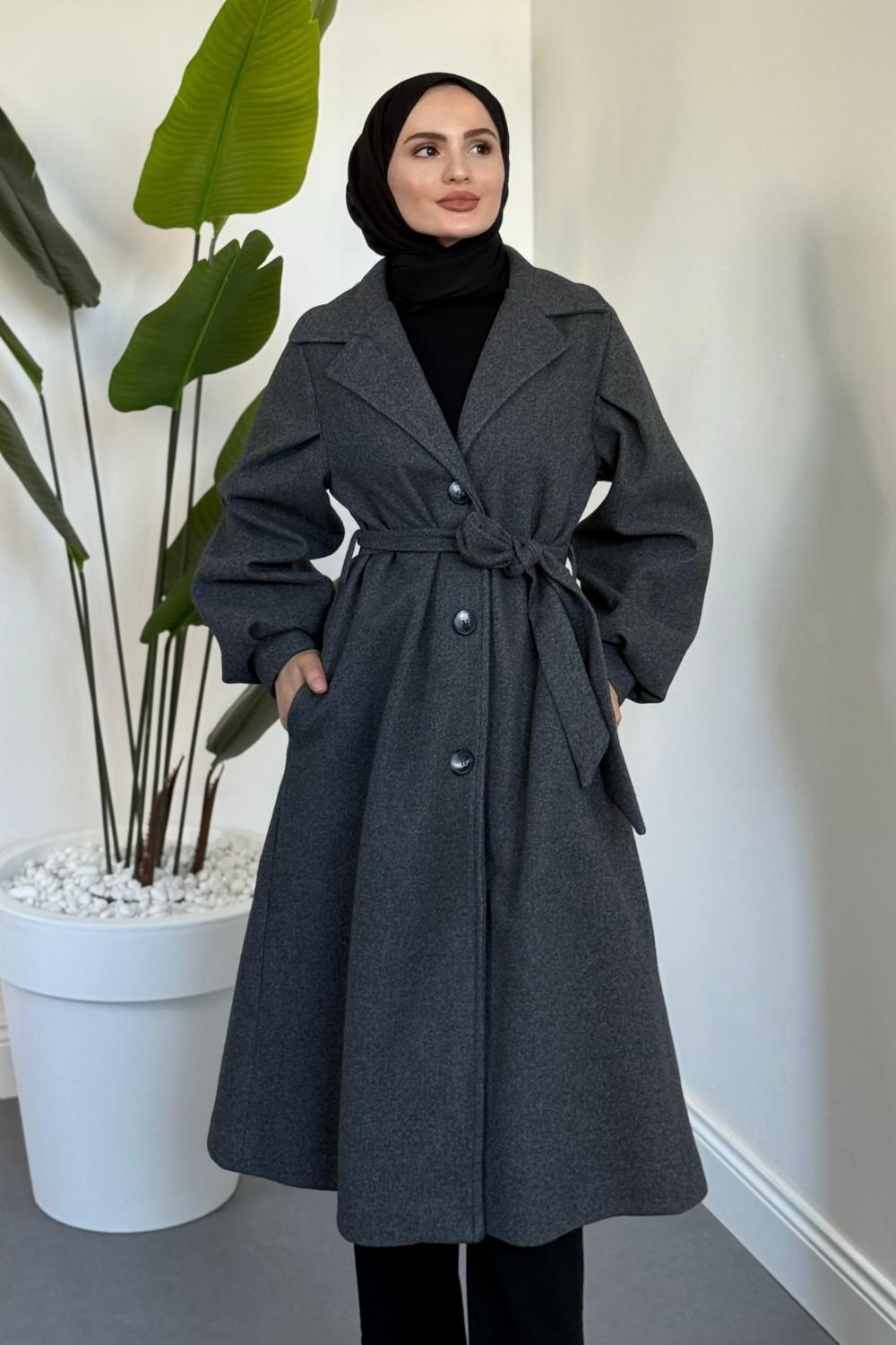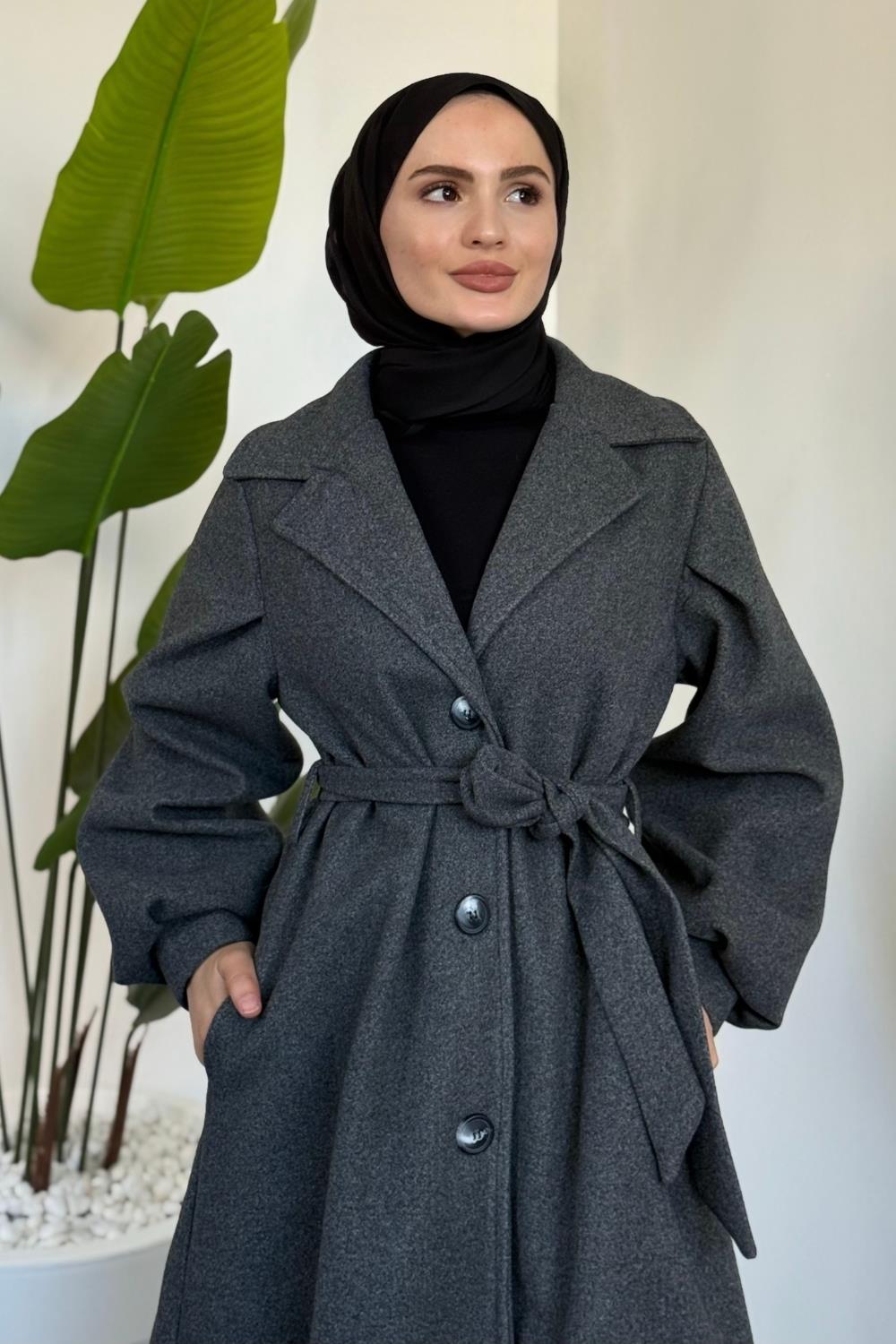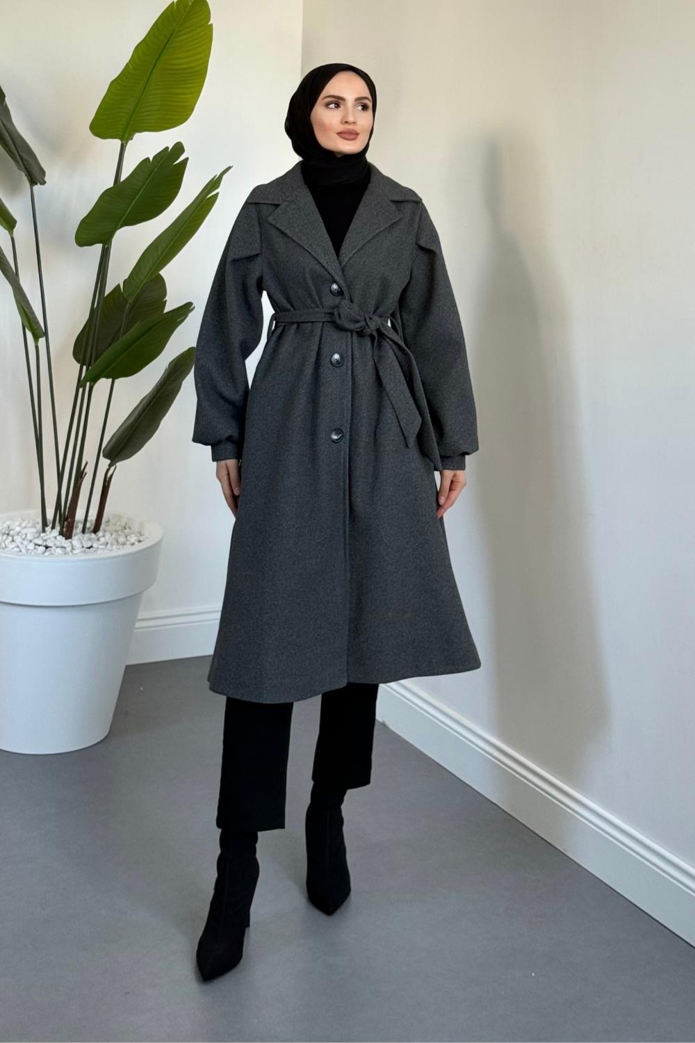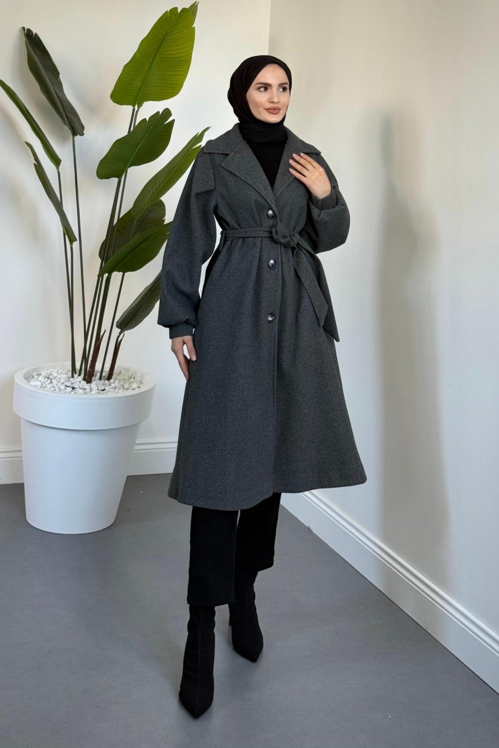 Velura Kuşaklı Astarlı Kaşe Kaban Füme